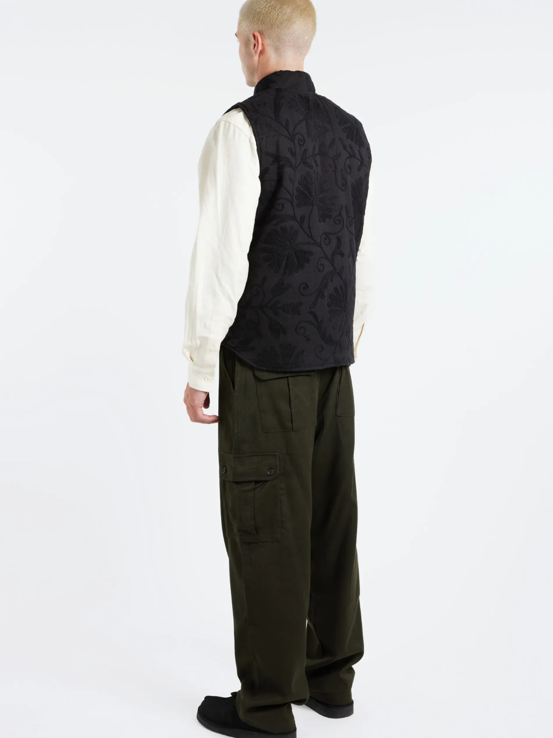 Wool embroidery in a technique inspired by vintage suzani embroideries on a cotton herringbone fabric. It comes in a medium weight with a warm touch and is responsibly dyed.