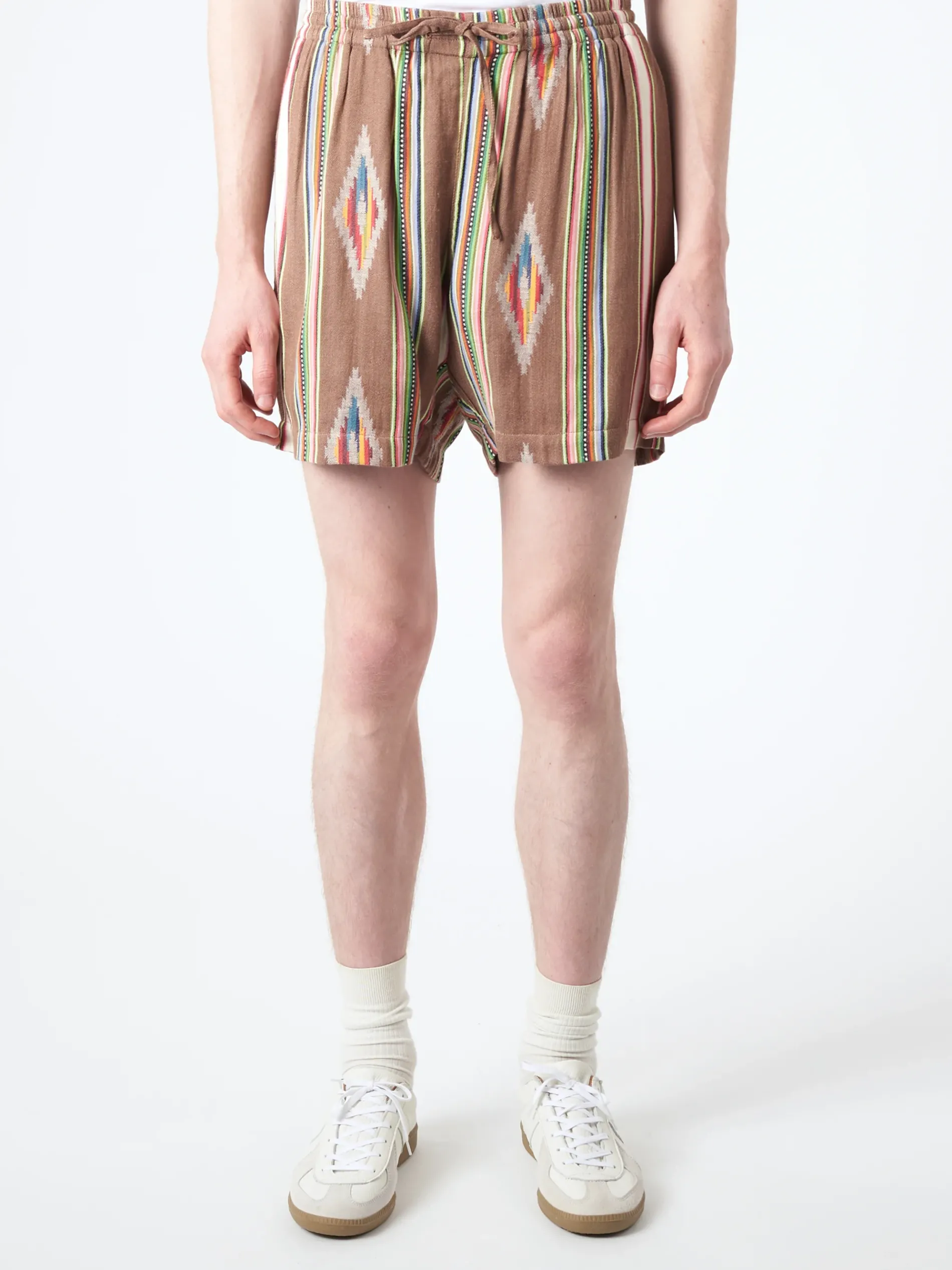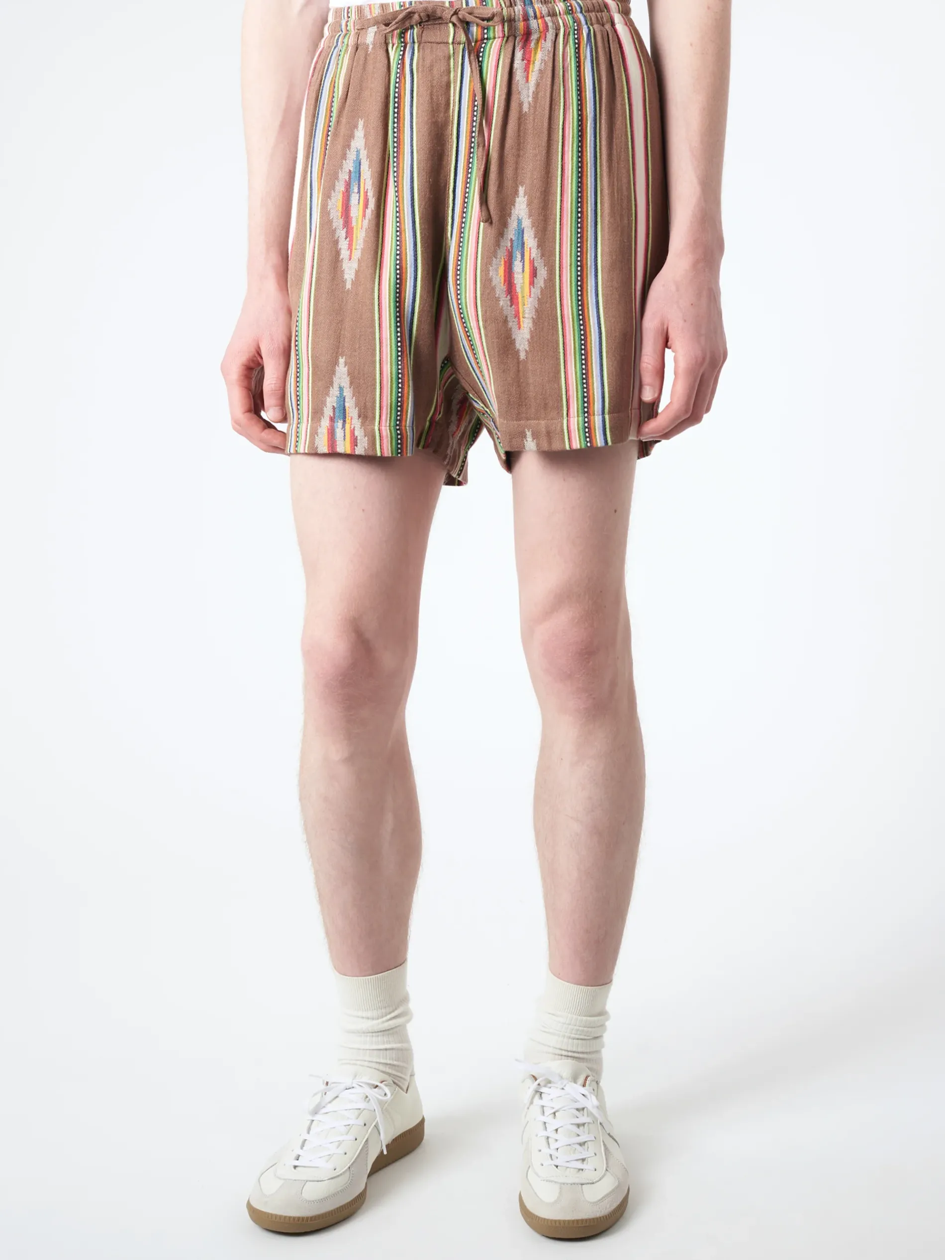 Elastic waist pull-on short shorts. Jacquard weaving involves adding extra yarn in the warp or weft to add extra surface in the fabric to create patterns in the weave that have raised texture. Made by one tailor from beginning to end.