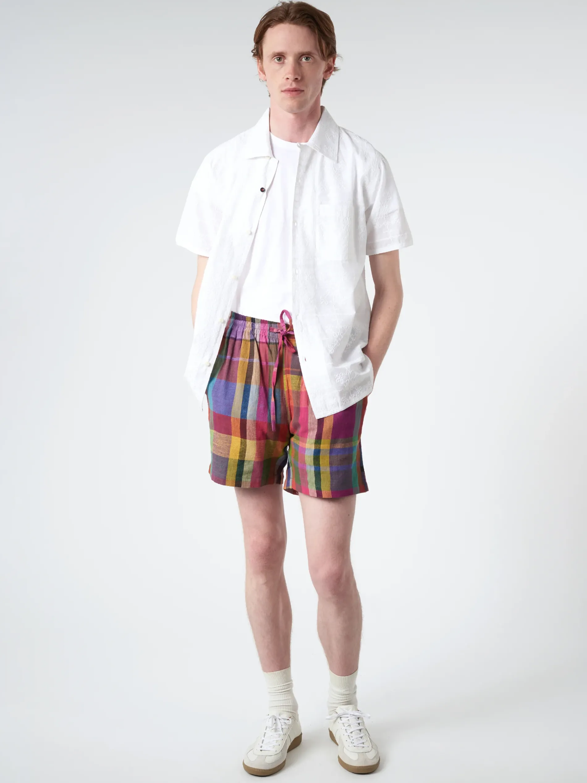 Elastic waist pull-on short shorts. The fabric used in this garment was woven on a handloom by a master fabric weaver often using natural dyed yarns. Made by one tailor from beginning to end.