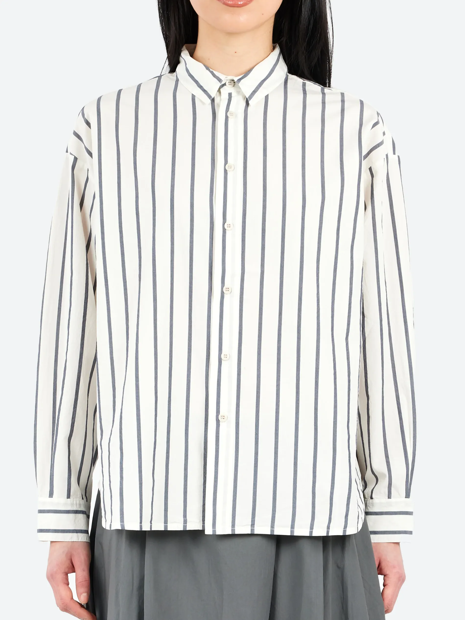 The Labo.Art Eolia Shirt is a classic button-up long-sleeve shirt, featuring shirring at the back yoke for a subtle, feminine touch. The shirt is designed in vertically striped woven cotton crepe, over-dyed for a unique, rich color. This iconic piece combines timeless style with modern details, making it a versatile addition to any wardrobe.