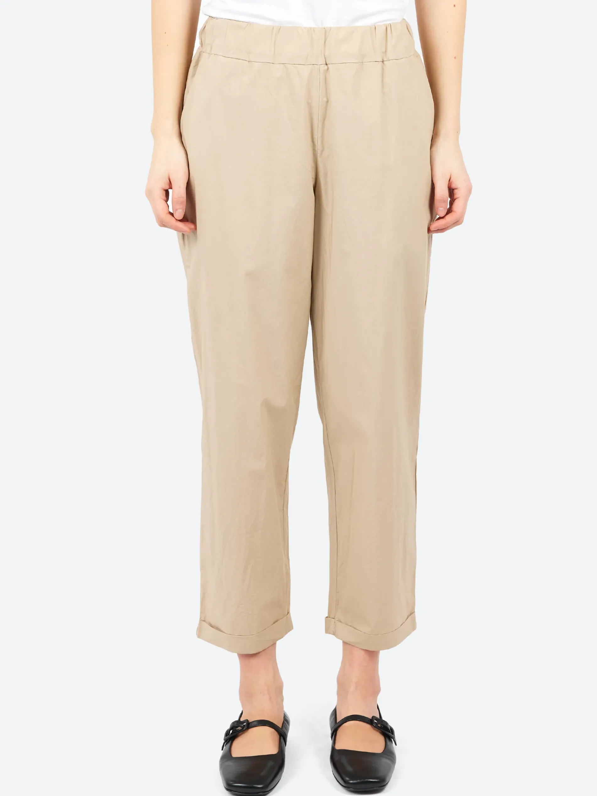 Labo.Art carrot cut pants with stretch waistband, cuffs and side pockets.