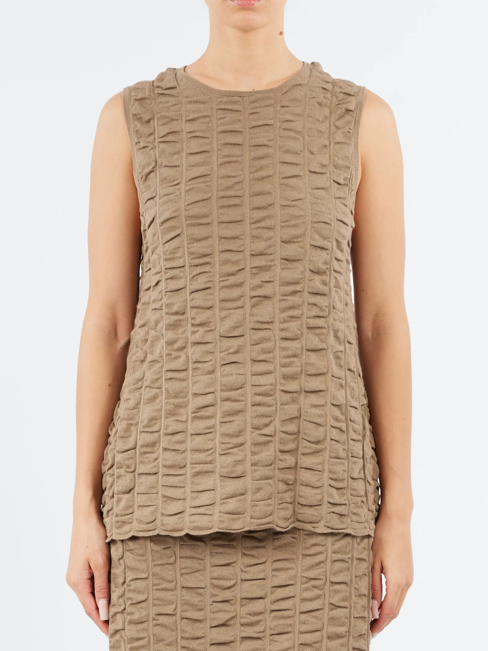 The Ruche Shell by Lauren Manoogian is a refined, hand-loomed knit top crafted in Peru from Pima cotton. This sleeveless piece features a dimensional stitch pattern offering both texture and subtle structure. Designed with a relaxed fit, it serves as a versatile layering piece or a standalone top for warmer weather.