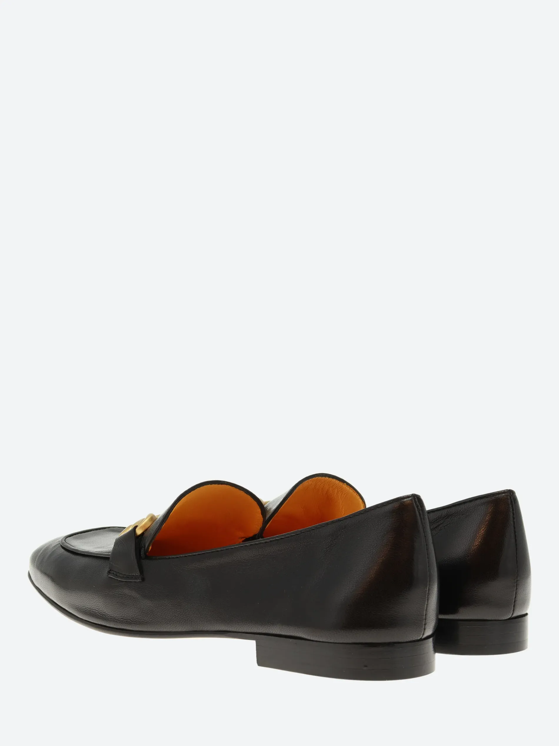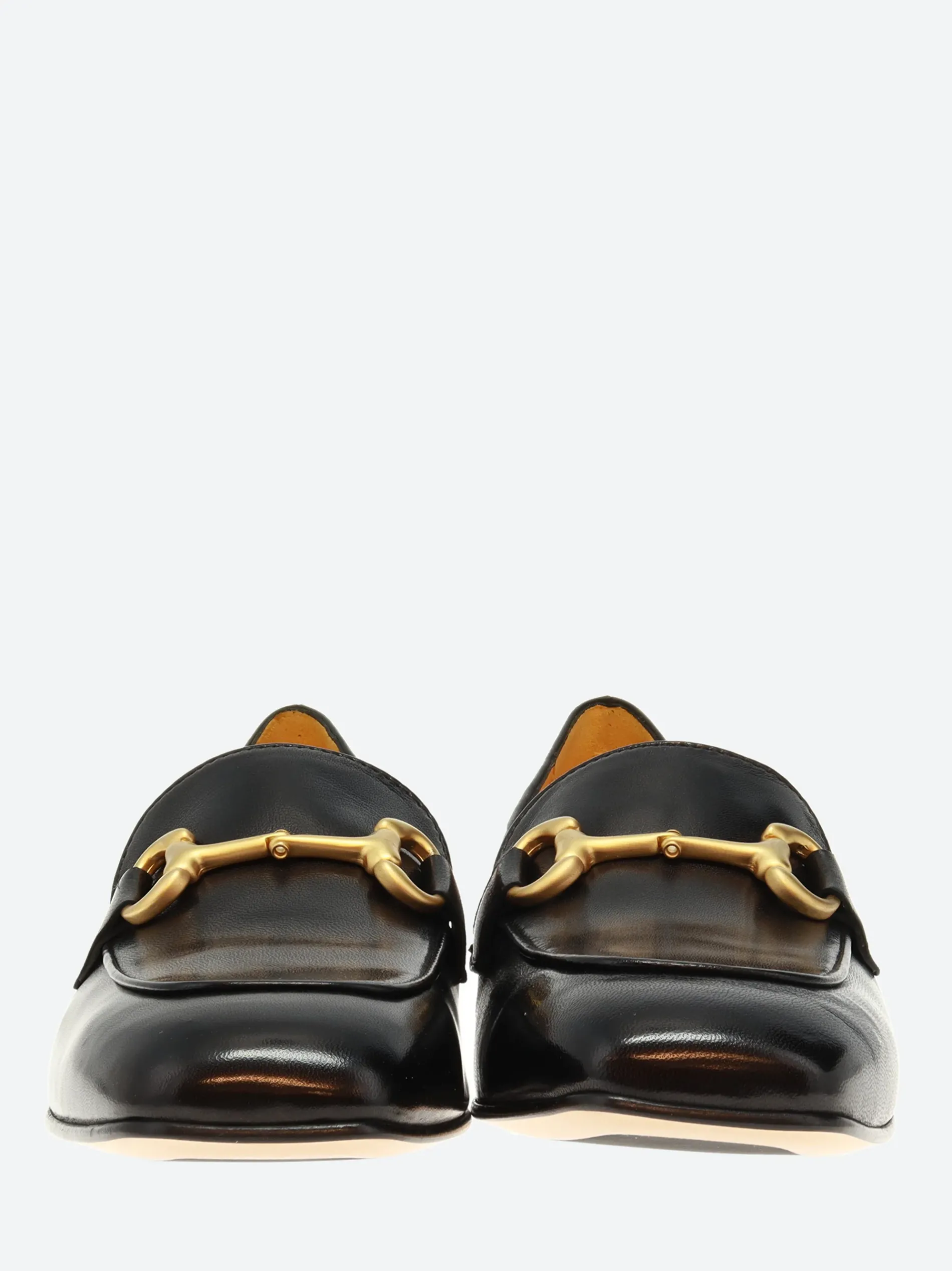 This contemporary loafer is made of smooth leather, with elegant additions of a gold-tone horse bit and a square toe.