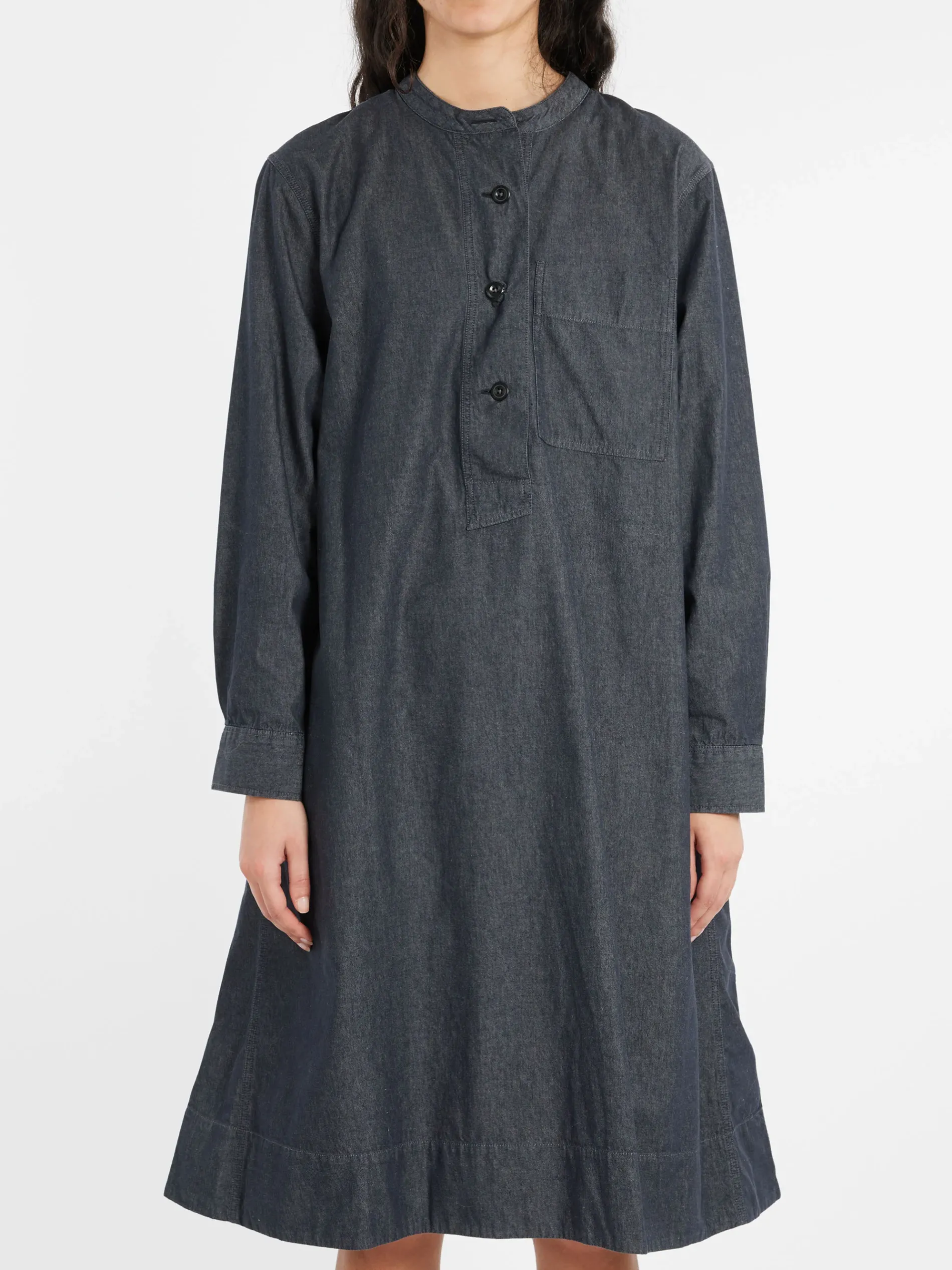 Margaret Howell collarless swing dress in a regular cut. Fabricated in Italian cotton chambray.