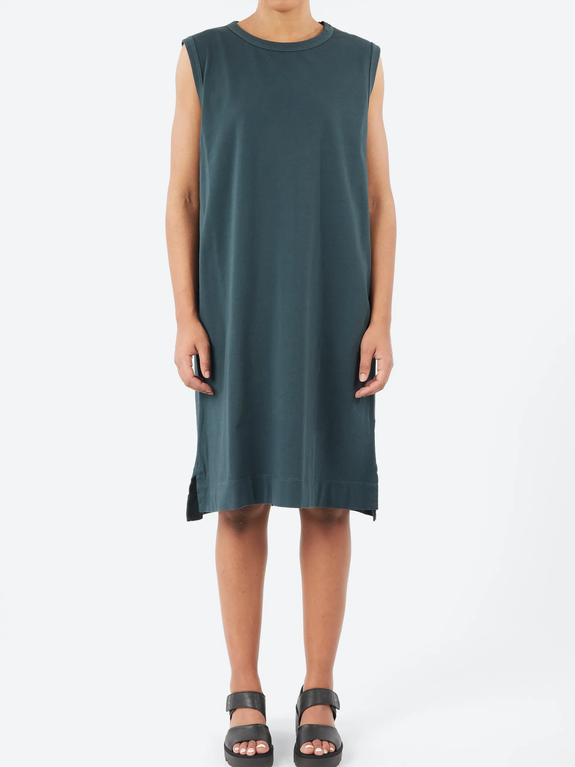 This Overhead Tank Dress reinterprets the ease and simplicity of the MHL. tank top in a longer silhouette. It has a regular, boxy cut and sits at knee length, and is fabricated in lightweight cotton jersey with a matt finish. The style features a back patch pocket and overlock stitch detailing on the side seams and hem.