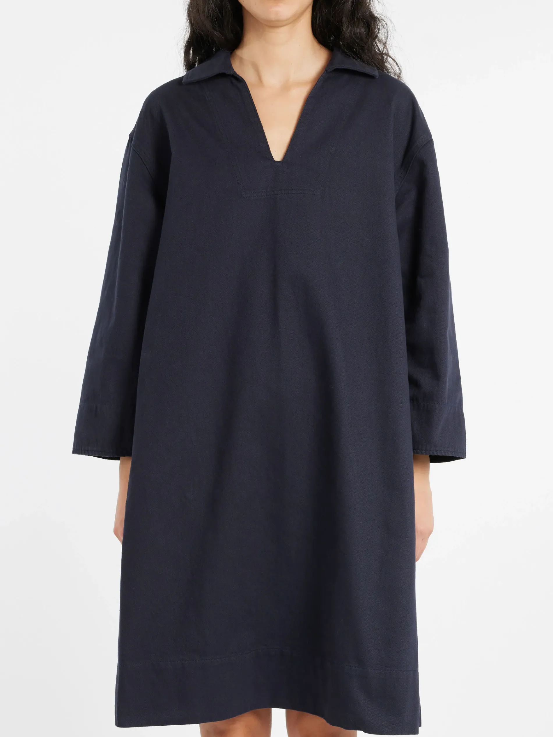 Margaret Howell cotton drill patch pocket smock dress with a relaxed cut. Fabricated in dense Italian cotton drill.