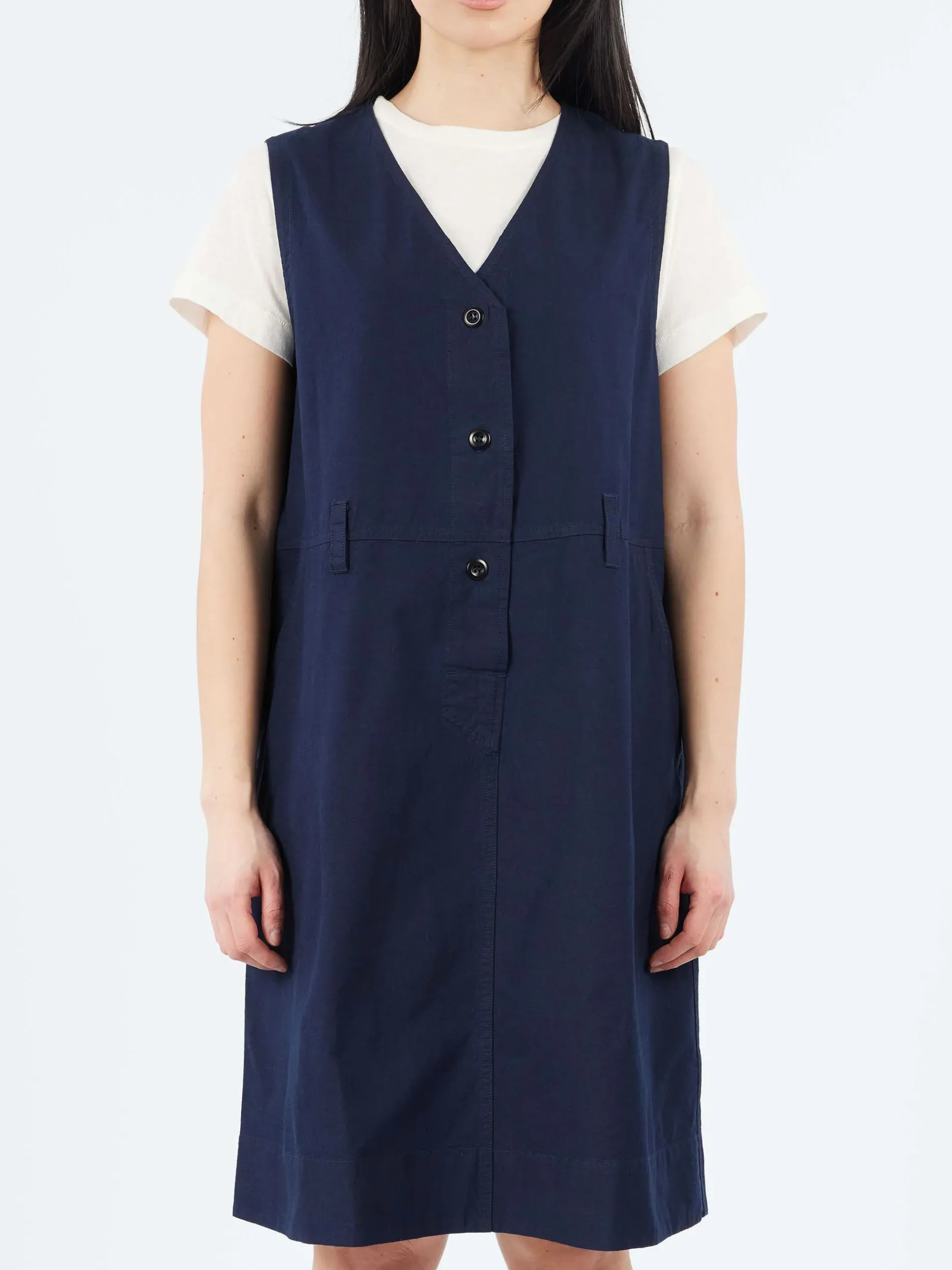 Informed by the silhouette of a workwear waistcoat, the MHL. Uniform Dress has a regular cut with a knee length, flared skirt and is fabricated in lightweight indigo dyed cotton plainweave with a soft hand feel. The stitch detail waistband is constructed with irregular belt loops and button tab adjusters, and the style features slant pockets with concealed ticket pockets and a button-through welt back pocket.