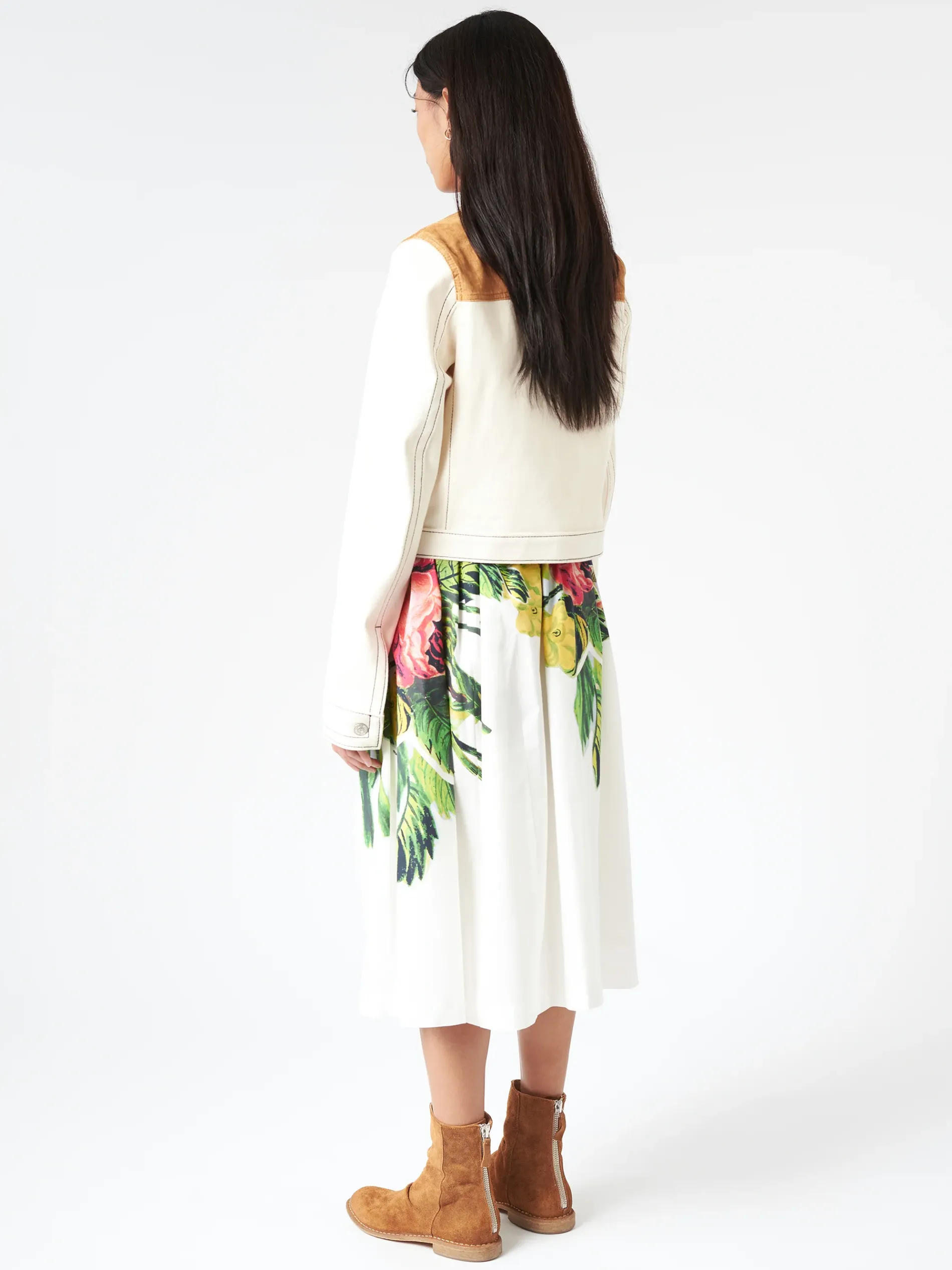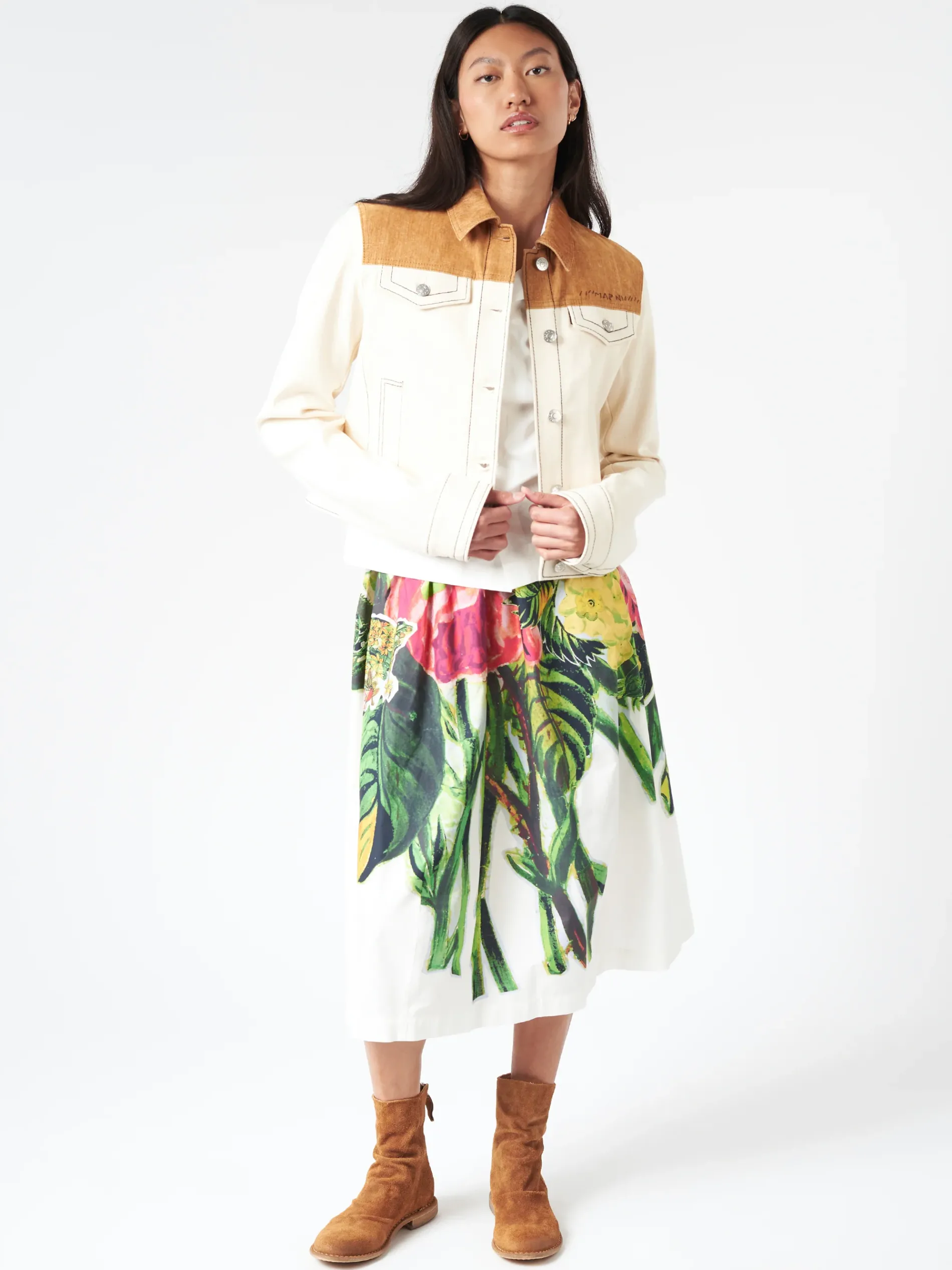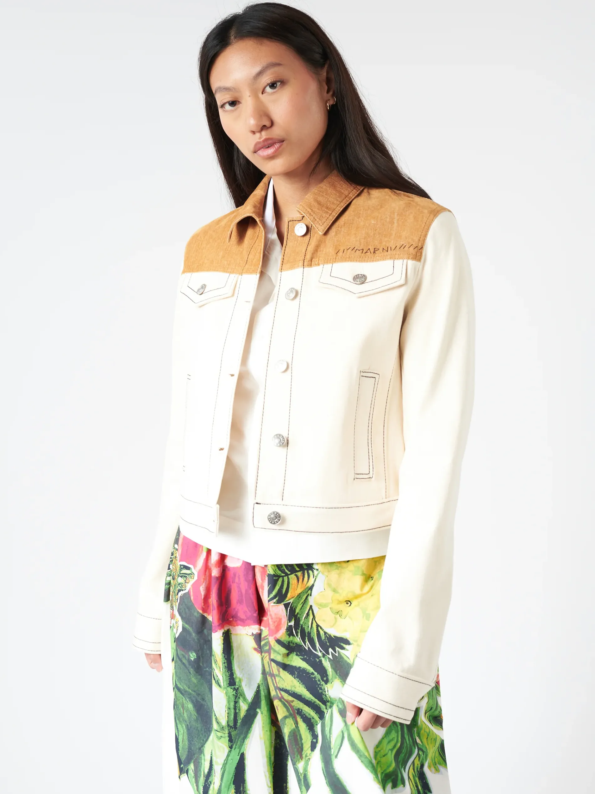 Marni’s denim trucker jacket with a contrasting dyed fabric yoke with hand-stitched logo and flower detail.