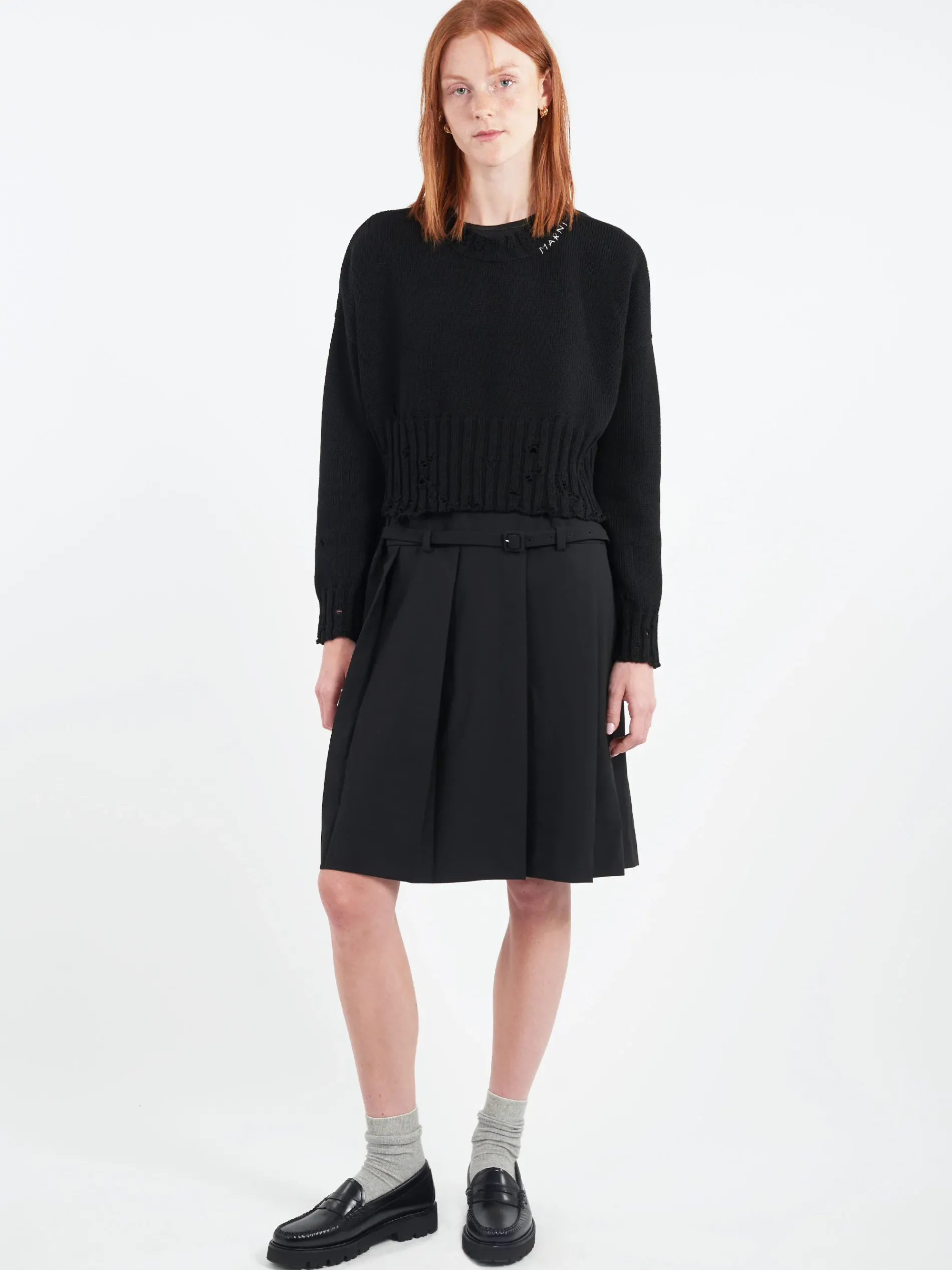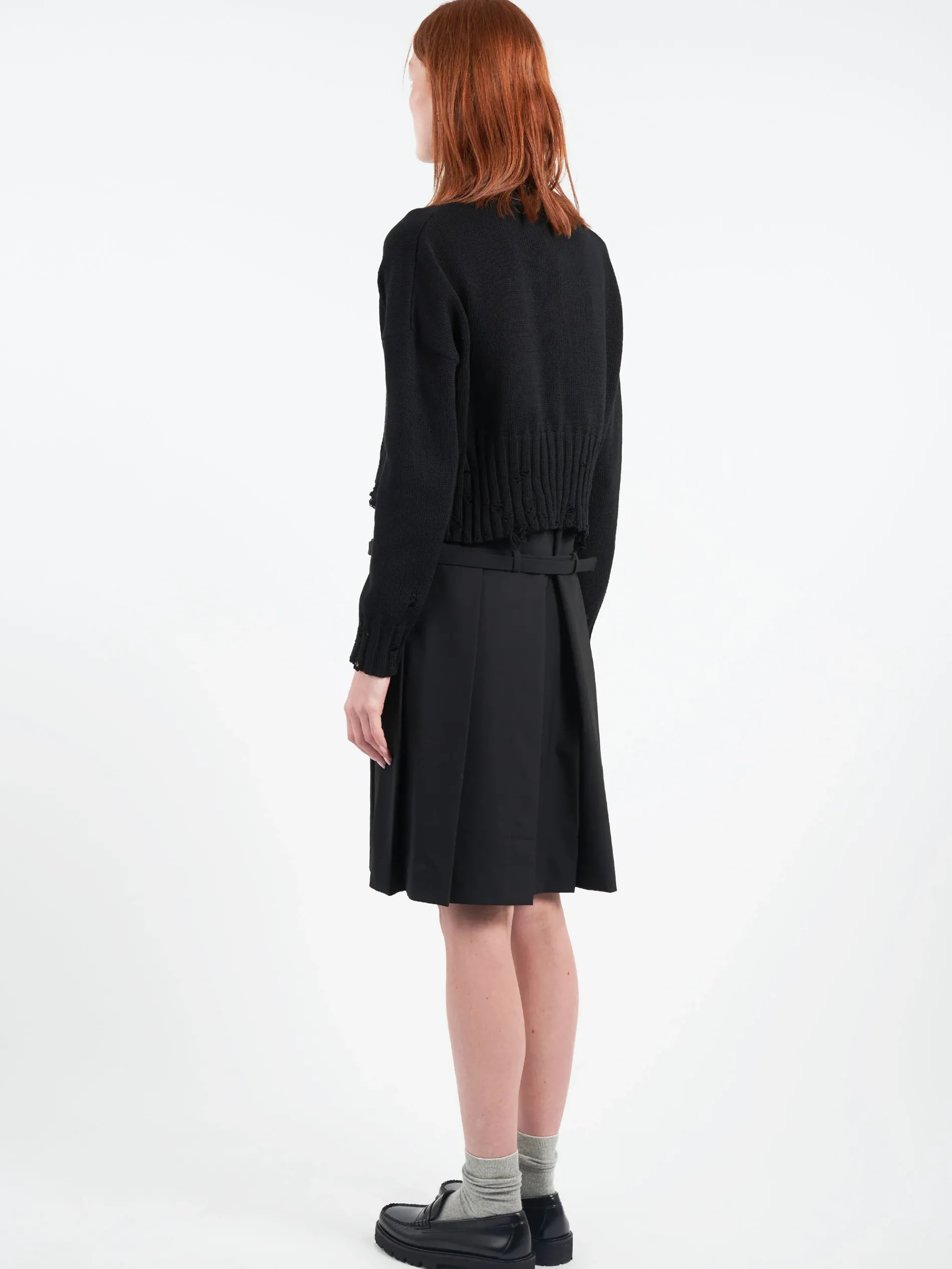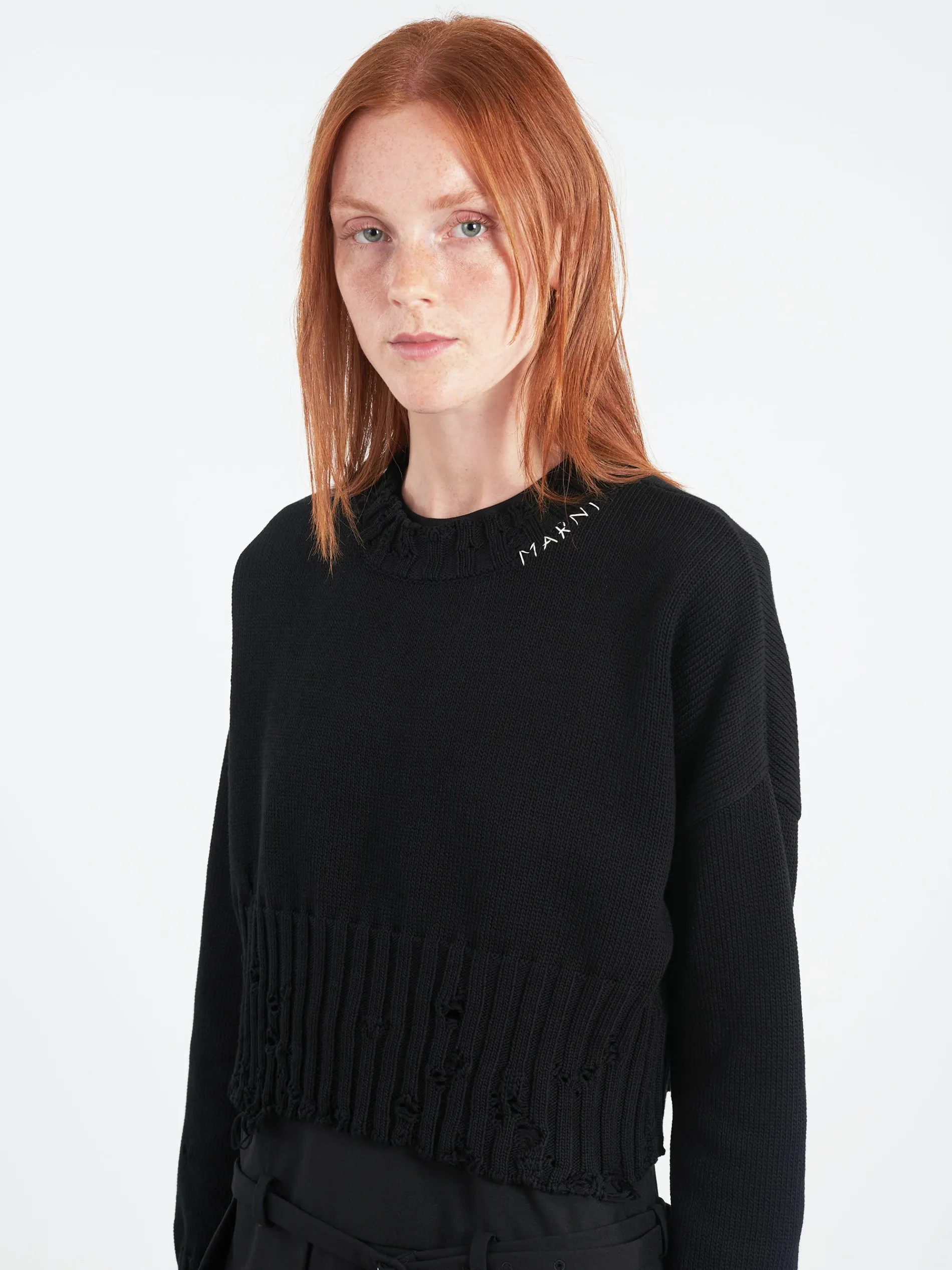 Cropped crew-neck jumper knitted from cotton. Wide ribbed trims with disheveled detailing.