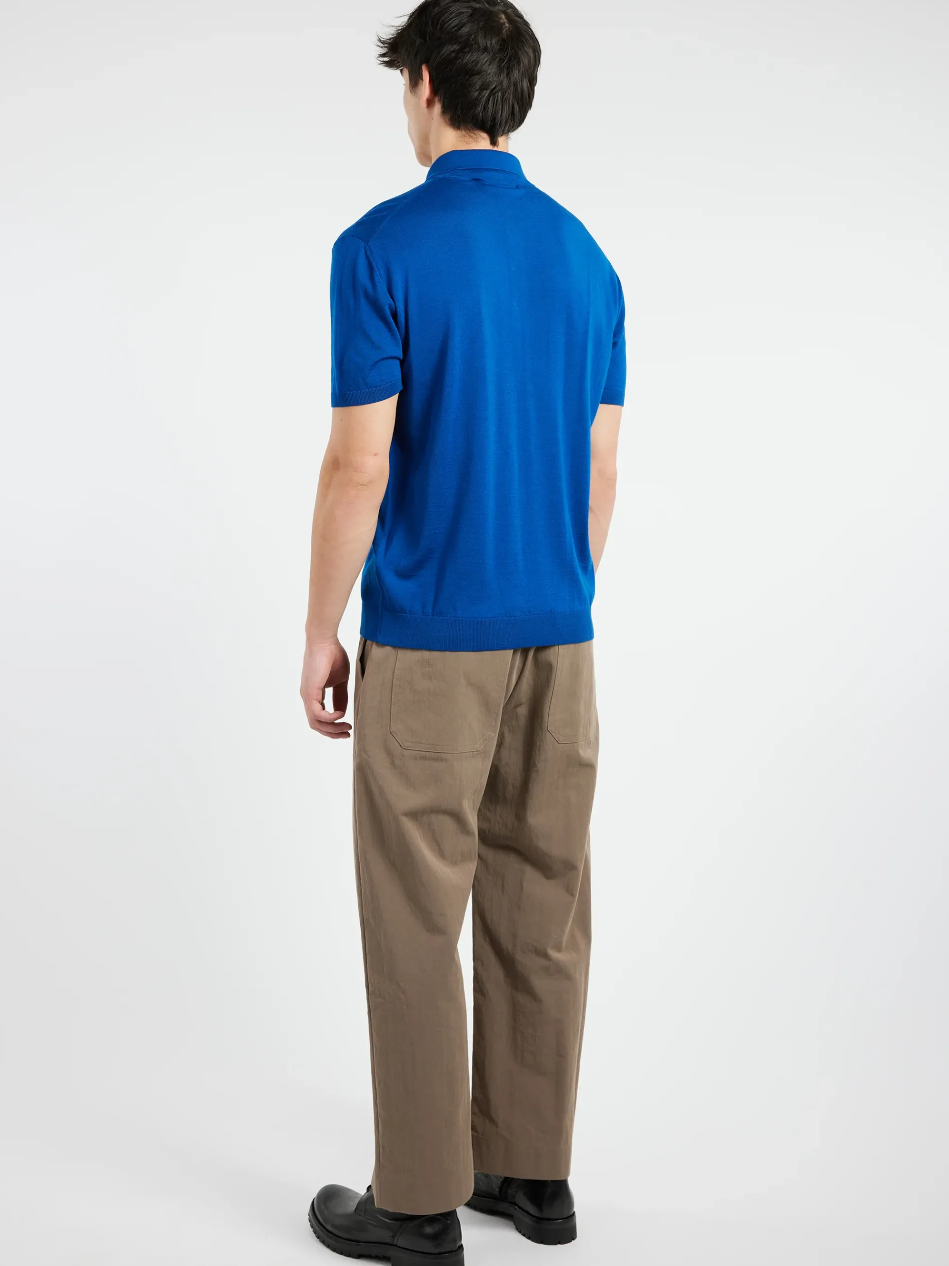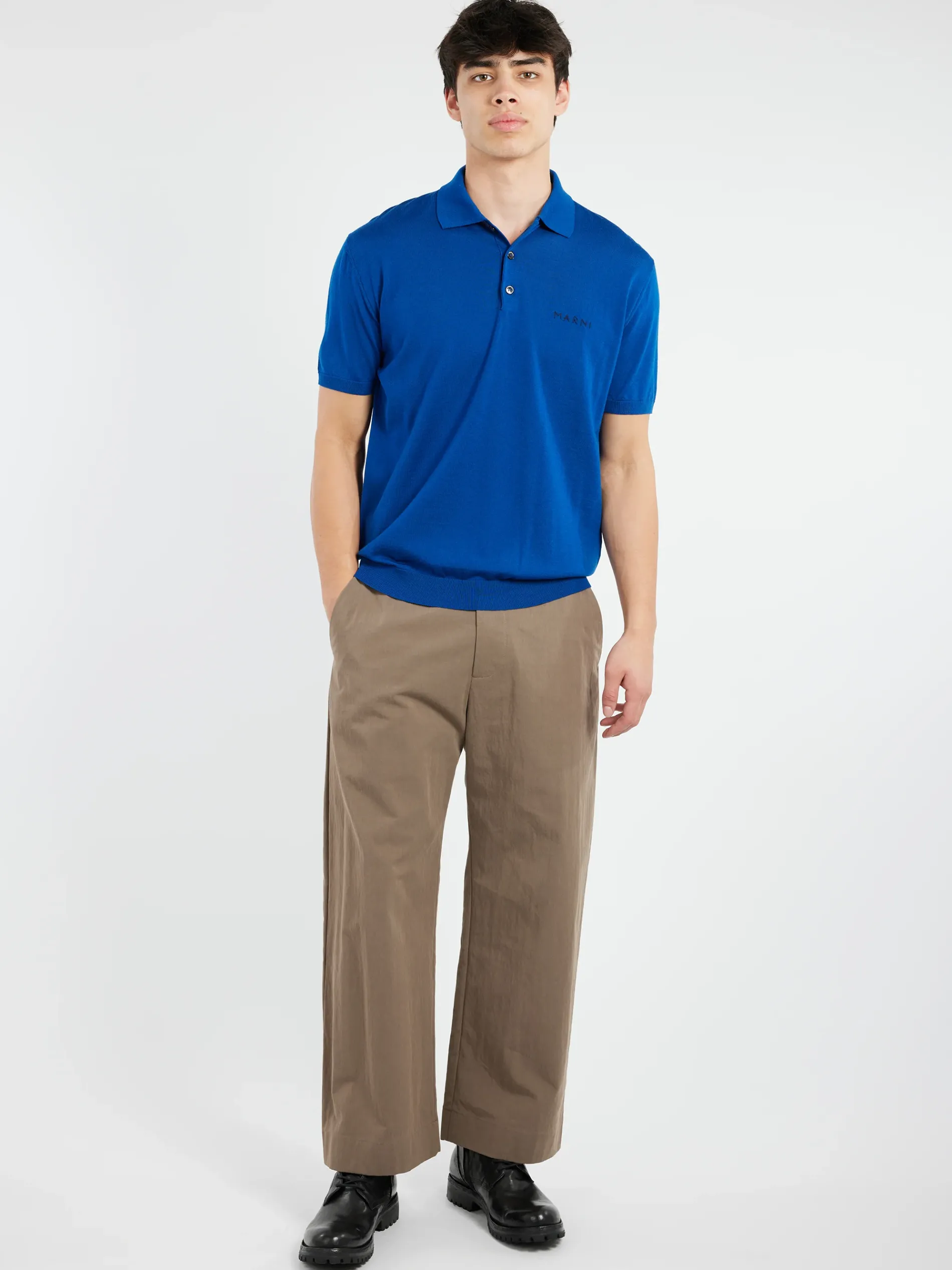 Short-sleeved polo shirt made from a lightweight wool knit. Hand-stitched Marni mending logo on the chest.