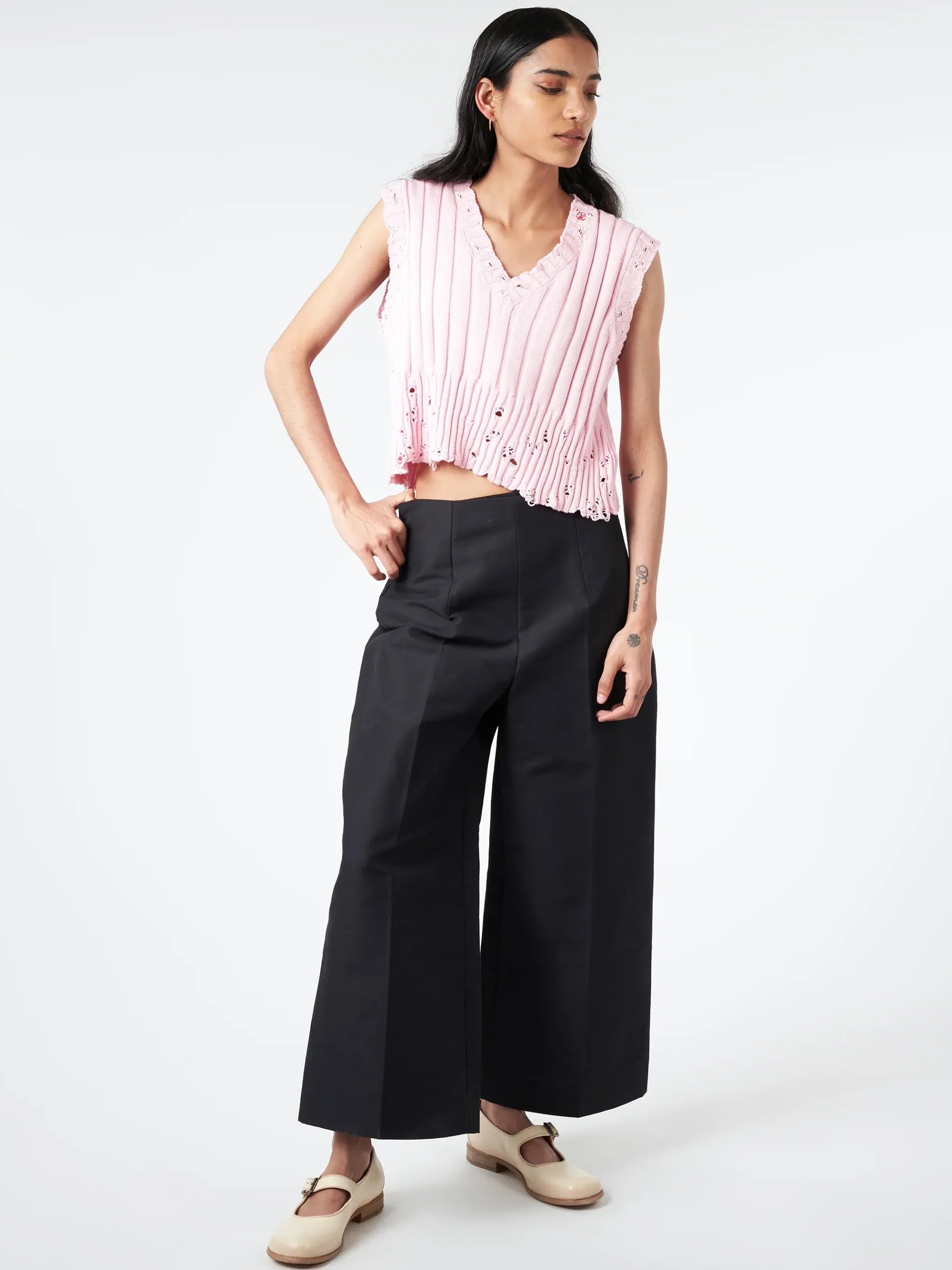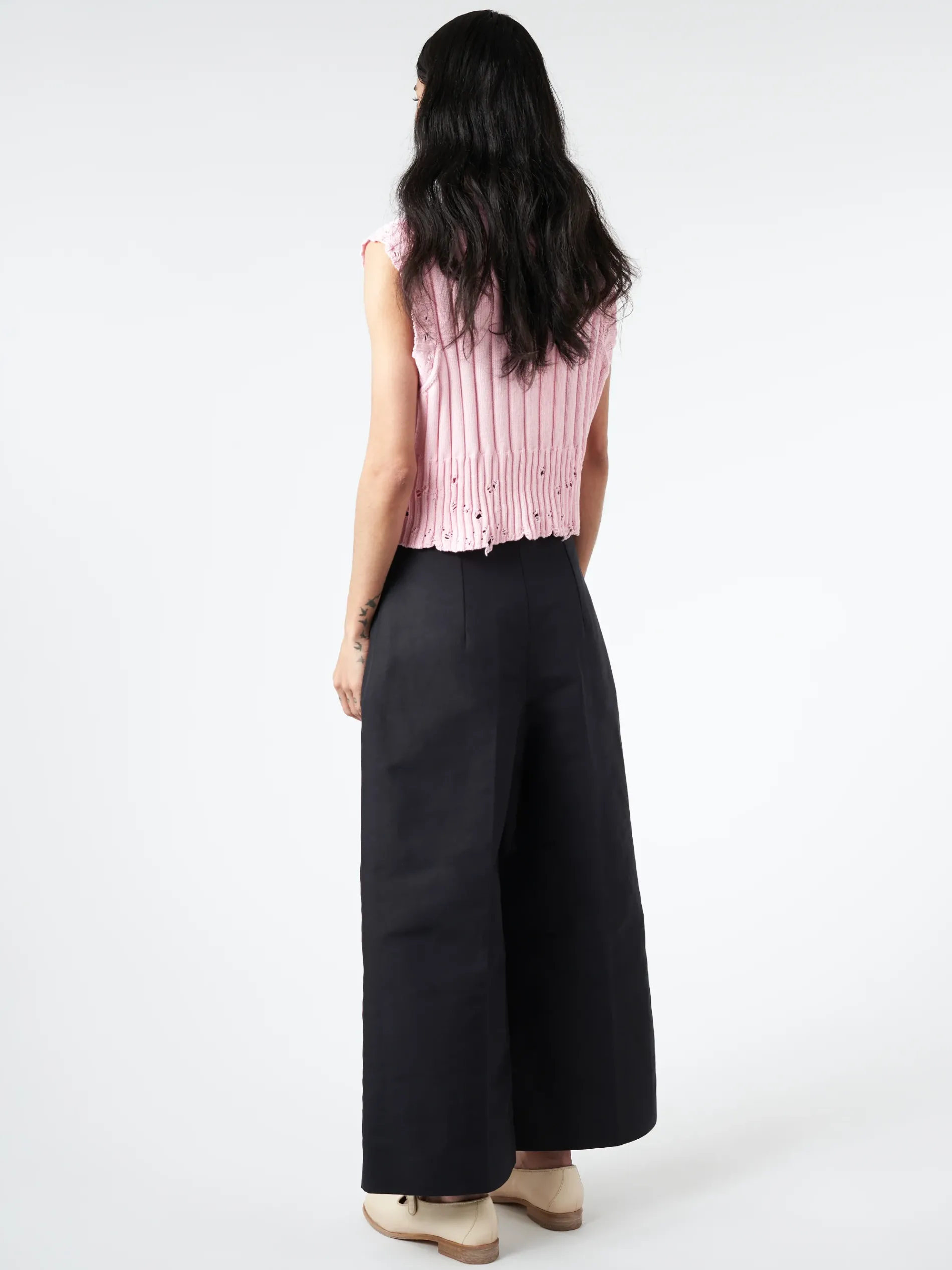 Marni ribbed cotton cropped sweater vest with distressing and laddering throughout.