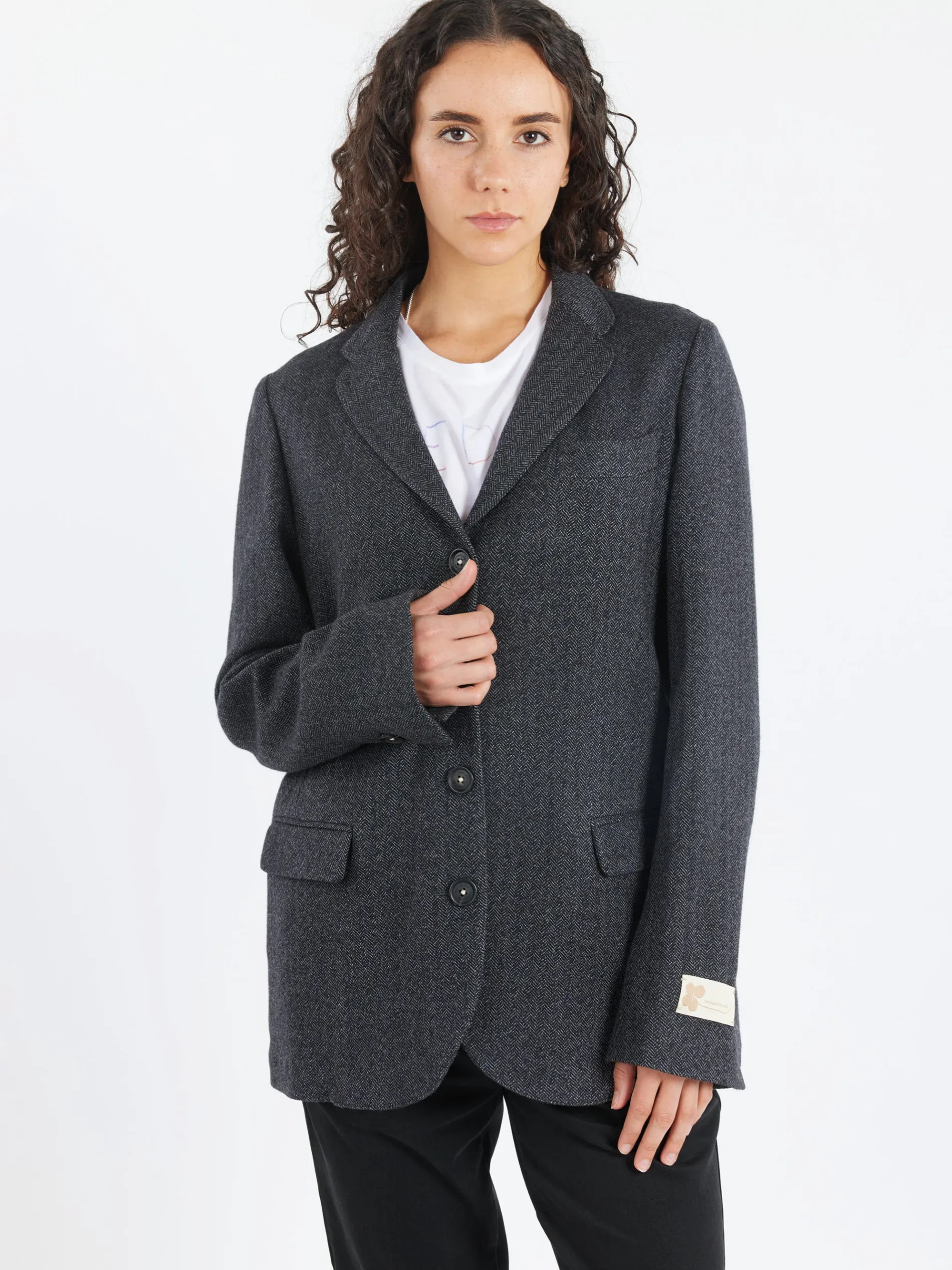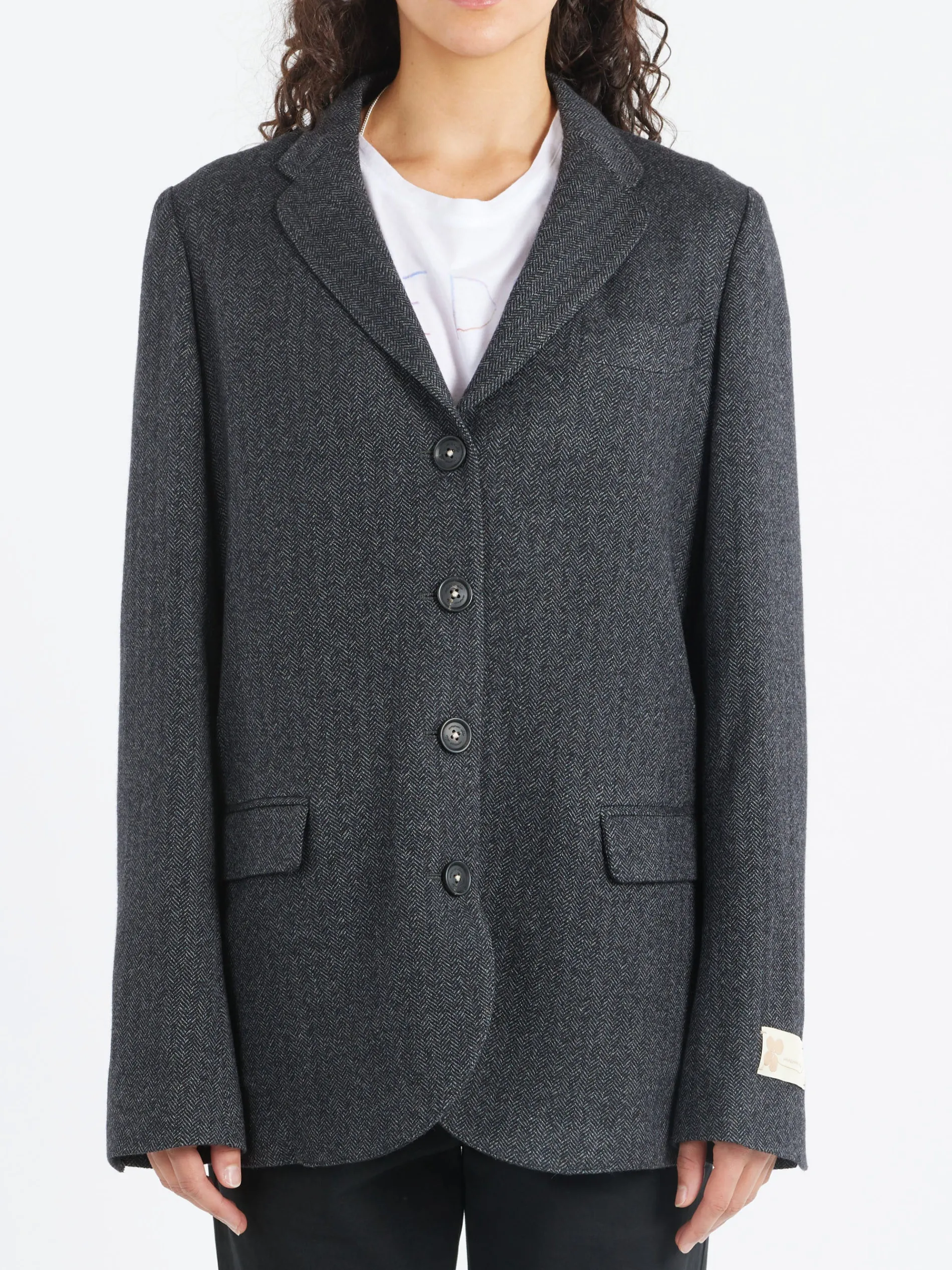 Single-breasted jacket with four buttons, high notch lapels, unlined with two flap pockets, made of cashmere wool blend.