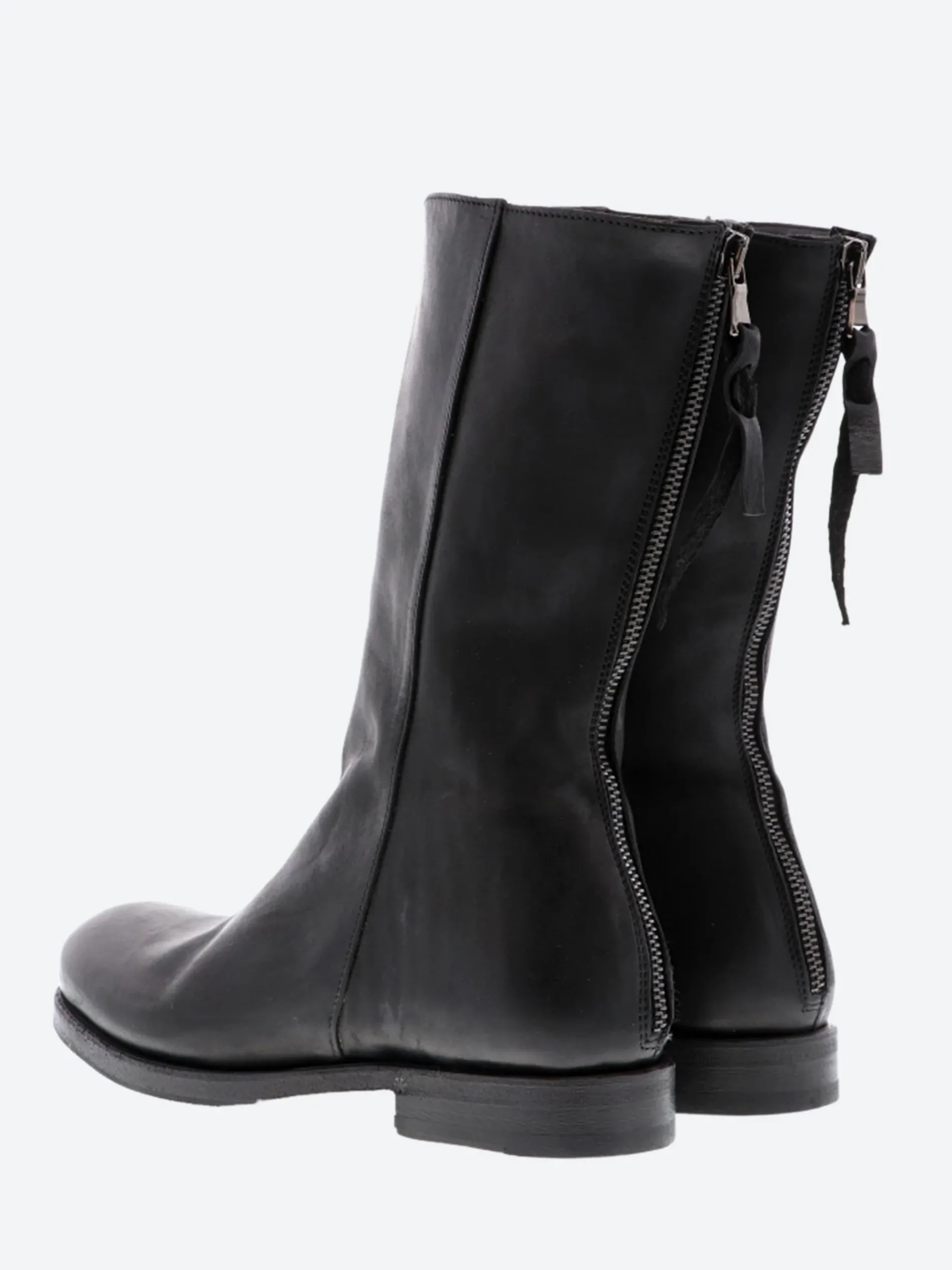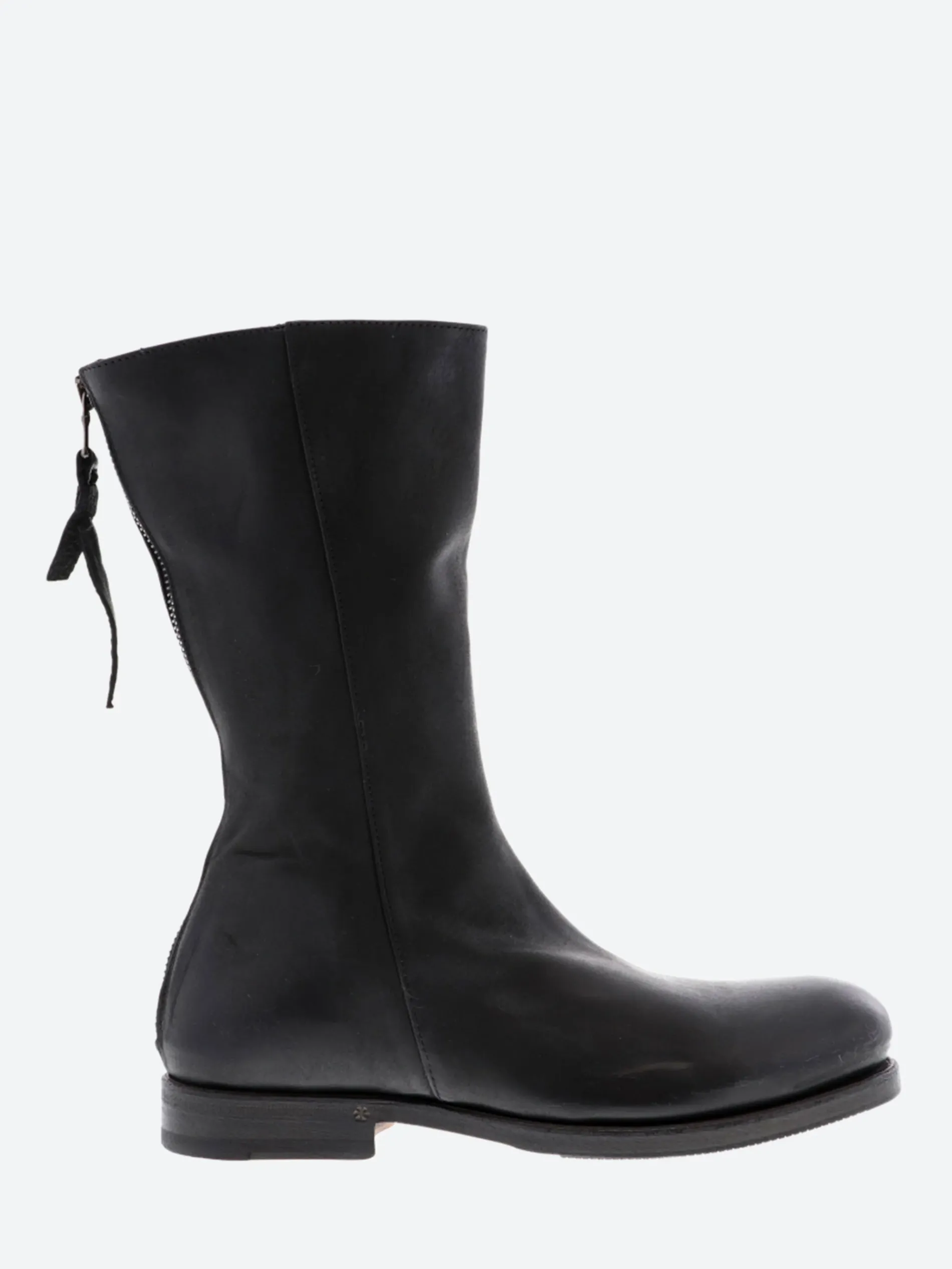 - Exposed back zip closure with leather pull