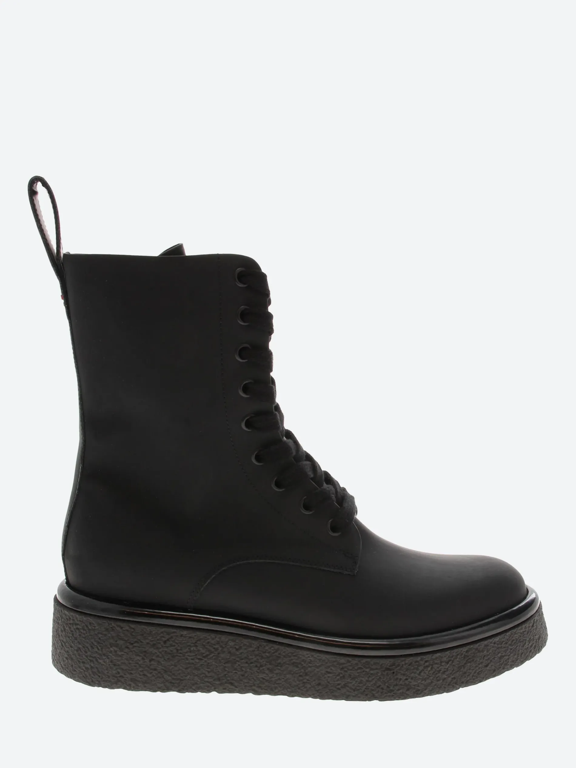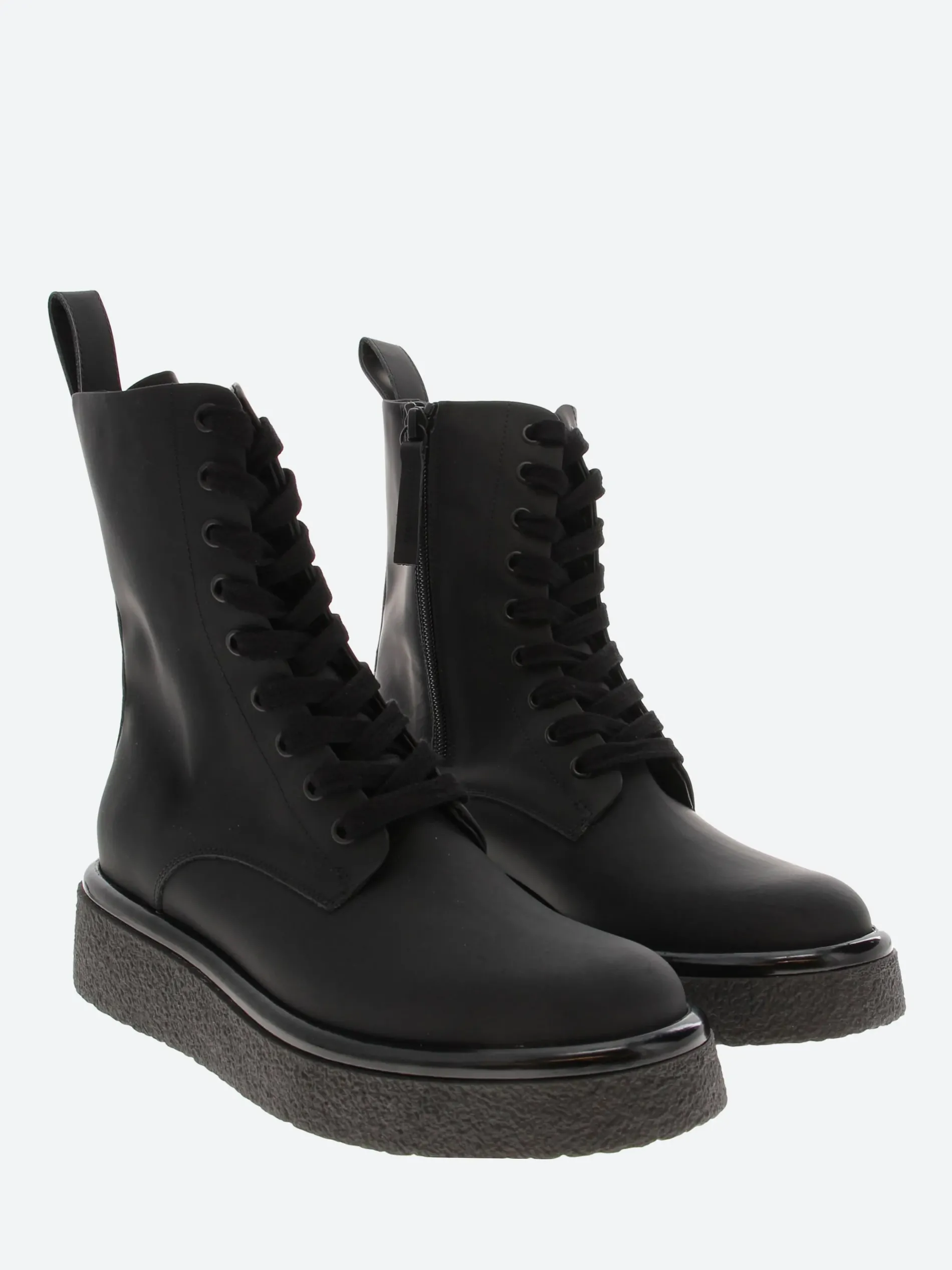 Halmanera combat styled boot in black calf leather. Sits on a personalized crepe sole with a rubber effect.