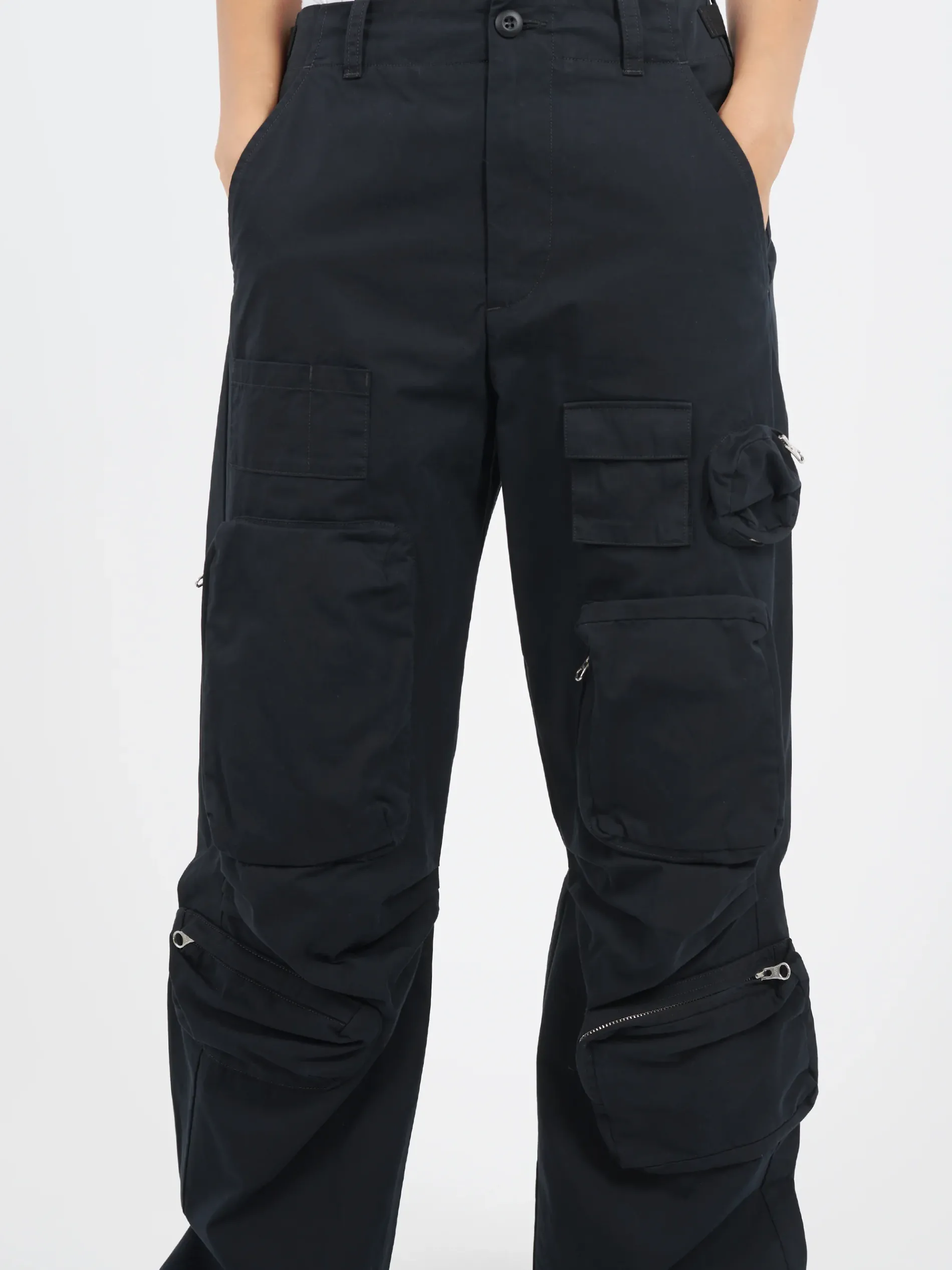 Relaxed-fit straight leg cargo pants in black. Signature white stitching at back waist.