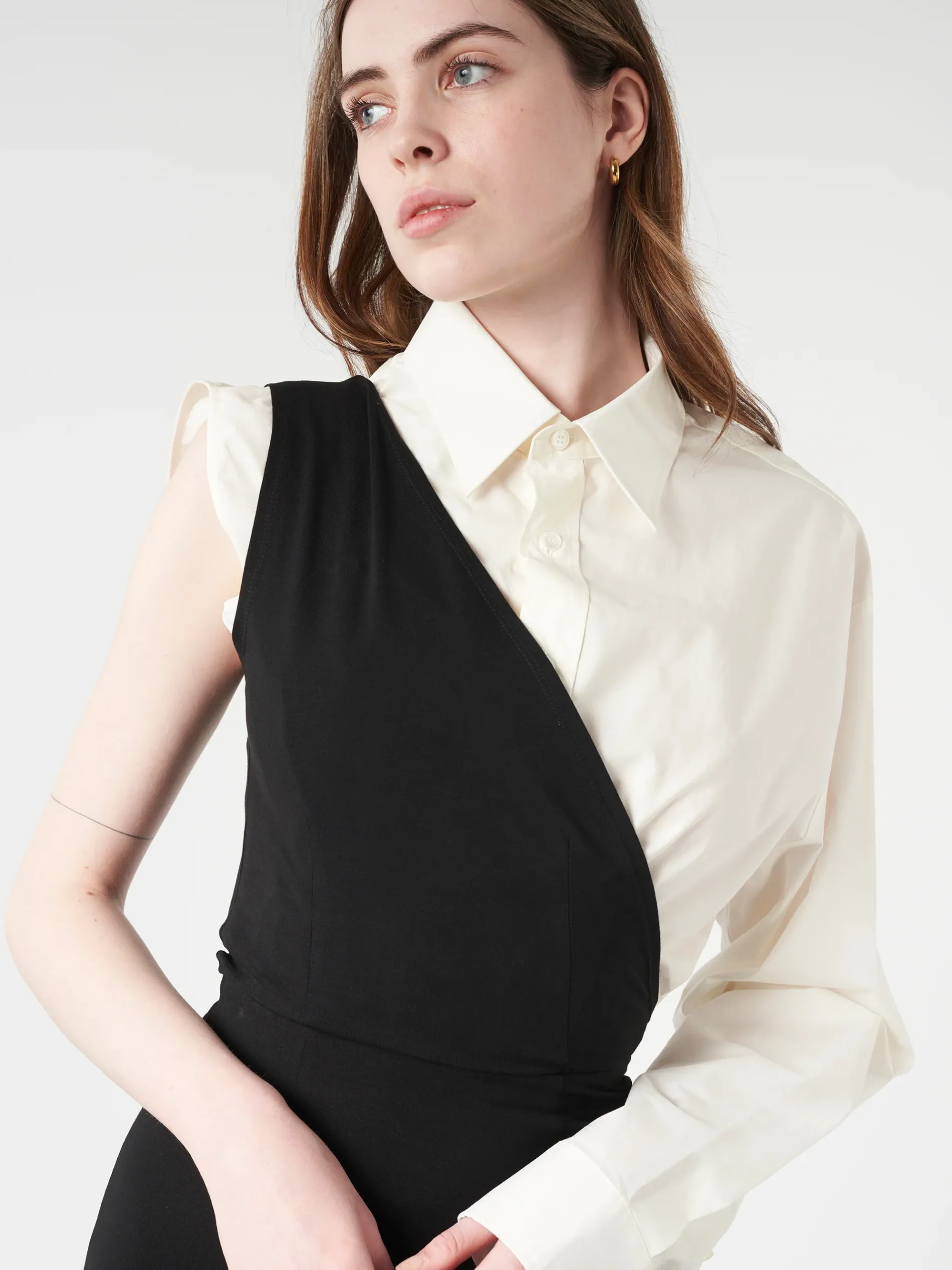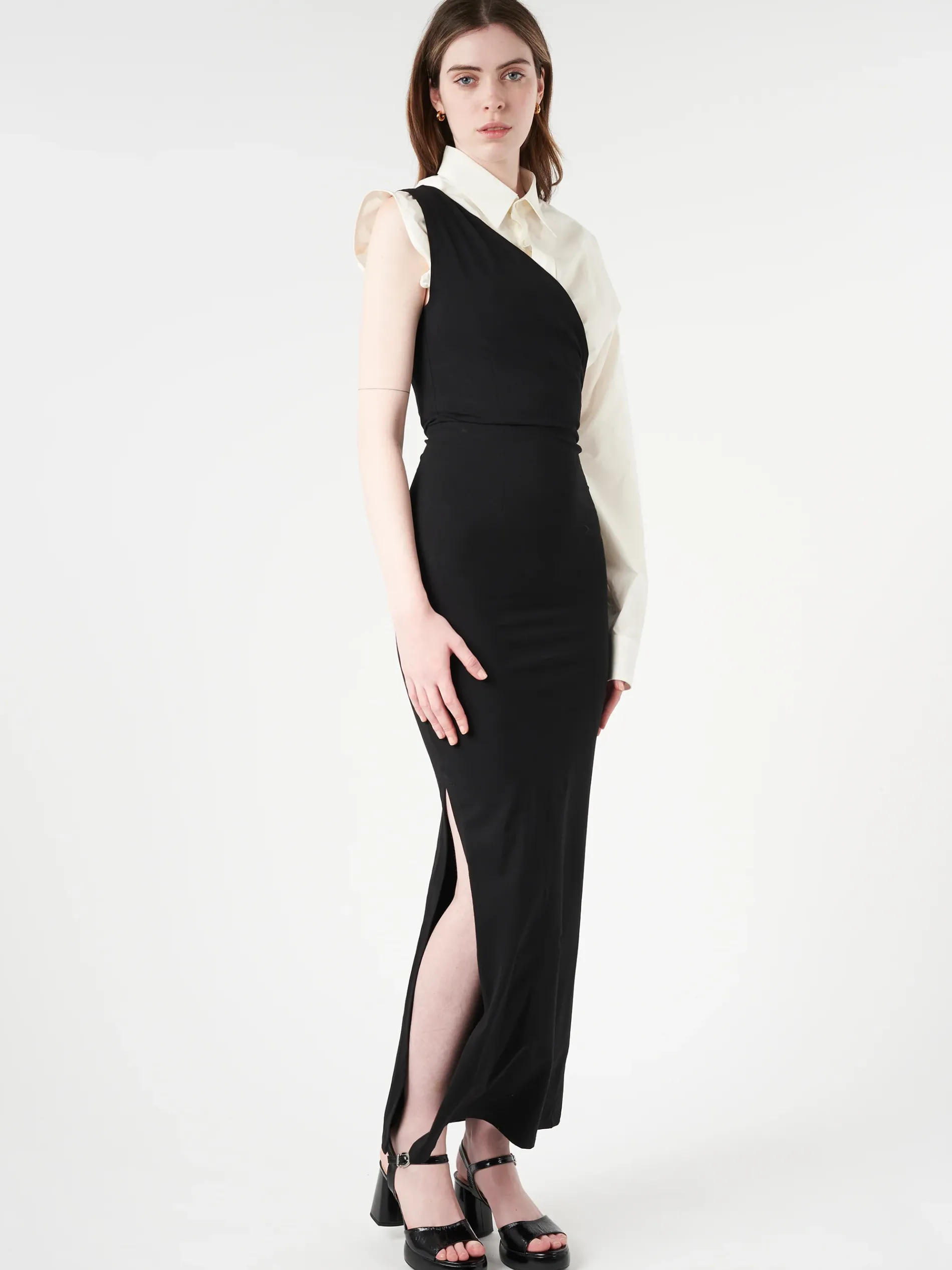 Shaped to a maxi length, MM6’s deconstructed, paneled dress is cut from cotton poplin and elastane. The brand’s discreet yet distinct signature, a horizontal line of white stitches, is found on the back.