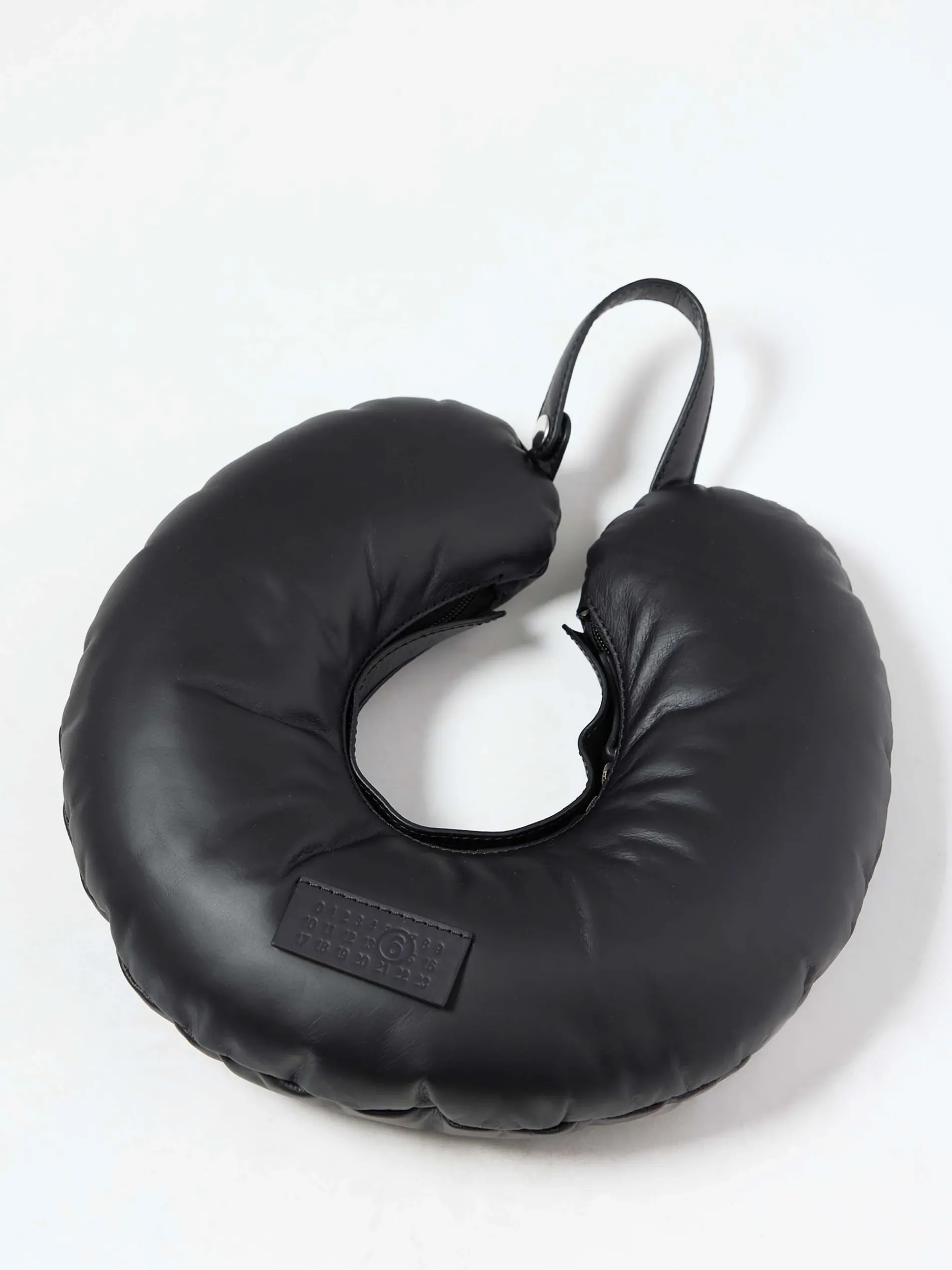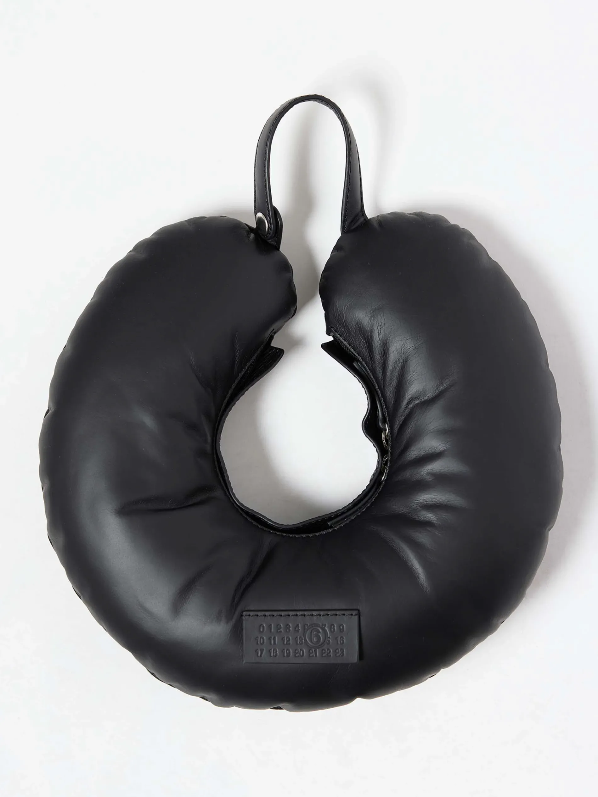 Featuring a sleek top handle for street-ready style, the unexpected Travel Pillow Bag juxtaposes a bold play on proportions with MM6’s discreet signature detailing. The zip closure ensures functionality, while the raw white stitch line at the back is a subtle nod to the Maison’s deconstructive design ethos.