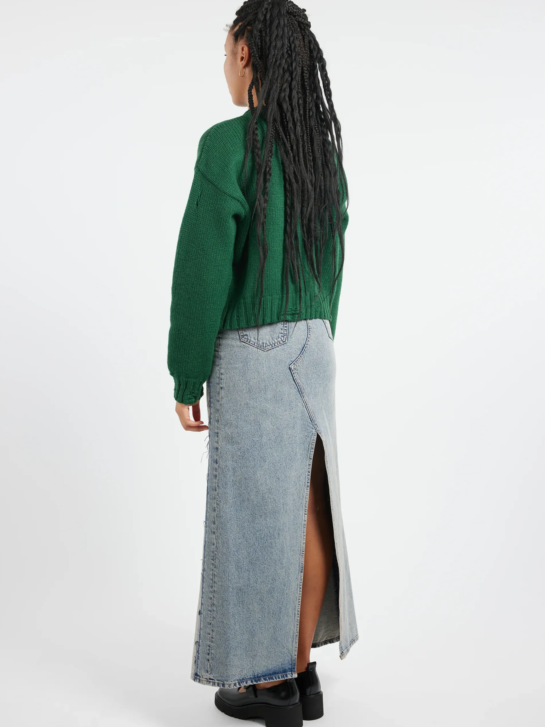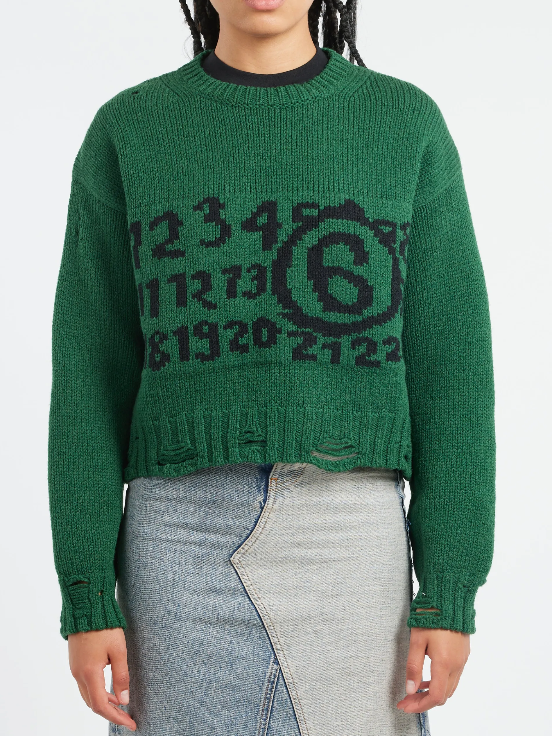 A crewneck jumper showcasing an abstract aesthetic with distressed details and ribbed trims. Adorned with MM6’s numeric signature on the front, it comprises a blend of punk inspiration and deconstructive elements. The Maison’s subtle white stitch line at the back completes its avant-garde appeal.