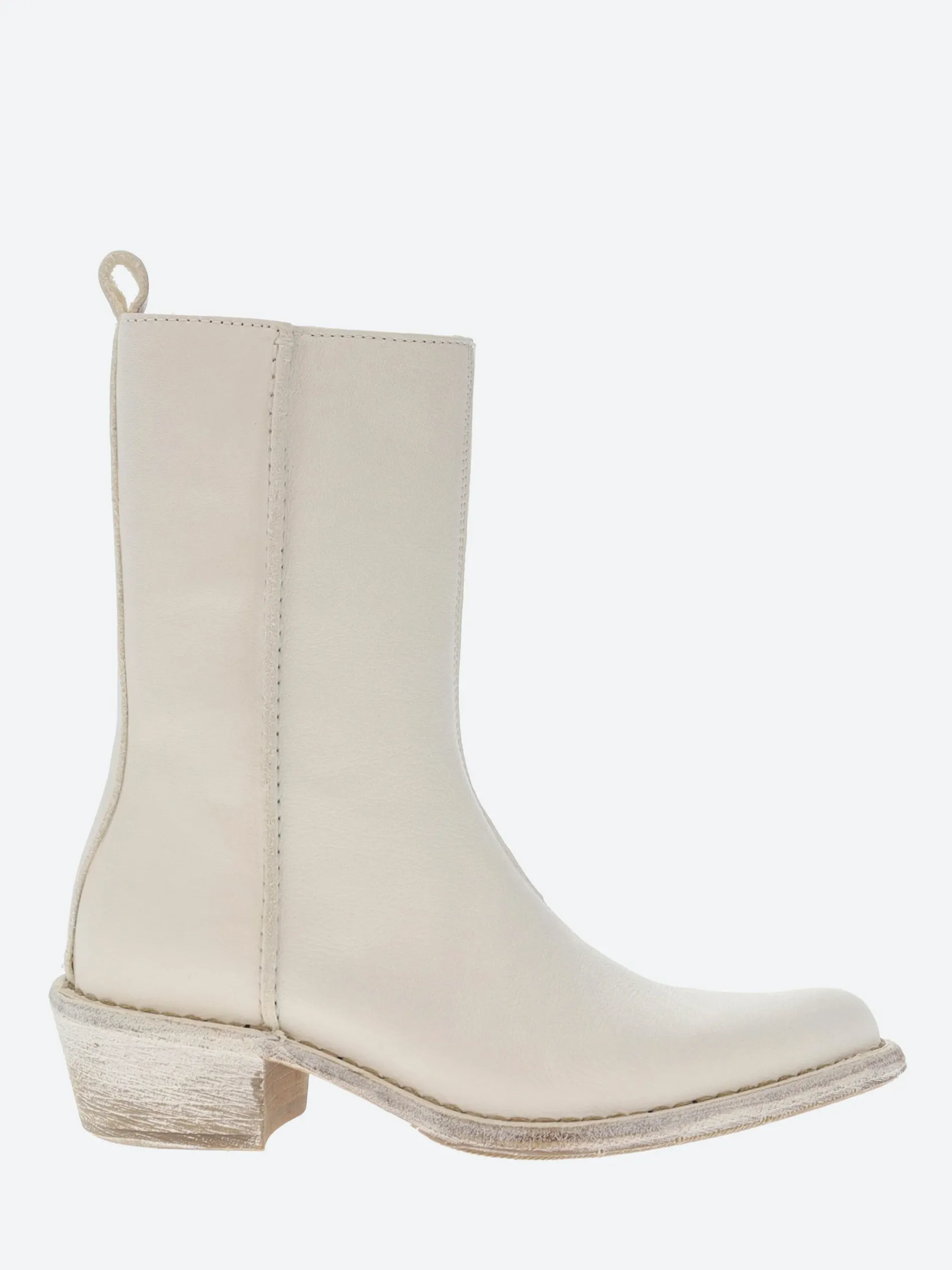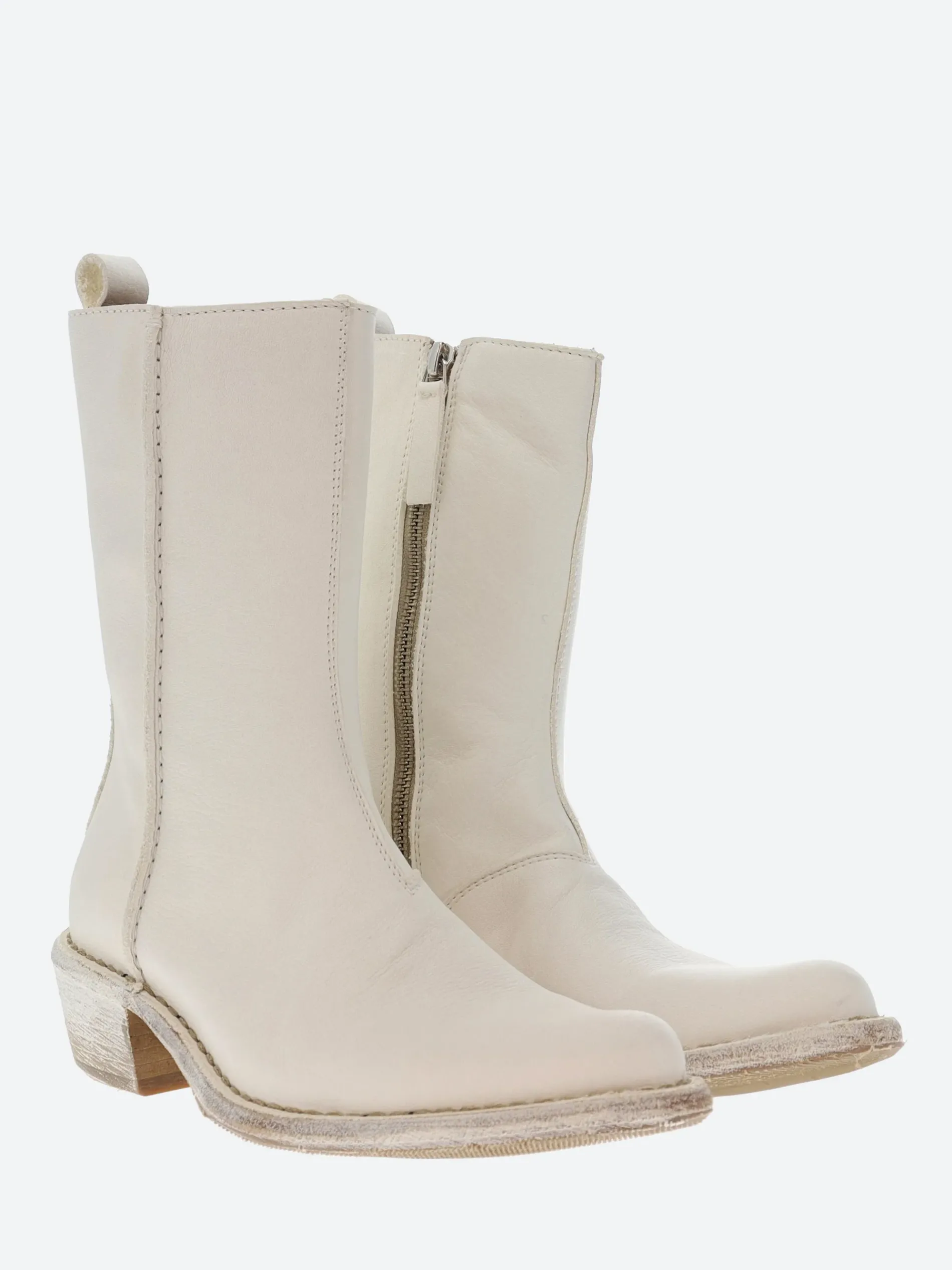 A timeless western-inspired leather boot with exposed inner zip closure, set on a stacked heel.