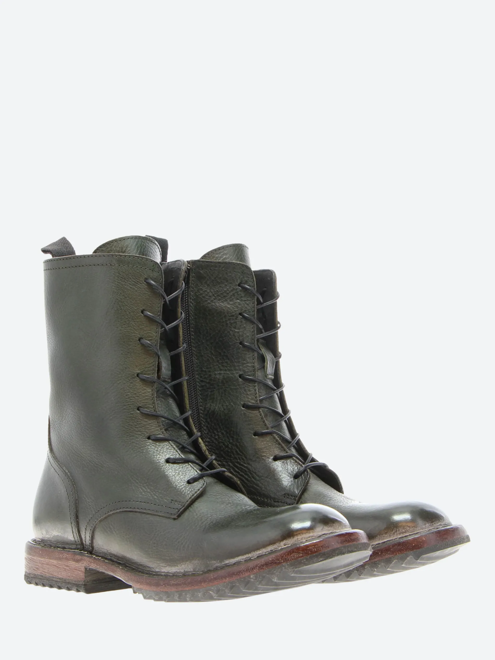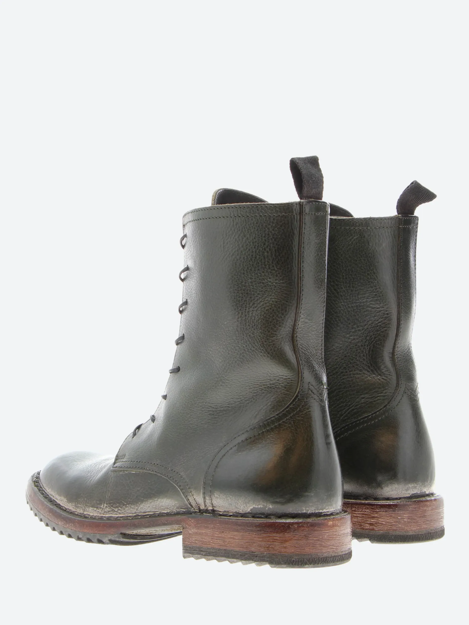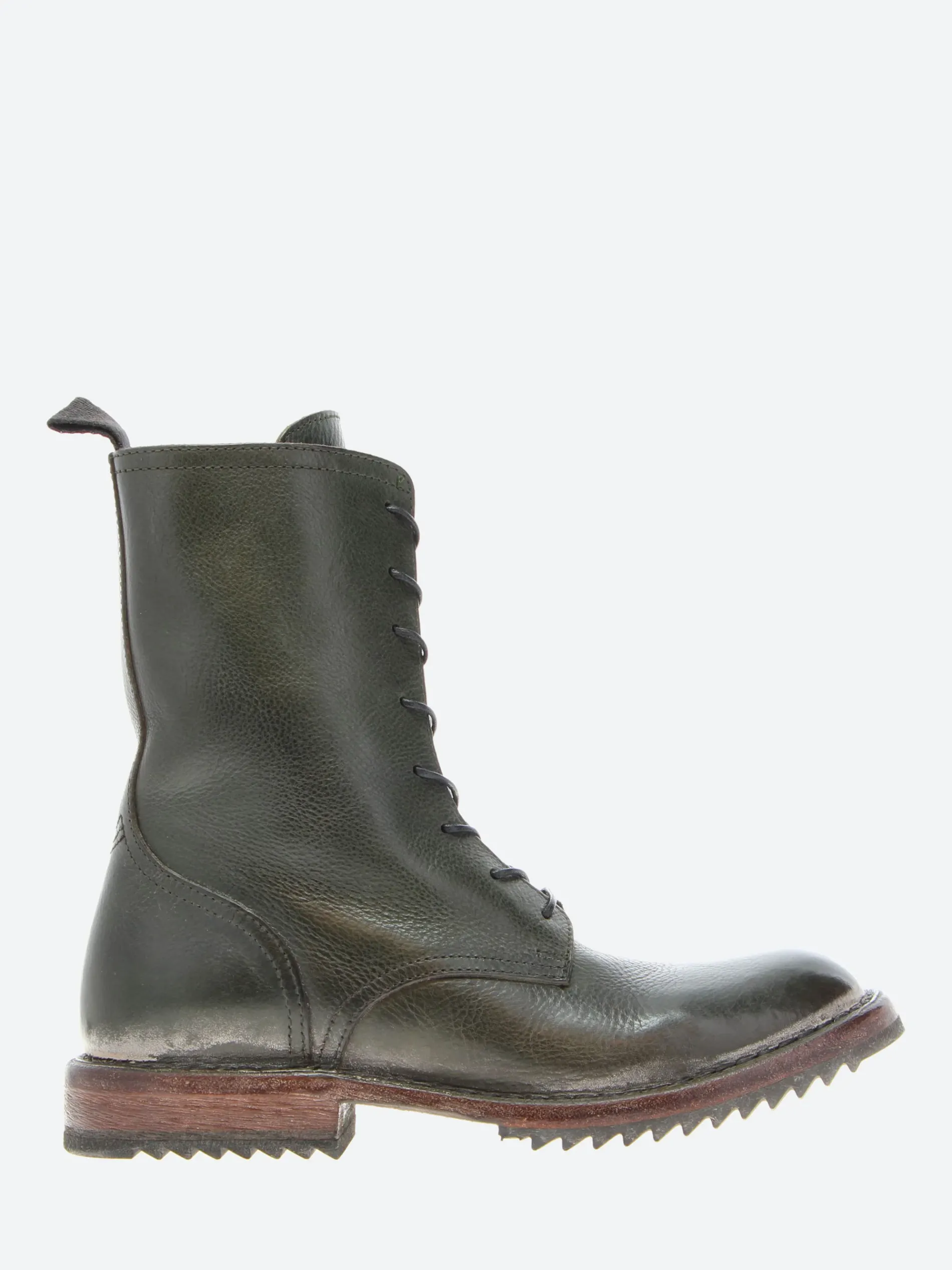 These combat boots are made using a green vintage-effect leather, finished with a toothed rubber outsole.
