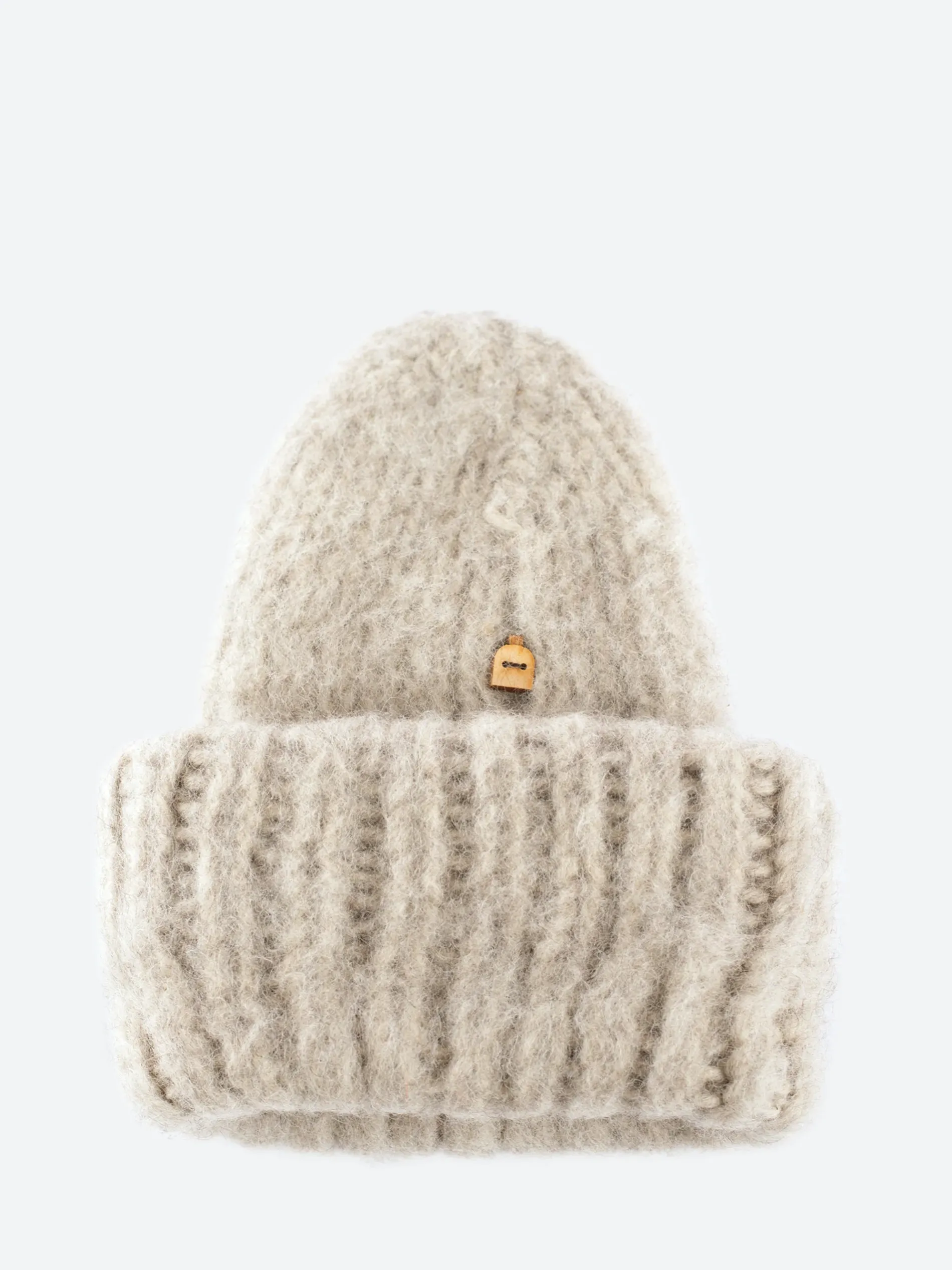 Hand-knit from chunky, undyed wool, this oversized beanie has been brushed for a soft, fluffy finish.