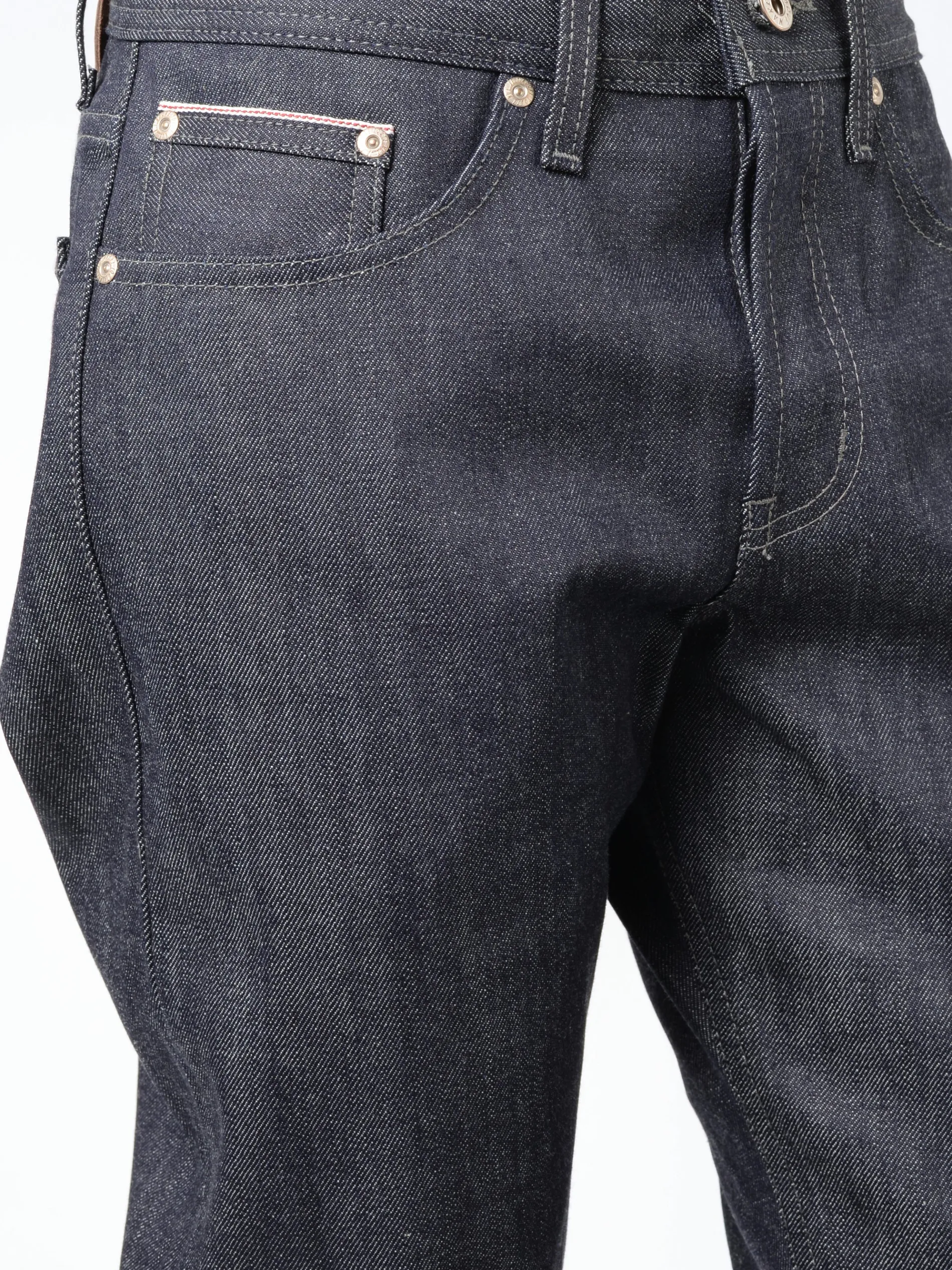 13oz indigo rope dyed Japanese selvedge denim, woven on vintage shuttle looms in a right hand twill construction. The Indigo dyed warp and white weft combined with a red line selvedge ID give these jeans a classic look.