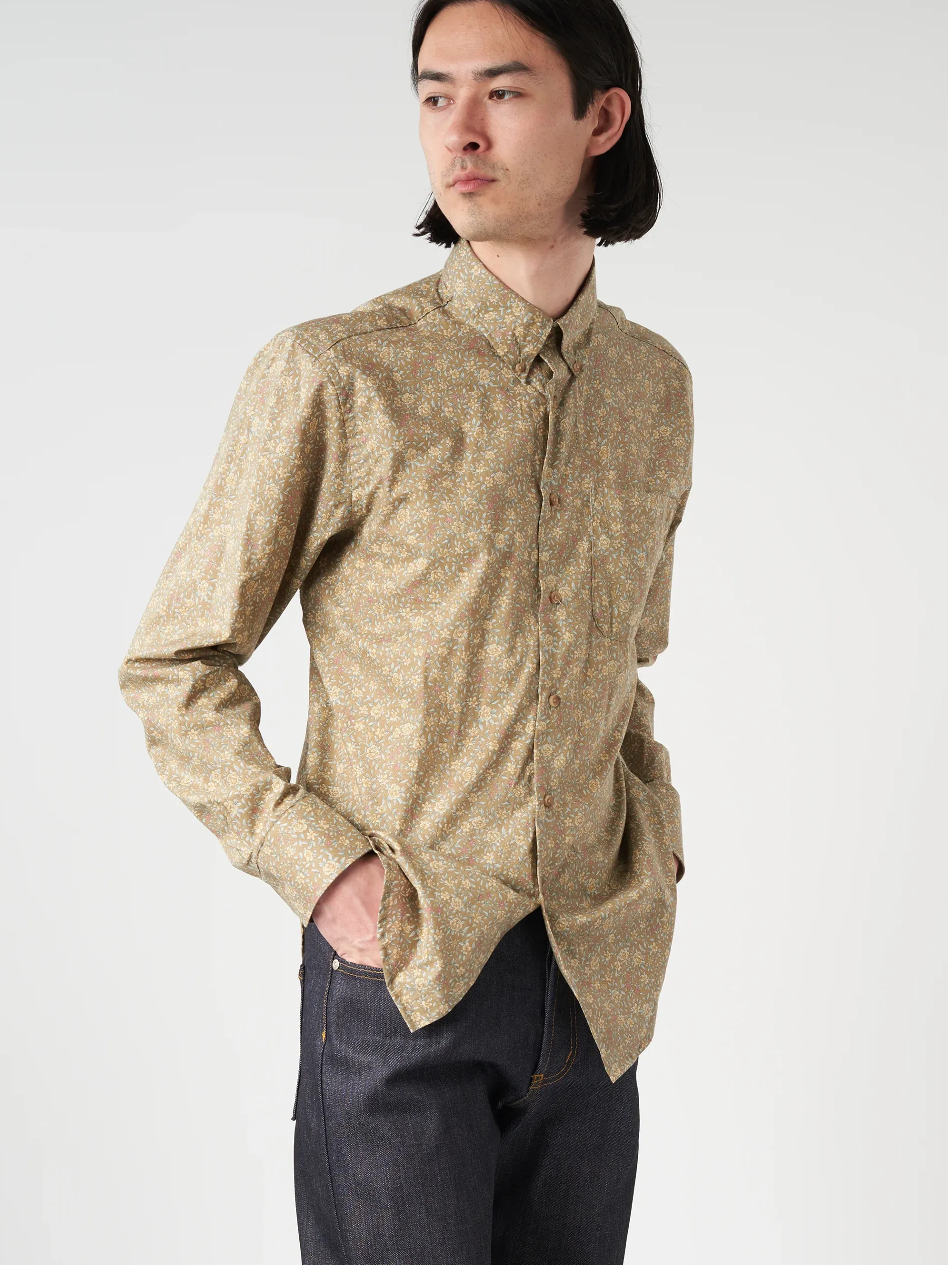 The Easy Shirt is a relaxed-fit long sleeve shirt with back pleating and a classic button-down collar. The Bell Flowers is a lightweight Japanese fabric with all over floral print.