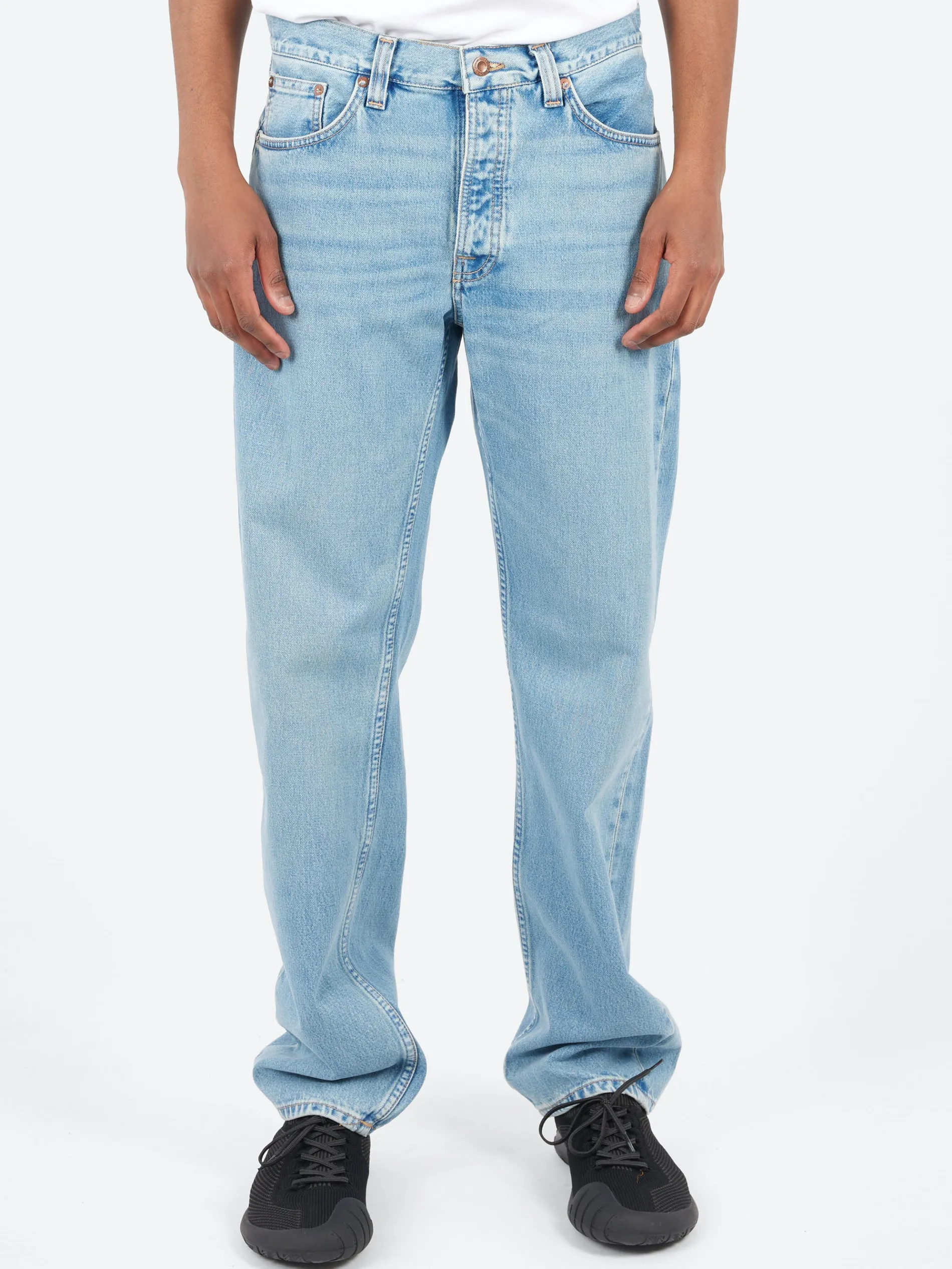 A high-waist regular-fit jean with a straight leg, crafted from wonderfully bright washed broken twill denim. Washed to vibrant shades of indigo with a warm tint, these jeans have achieved an authentic vintage appearance with intricate detailing, showcasing denim washing craftsmanship with finesse.