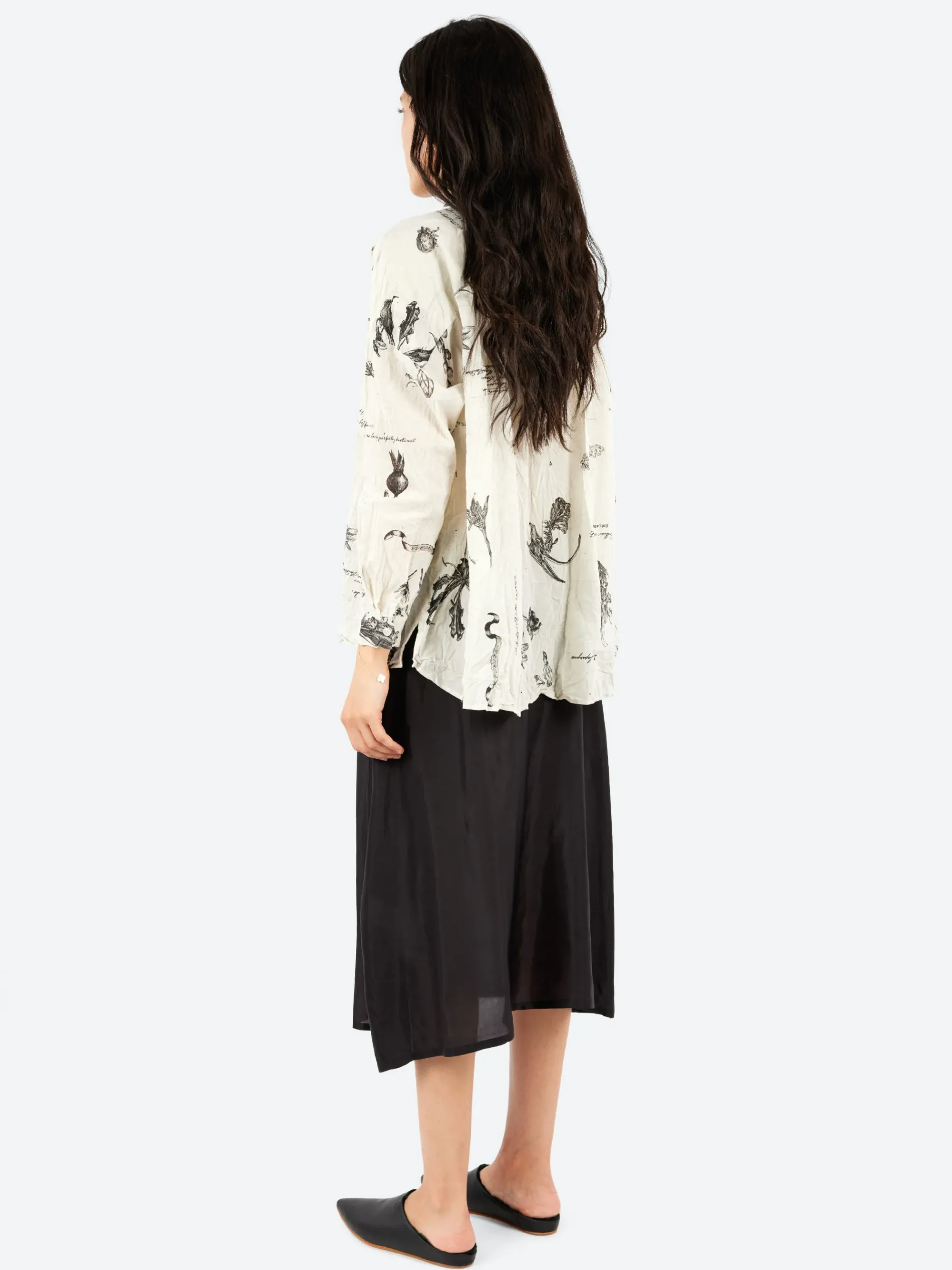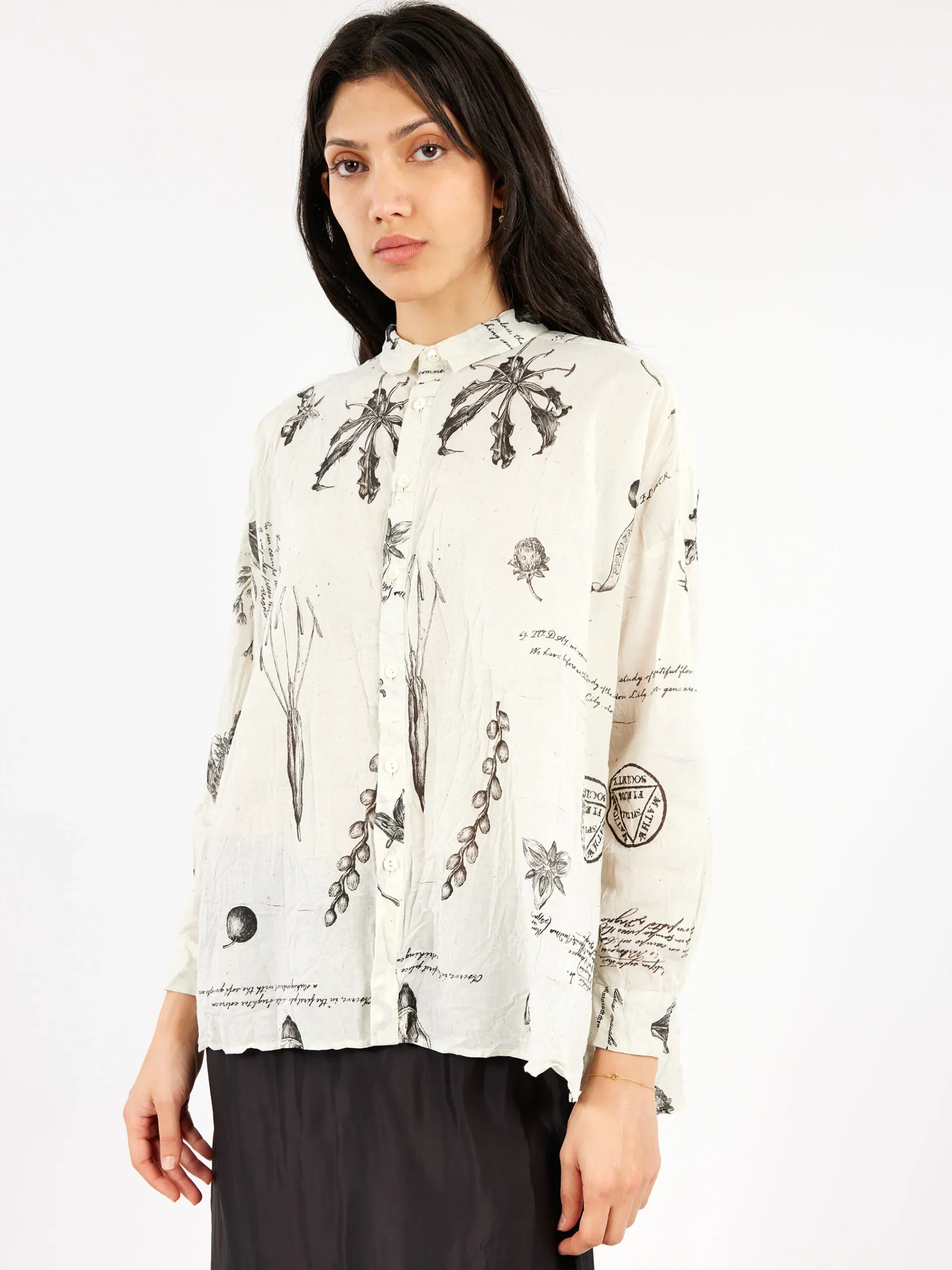 The Plant Growth Print Blouse by Pas de Calais is crafted from 100% lightweight cotton with a crinkled effect. Featuring back pleat details and a button opening at the front, it offers a relaxed, loose cut with drop shoulders. The blouse is designed with a pointed collar, small side slits, and tapered sleeves that gently narrow towards the cuffs. The special processed print adds a unique touch, while the unlined design enhances its breathable, comfortable fit.
