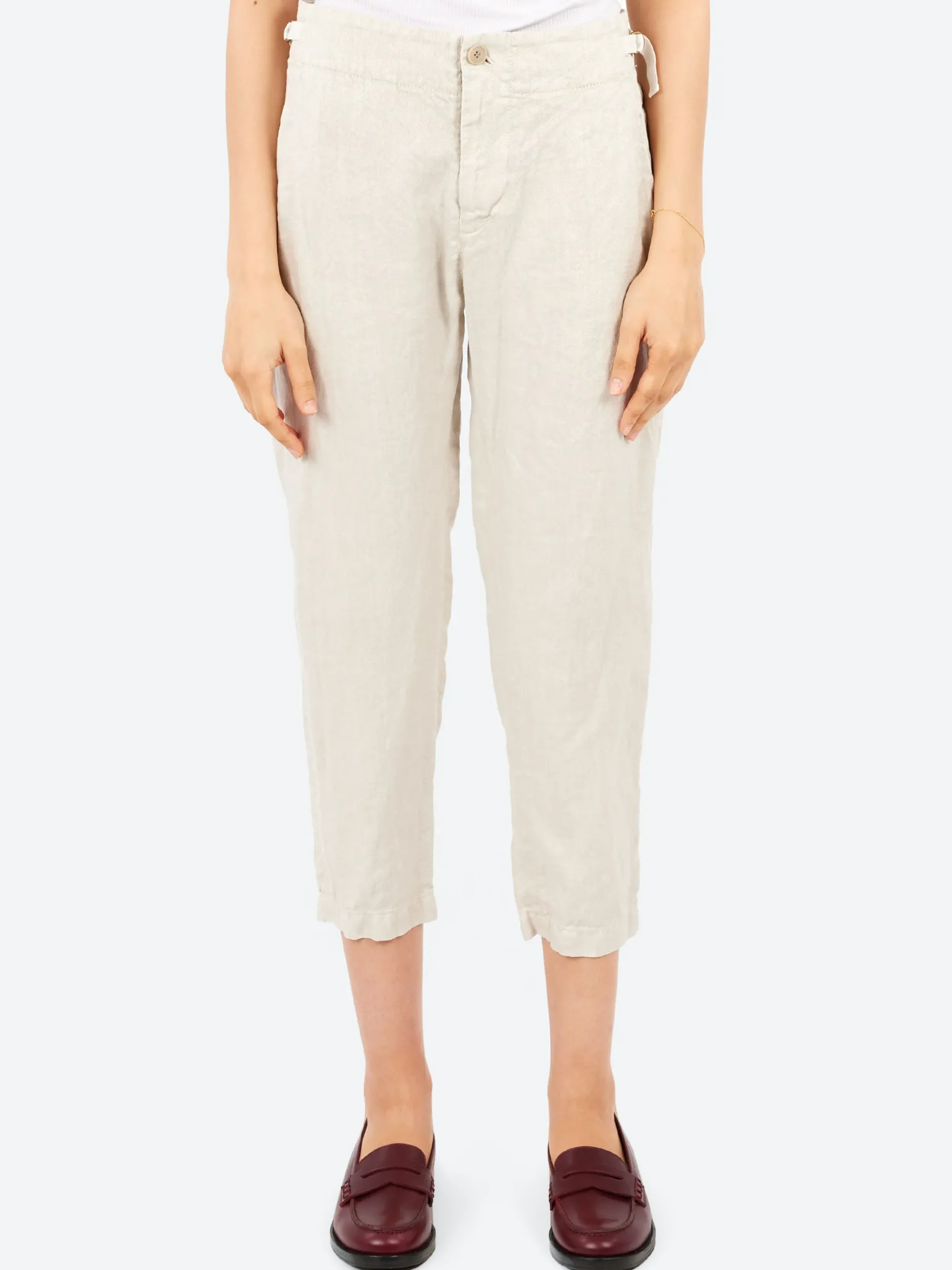 Pas de Calais tapered pants crafted from lightweight linen twill, featuring tonal adjustable side tabs for a customized fit. The design includes side-angled pockets, two patch pockets at the back, and a button and zip-fly fastening for added convenience.