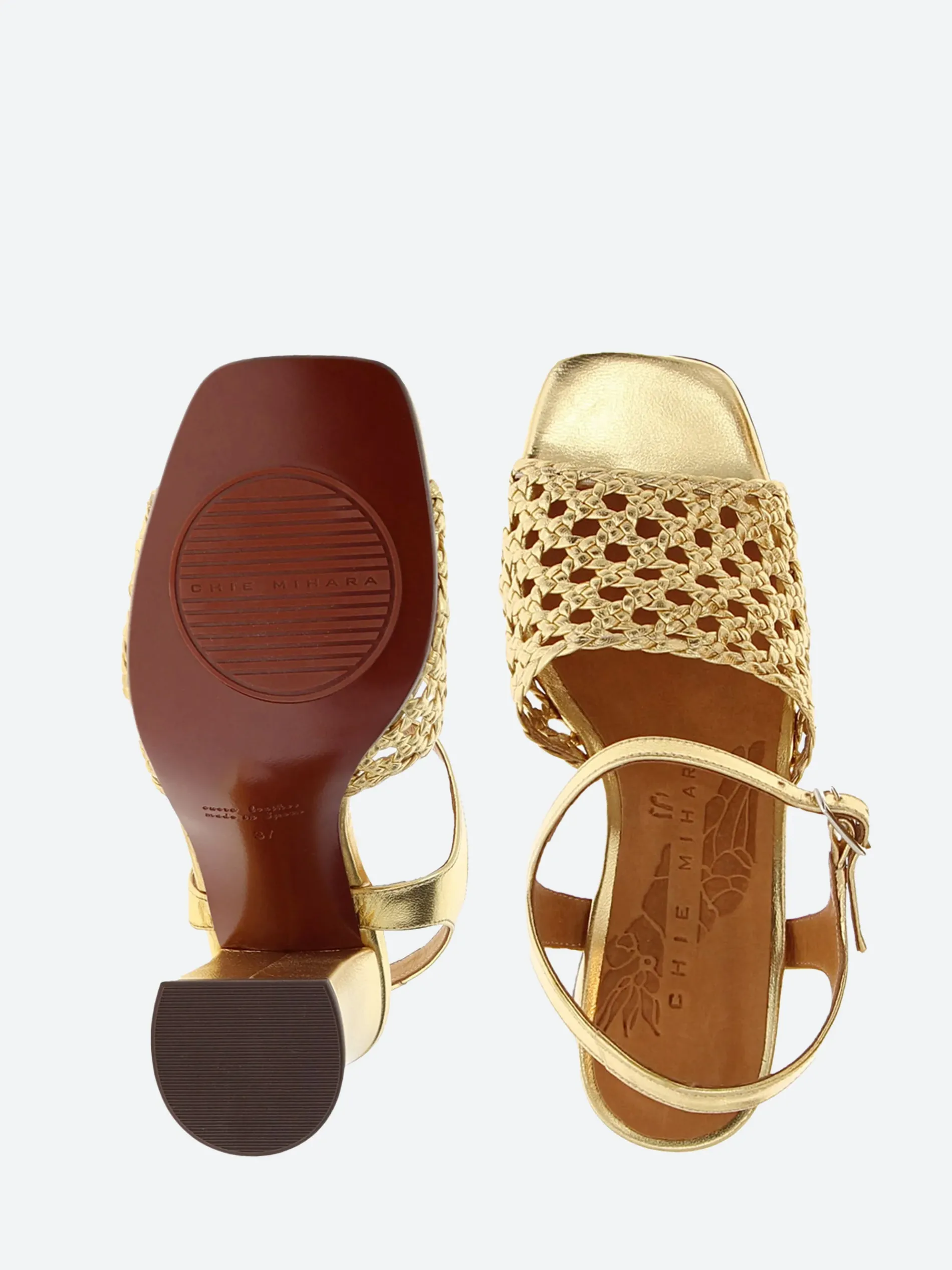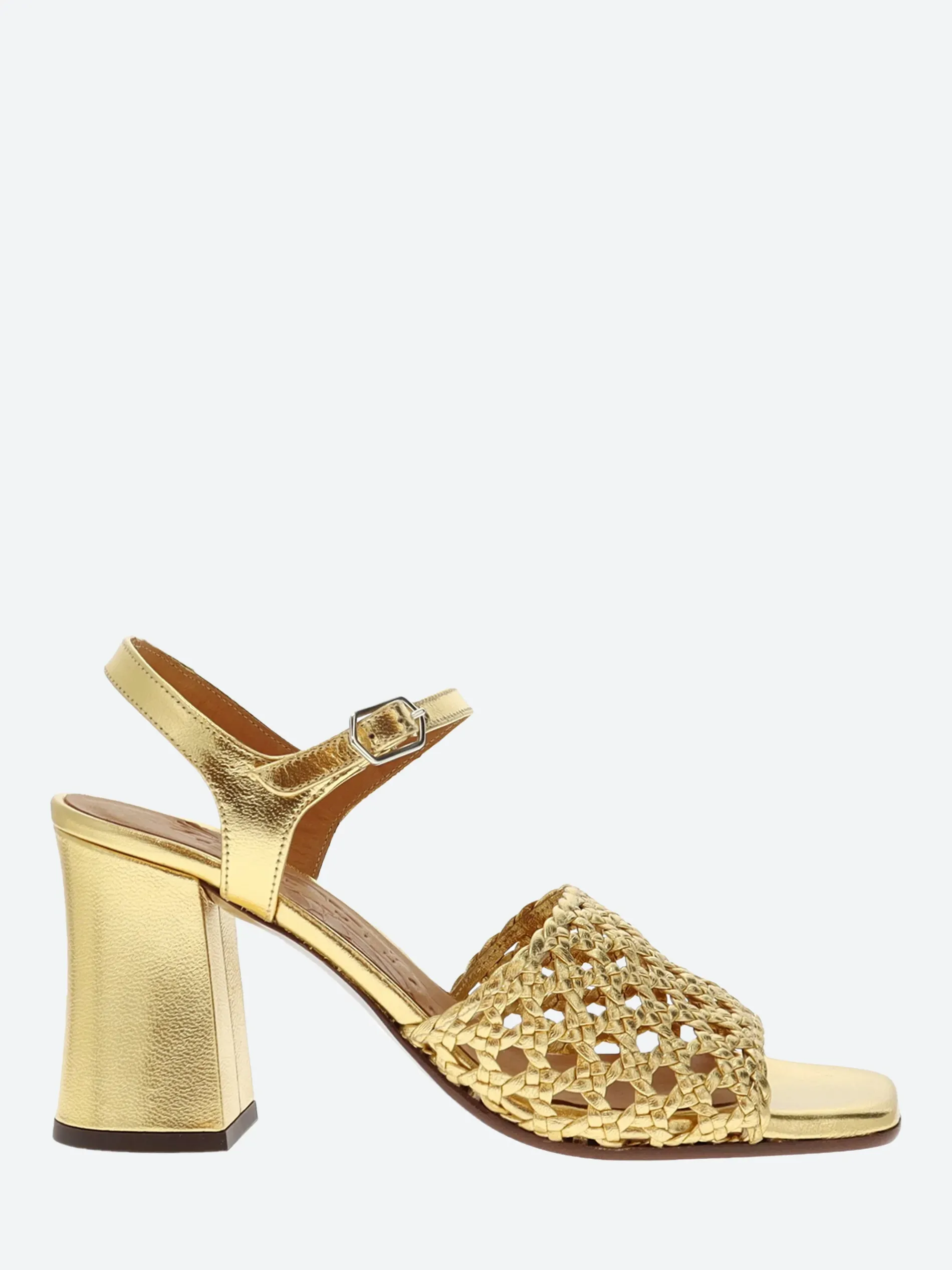 Chie Mihara Pausa open toe heeled sandal, crafted from soft leather with a cross-ankle buckle closure strap. Complete with metallic finish.