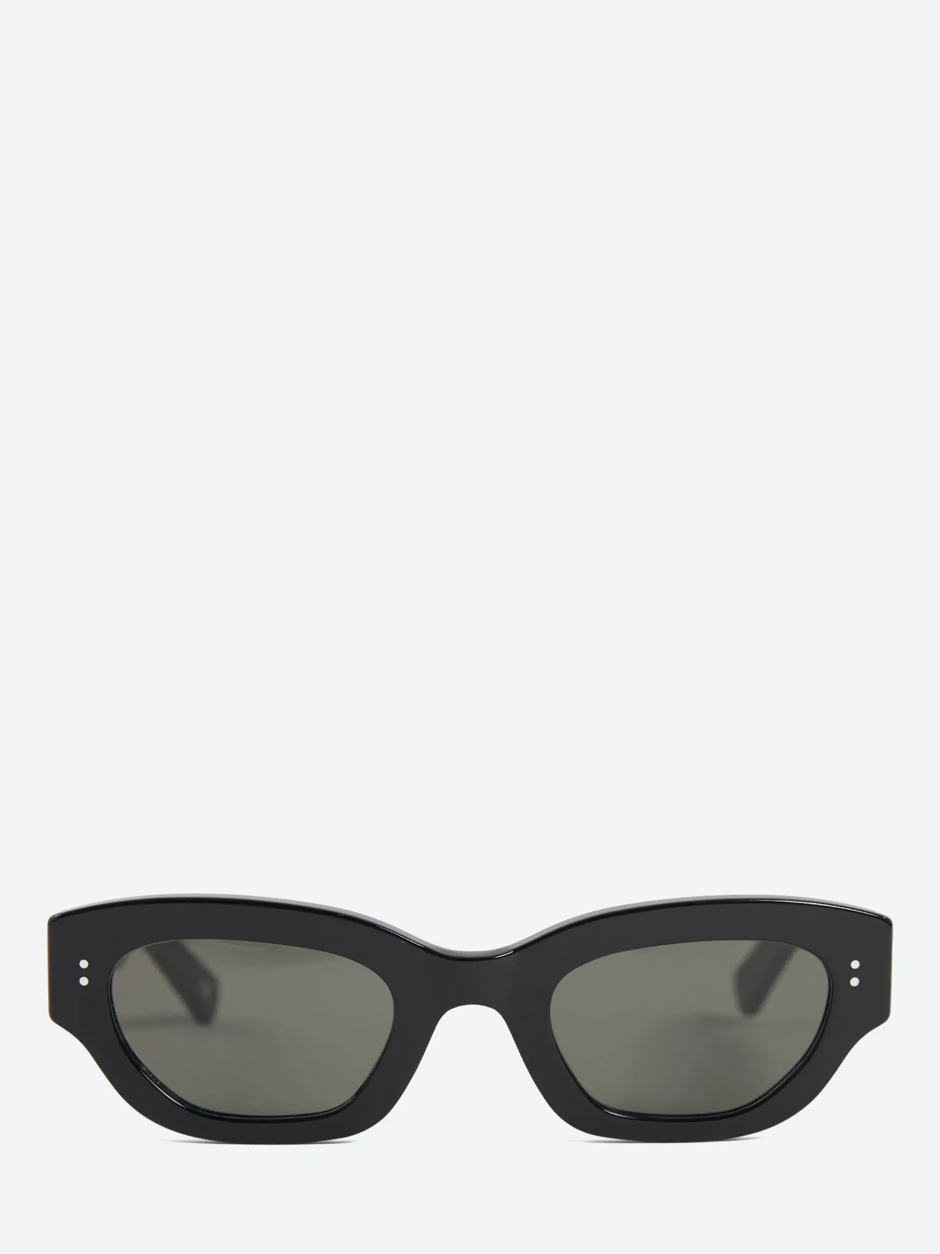 Geometric and tapered frame made of cellulose acetate, a biodegradable plant-based material with 100% UV protection lenses.