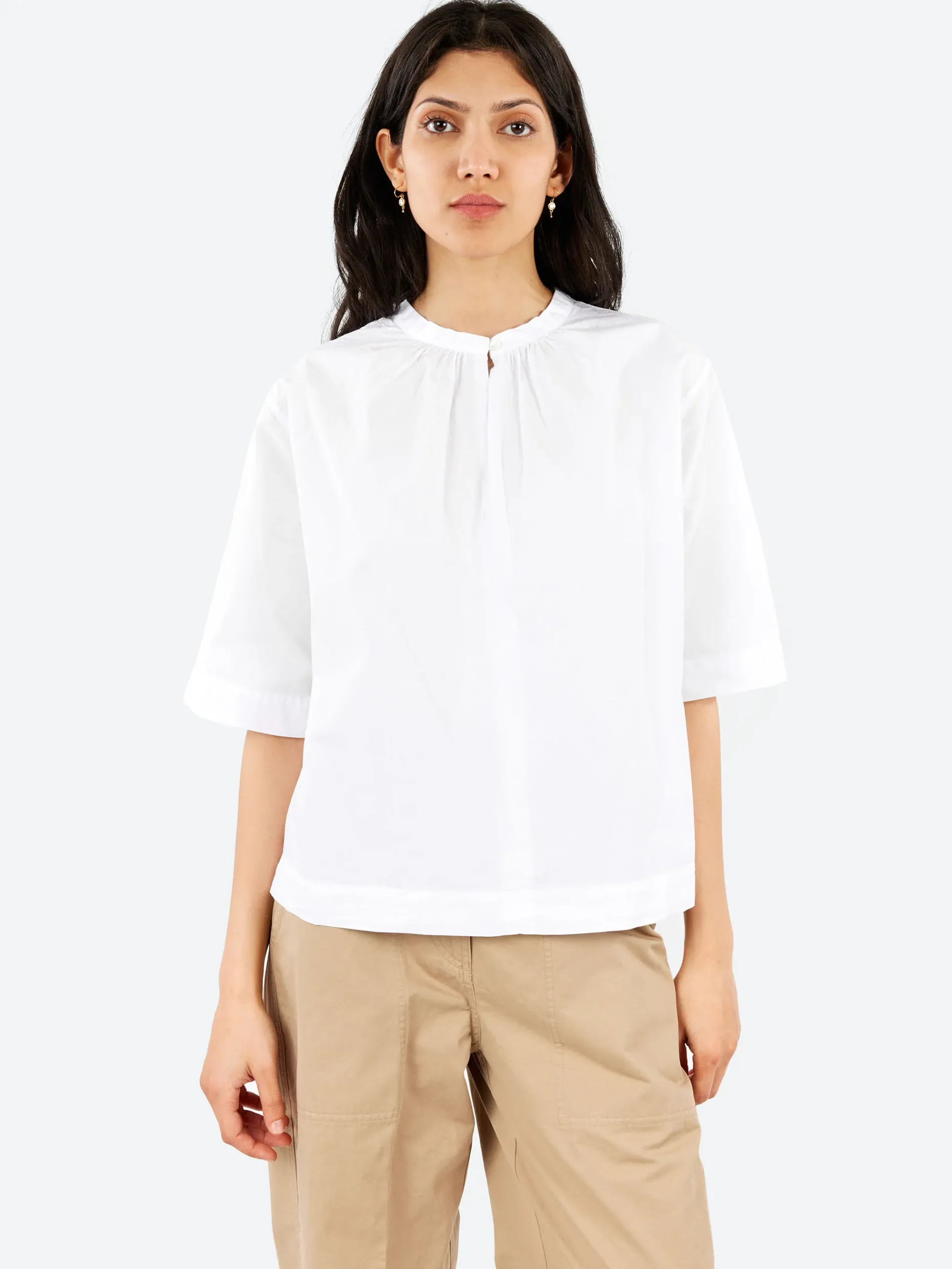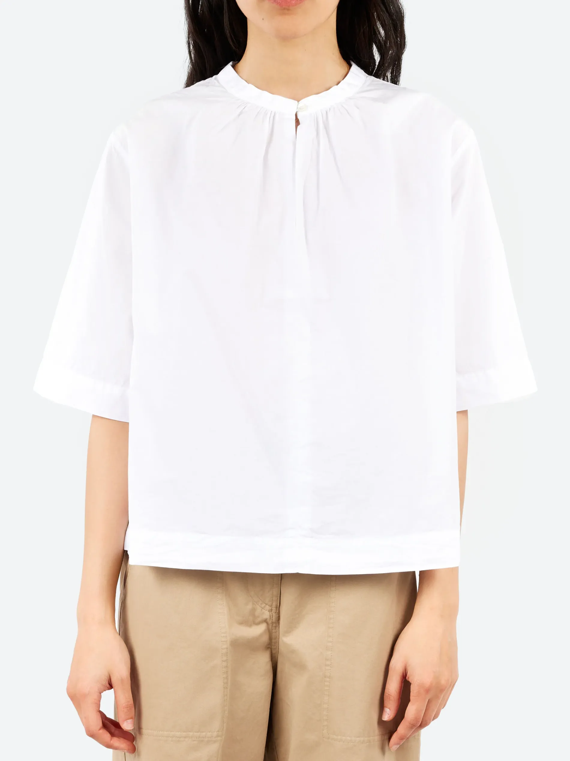 Tailored details refresh the essential style of the cotton poplin blouse. The band collar is enhanced by a delicate gathering and a keyhole closure with a button, adding a feminine touch to the classic lines of shirting. Cotton poplin is a year-round fabric with a lightweight texture that is exceptionally comfortable to wear.