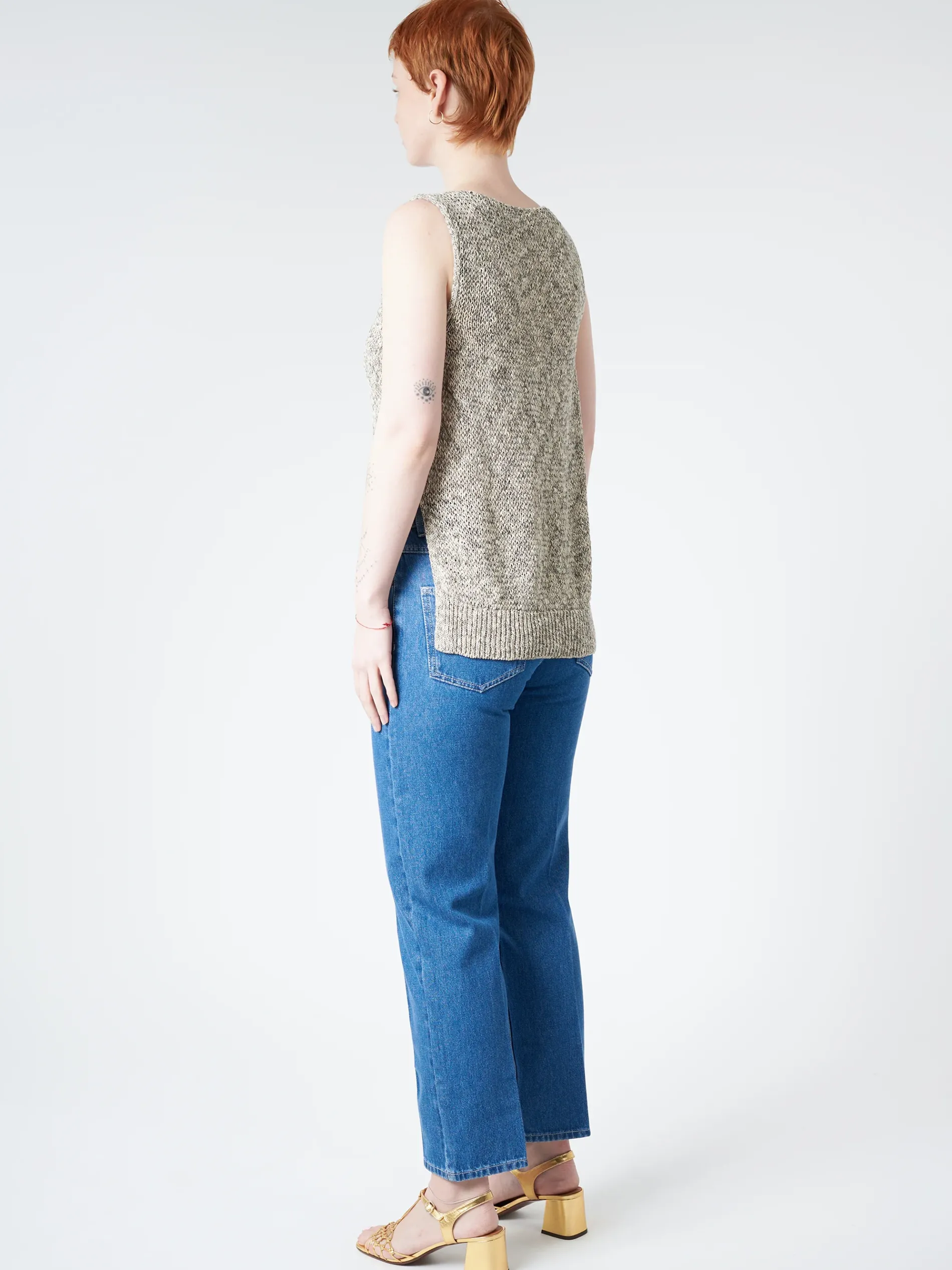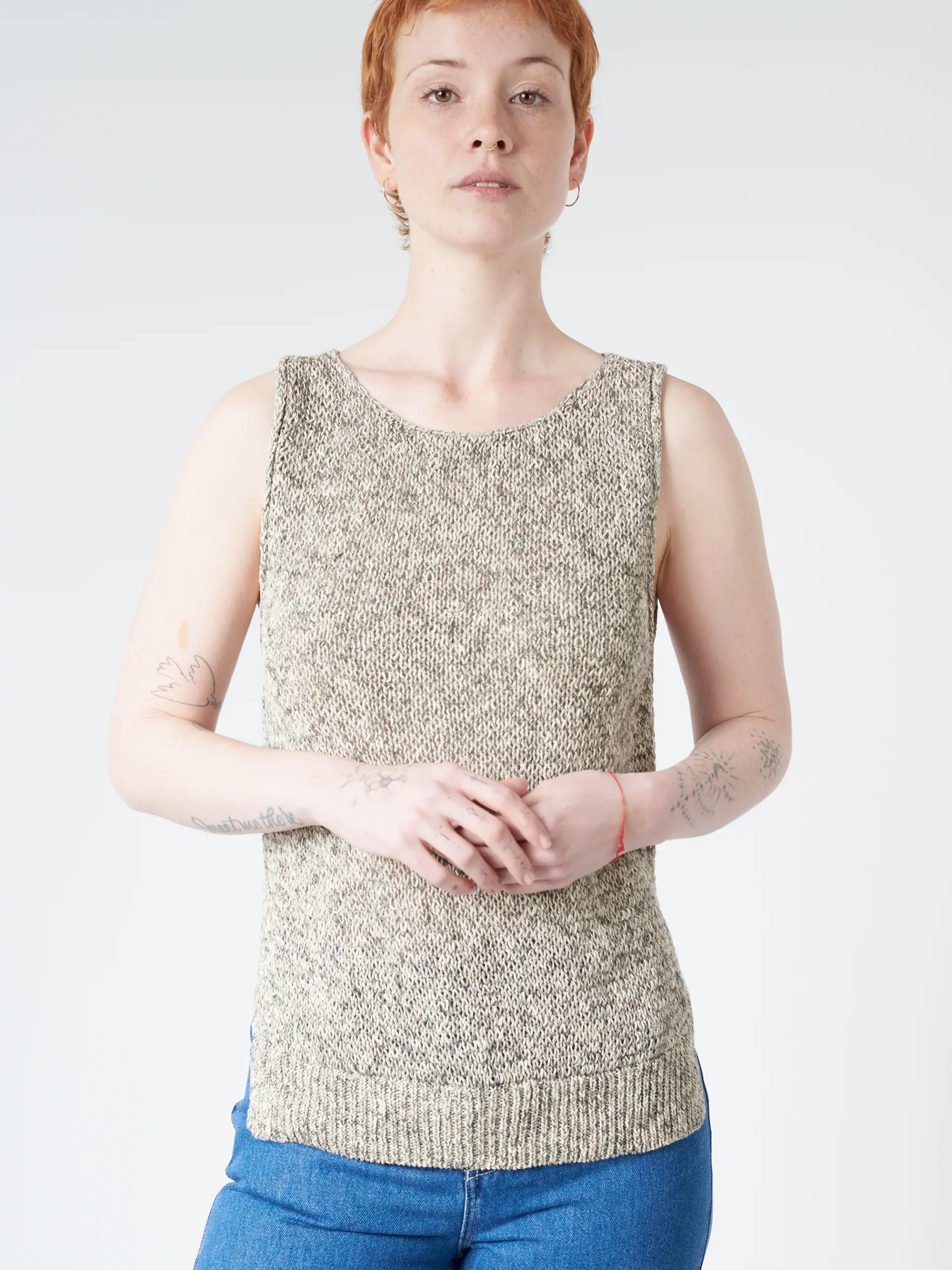 Pomandere round neck knitted tank top made from a coarsely twisted cotton linen yarn.