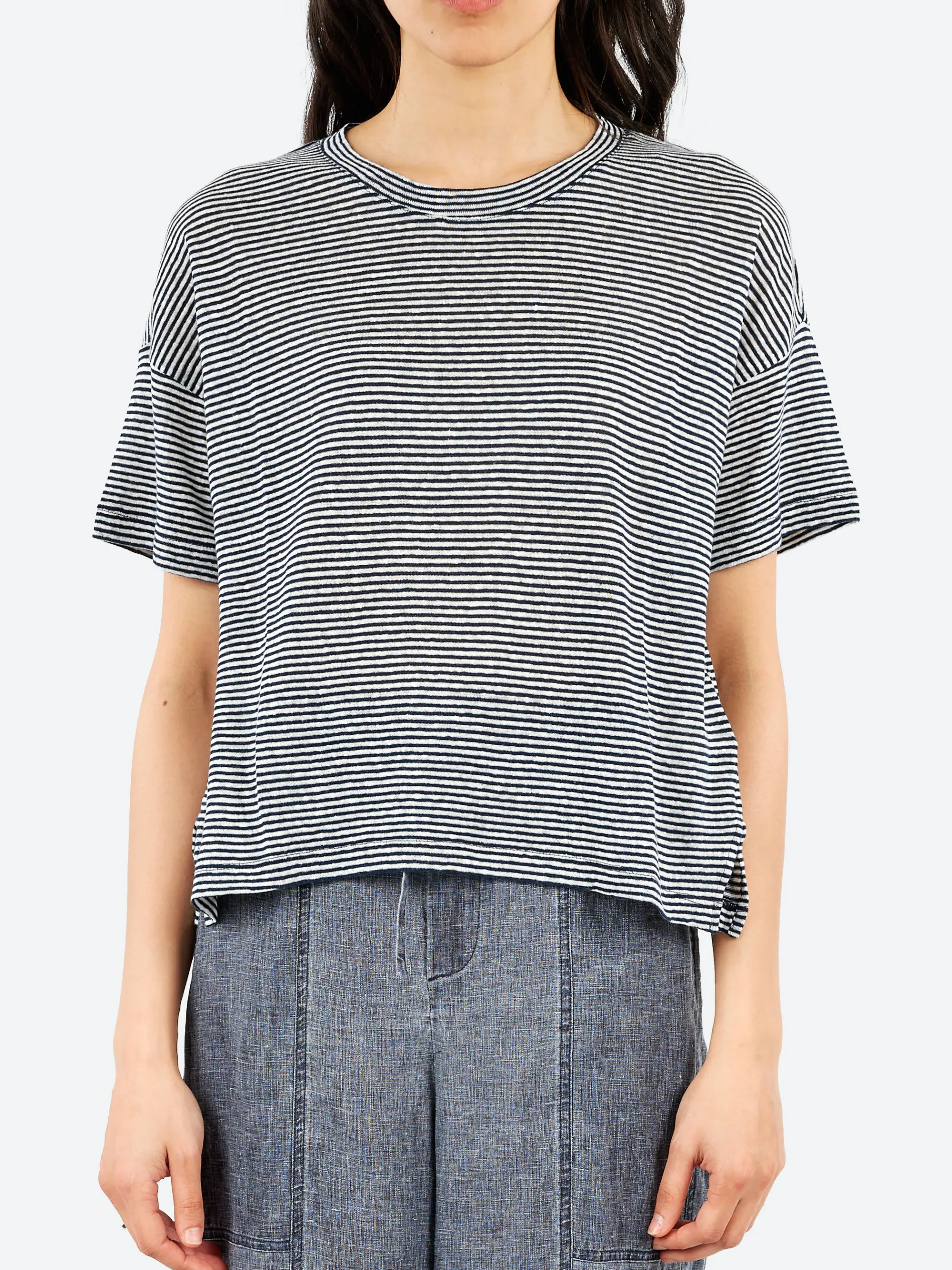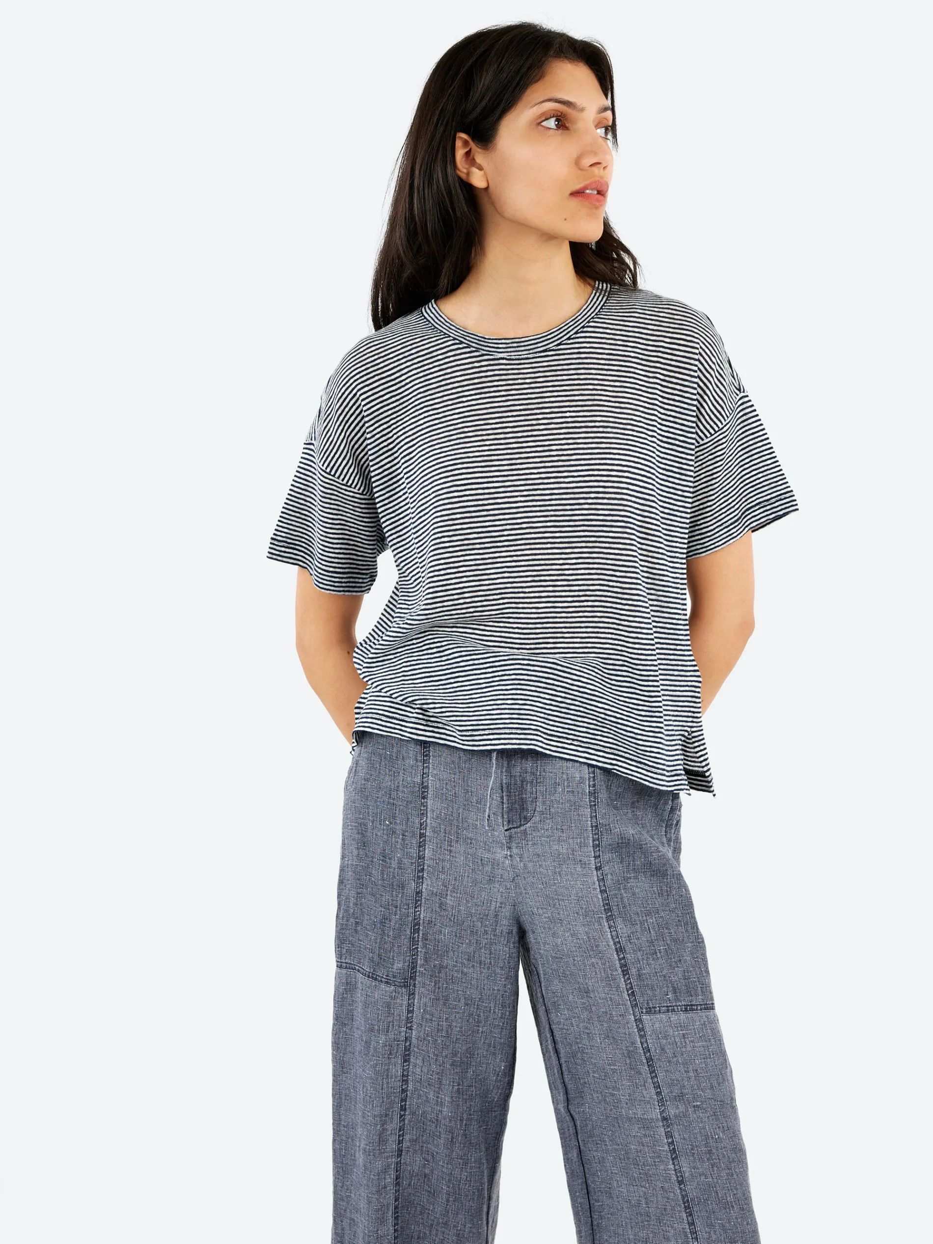 Lightweight and comfortable, the linen cotton jersey enhances the clean lines of the crewneck t-shirt, a must-have wardrobe staple for completing any seasonal look.