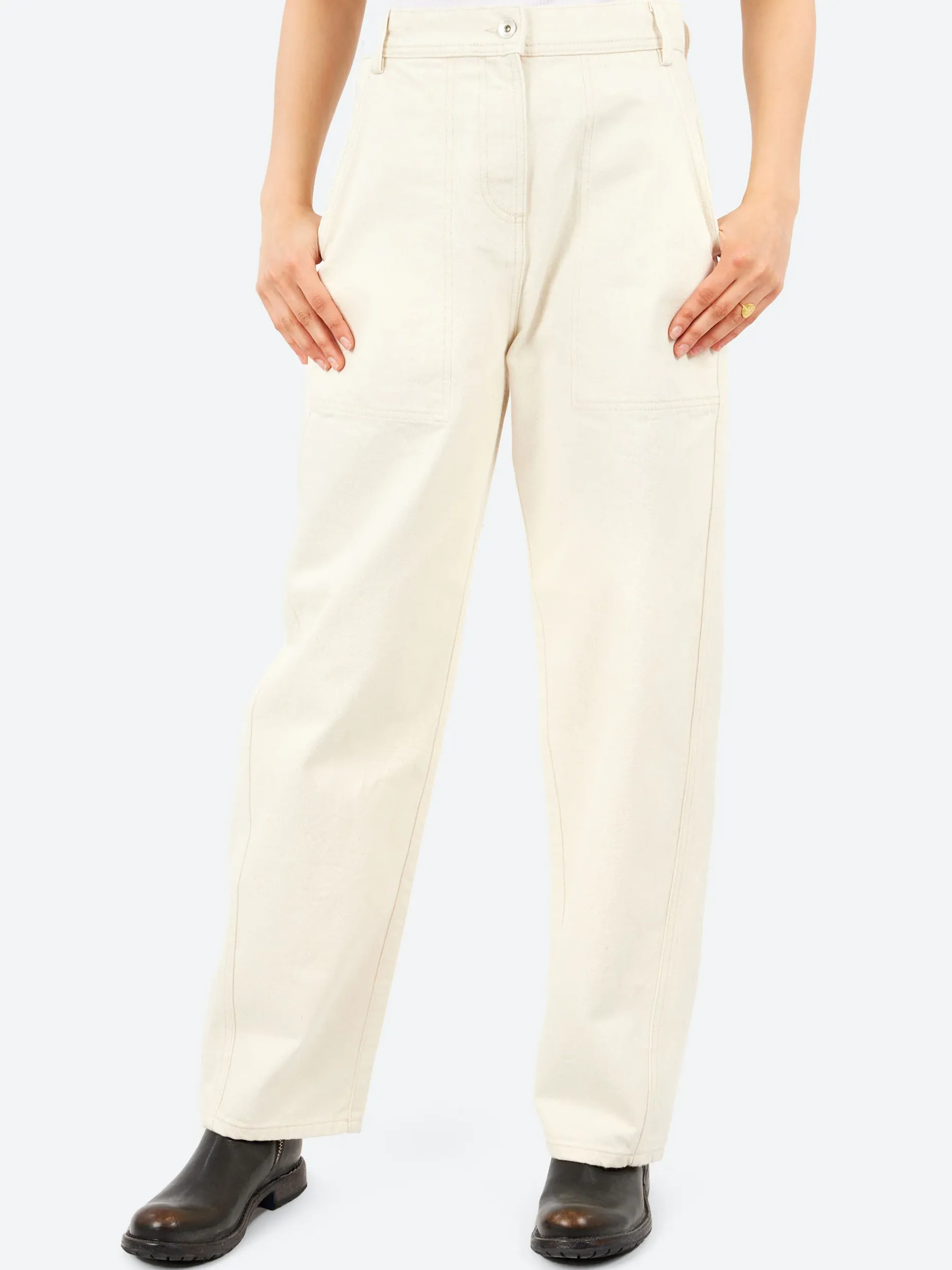 The stitching on the pockets and soft shapes bring movement to the garment, adding a sophisticated touch. Back flap pockets enhance the casual style with modern details. Made from 100% cotton bull denim, it offers a soft, lightweight feel against the skin.