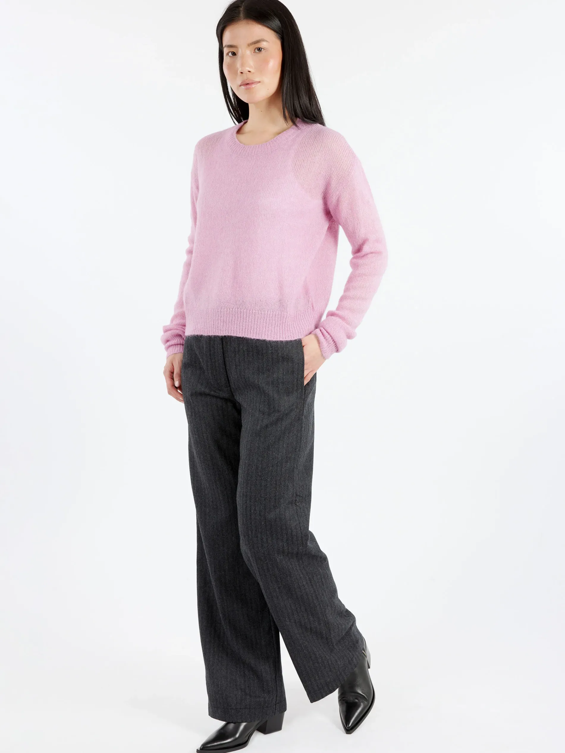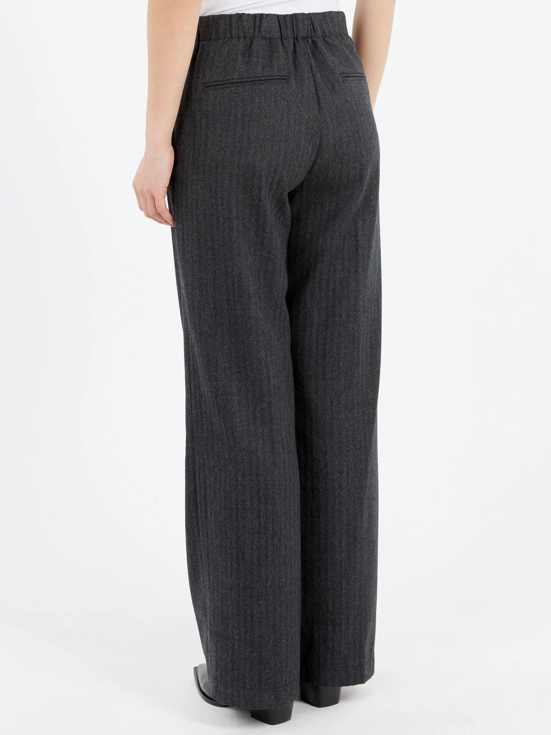 The fluid, lightweight herringbone texture of virgin wool comfort enhances the silhouette of the iconic Pomandère trousers. The herringbone pattern highlights the structured texture of the fine virgin wool fabric and complements the silhouette with a slightly wide hem that accentuates the garment’s lively attitude.