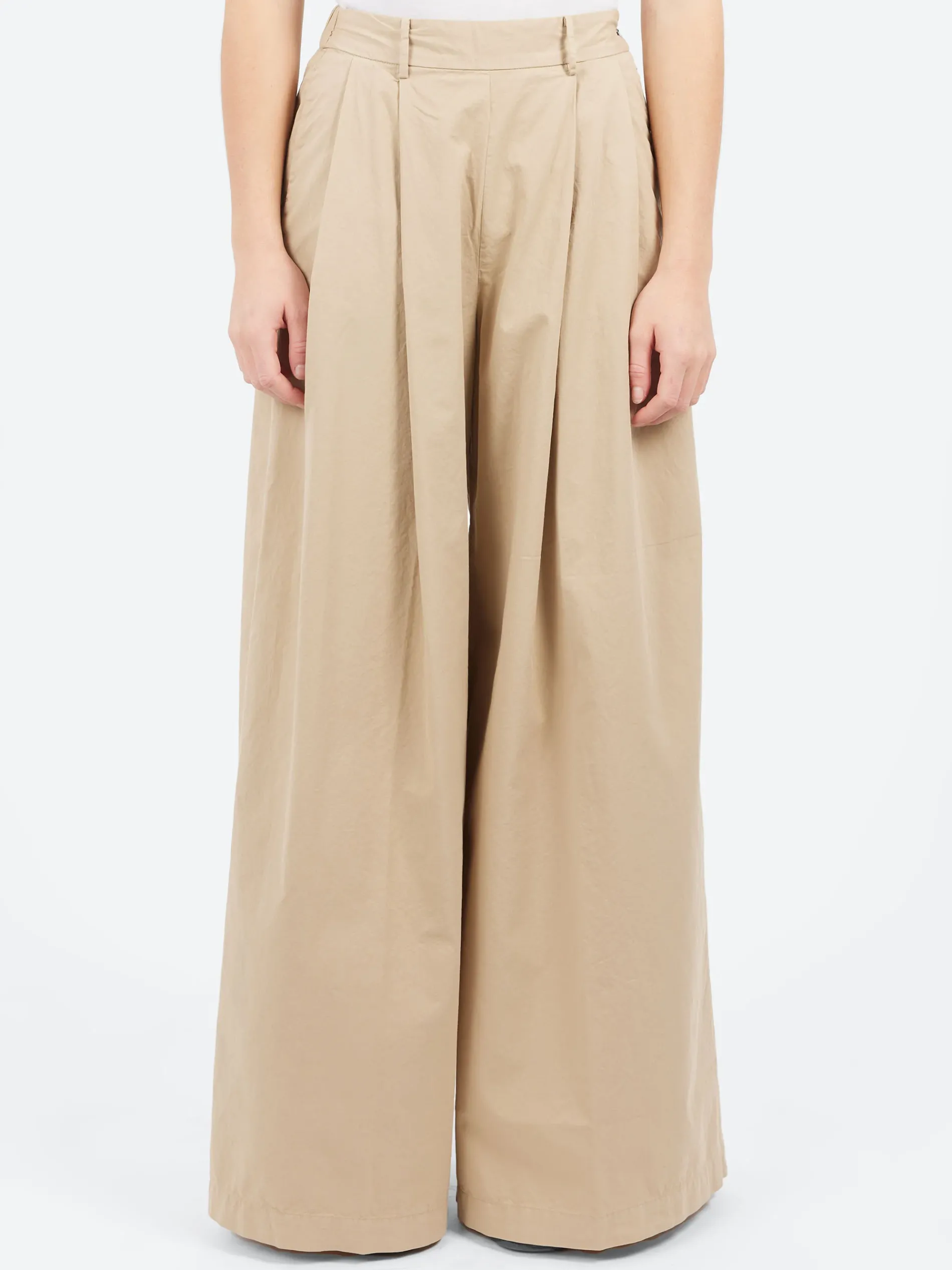 The wide and fluid volumes of the trousers enhance the lightweight, casual texture of the cotton gabardine, which spreads the season’s hue. The double pleats add slight volume to the straight and wide silhouette.
