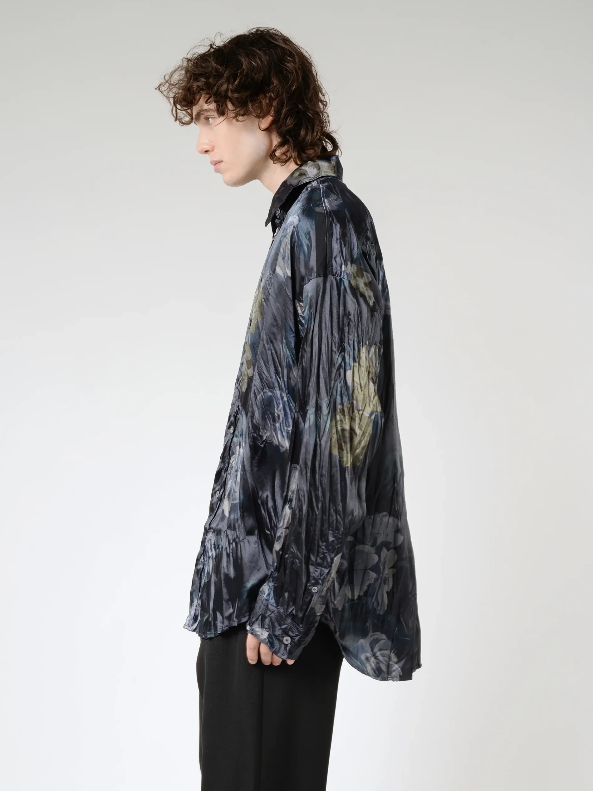 Acne Studios button-up shirt features an all-over seasonal flower print, crafted from satin fabric with a crinkled finish.