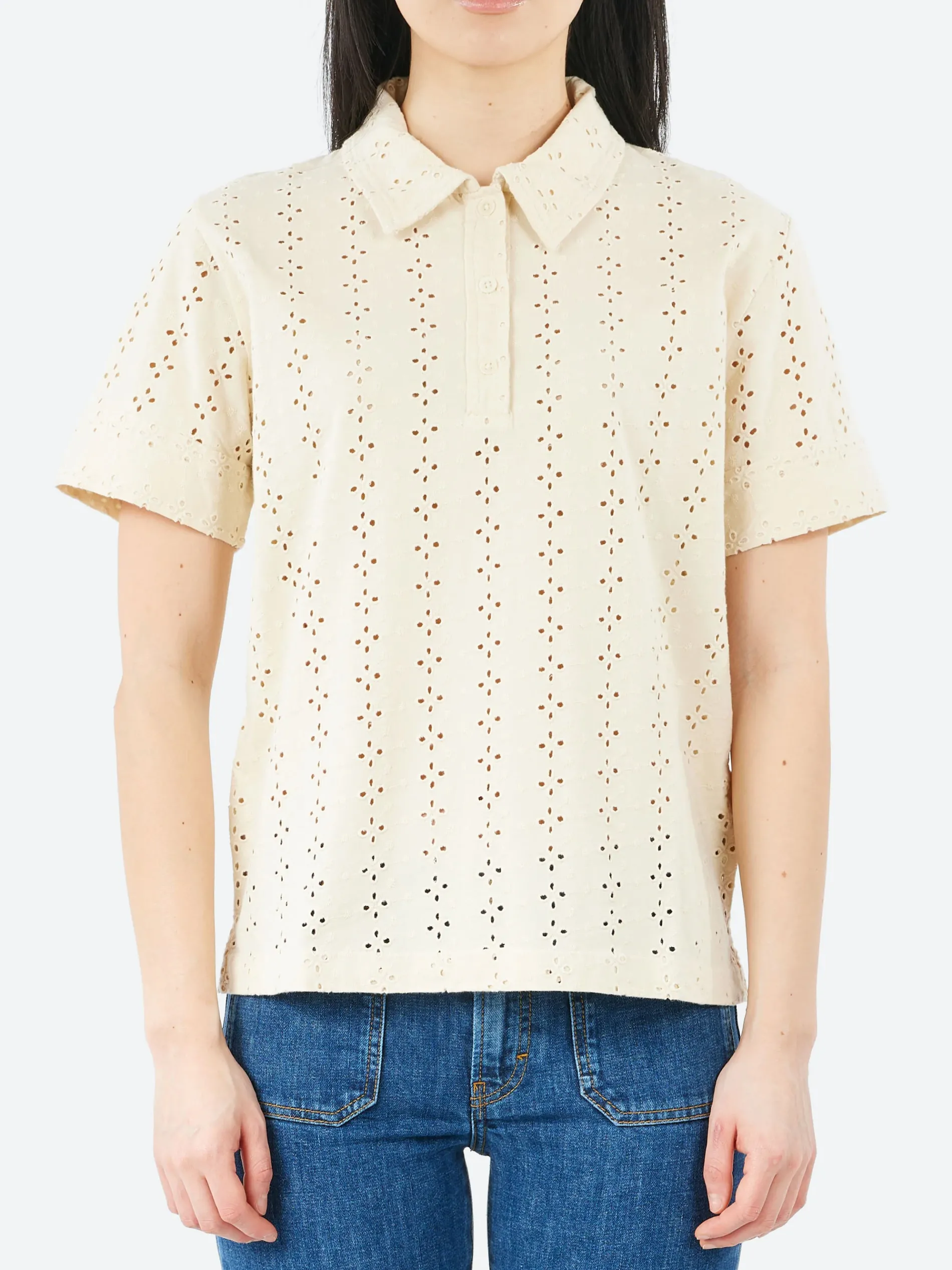 The Rachel Comey Brickett Polo is crafted from lightweight schiffli jersey, this short-sleeved top features an airy, eyelet-like design that adds a touch of texture and femininity. The relaxed fit and classic polo collar make it suitable for both casual and semi-formal occasions.