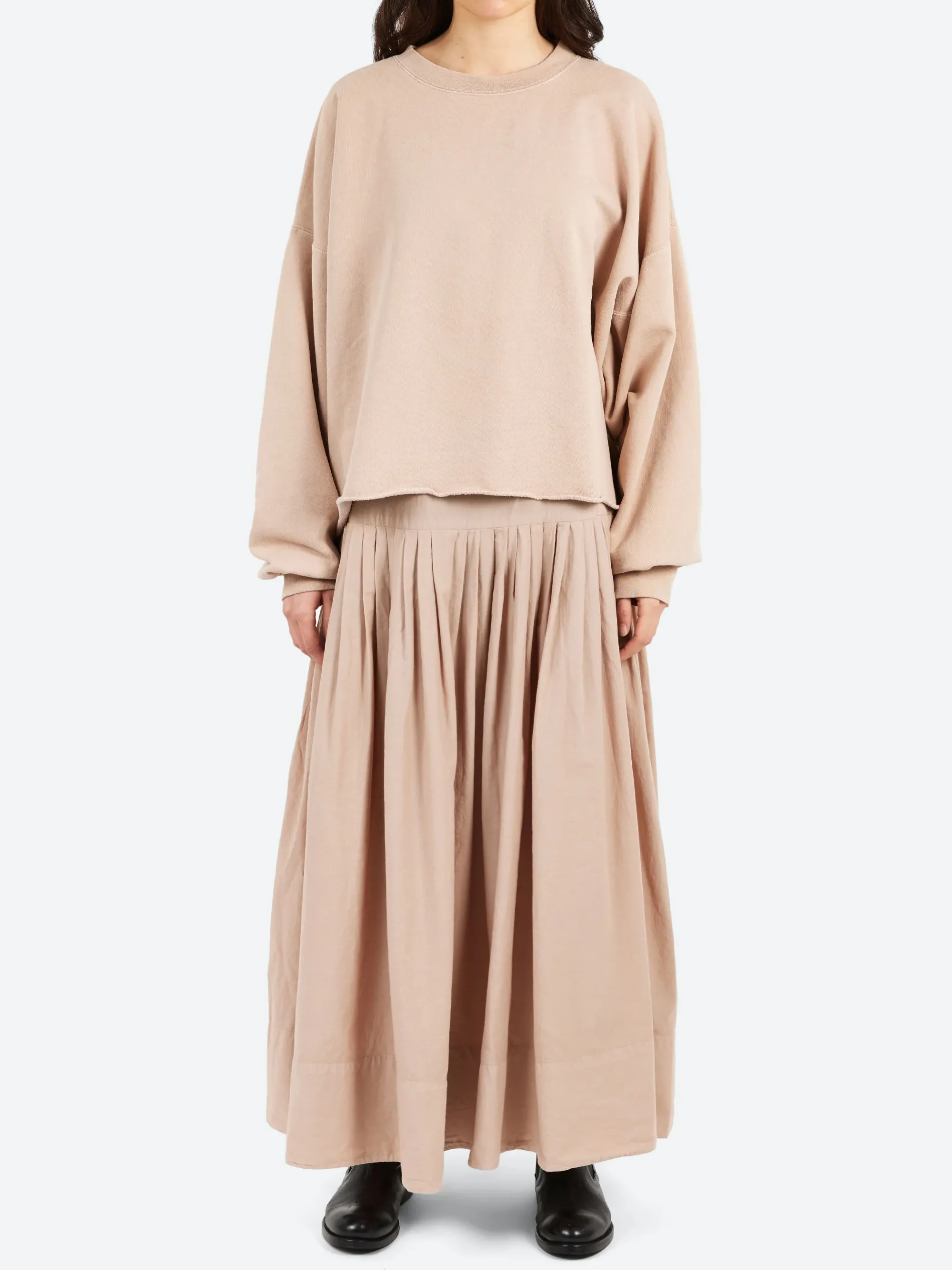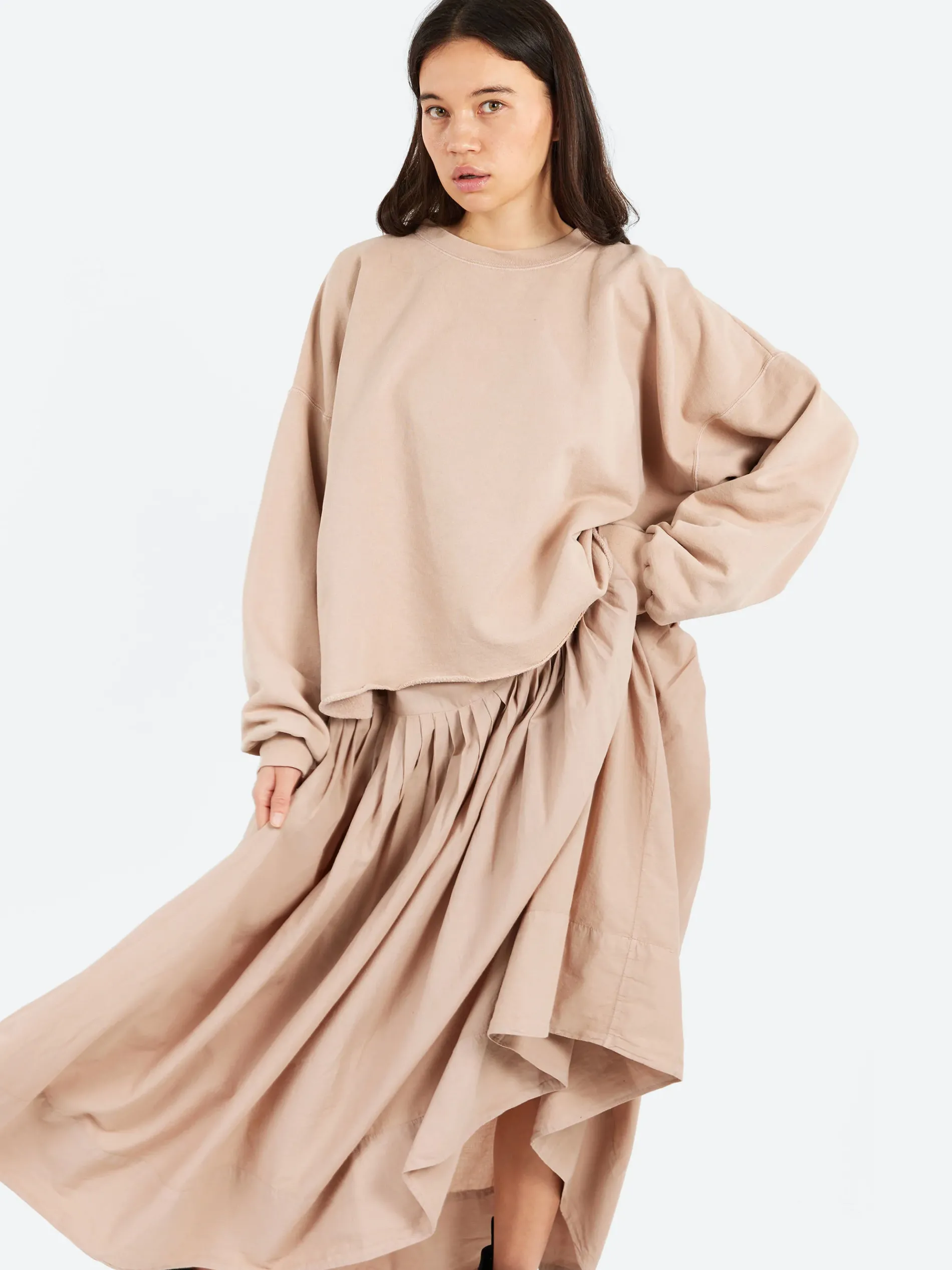 Casual dress featuring a relaxed sweatshirt top with a round neckline and dropped shoulders that’s cut from soft overdyed cotton. The attached cotton skirt has a loose, gathered design and falls to a midi length.