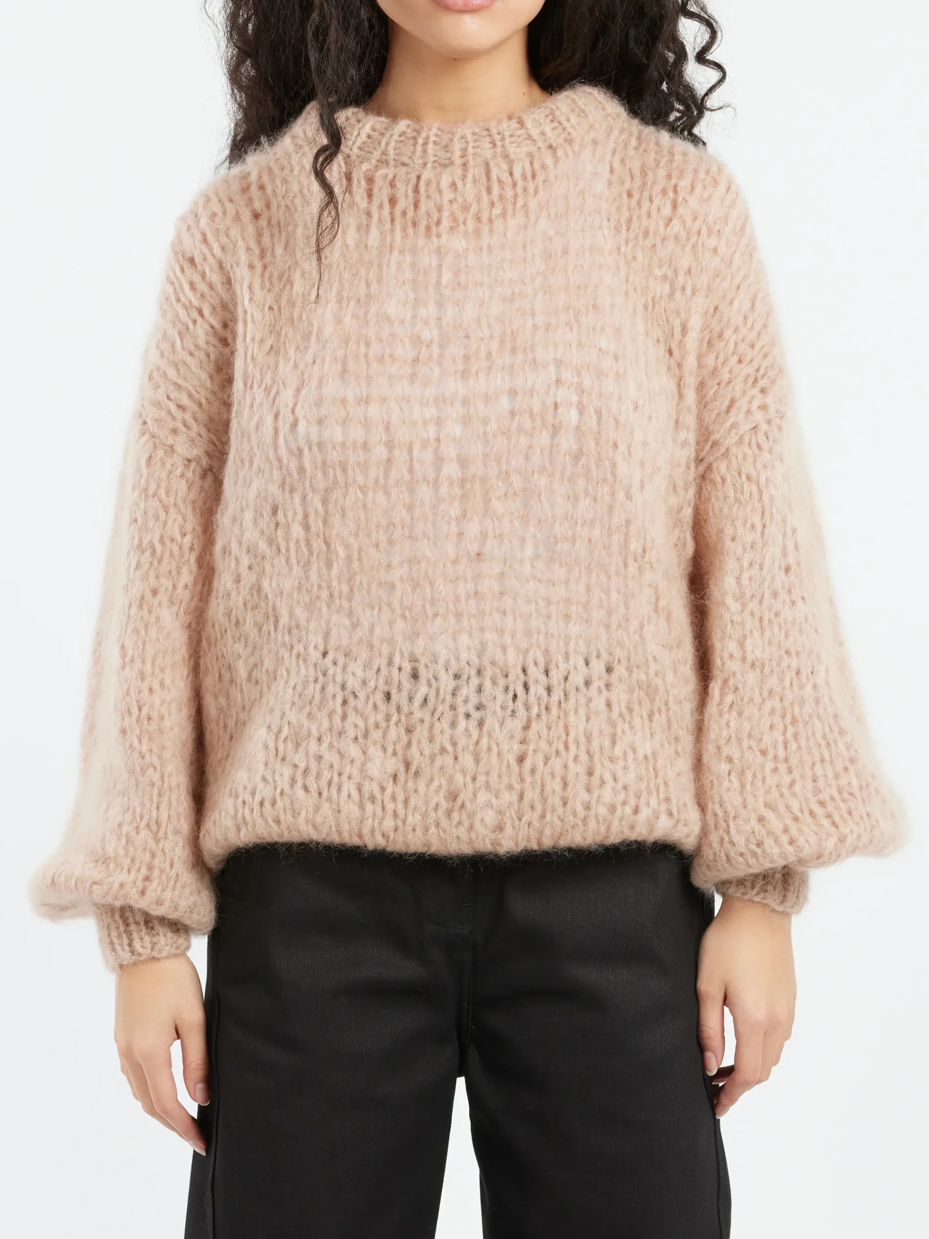 This sweater is made from a soft mohair-merino blend, providing a luxuriously textured and cozy feel.