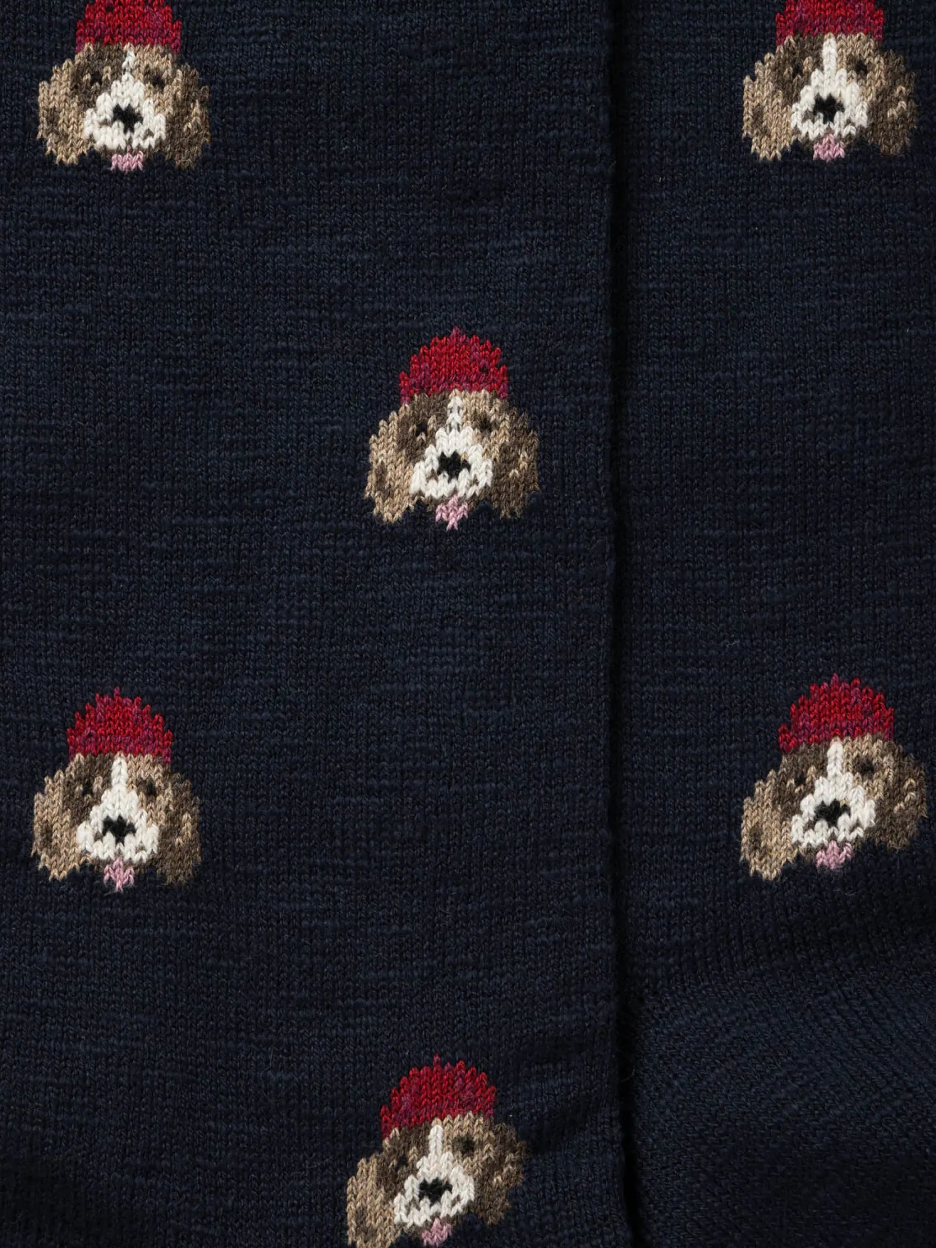 These socks are knitted with slub yarns, which gives them a workwear look. The all-over beagle jacquard pattern adds a playful touch.