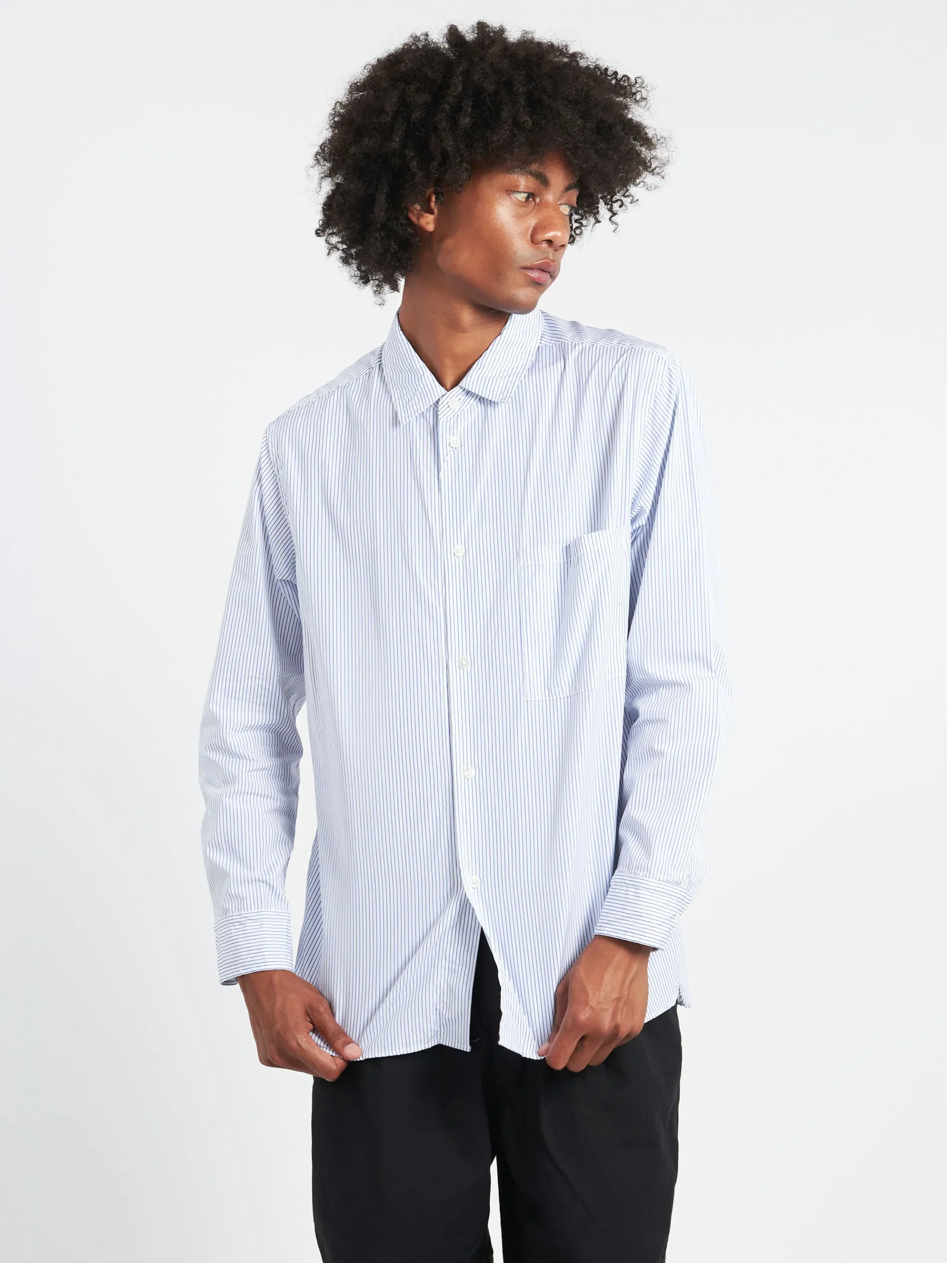 A basic regular collar shirt that is an essential part of your wardrobe. Made with blue stripes from Thomas Mason, a long-established manufacturer founded in 1796. High density weaving with fine thread count creates a glossy, luxurious feel.