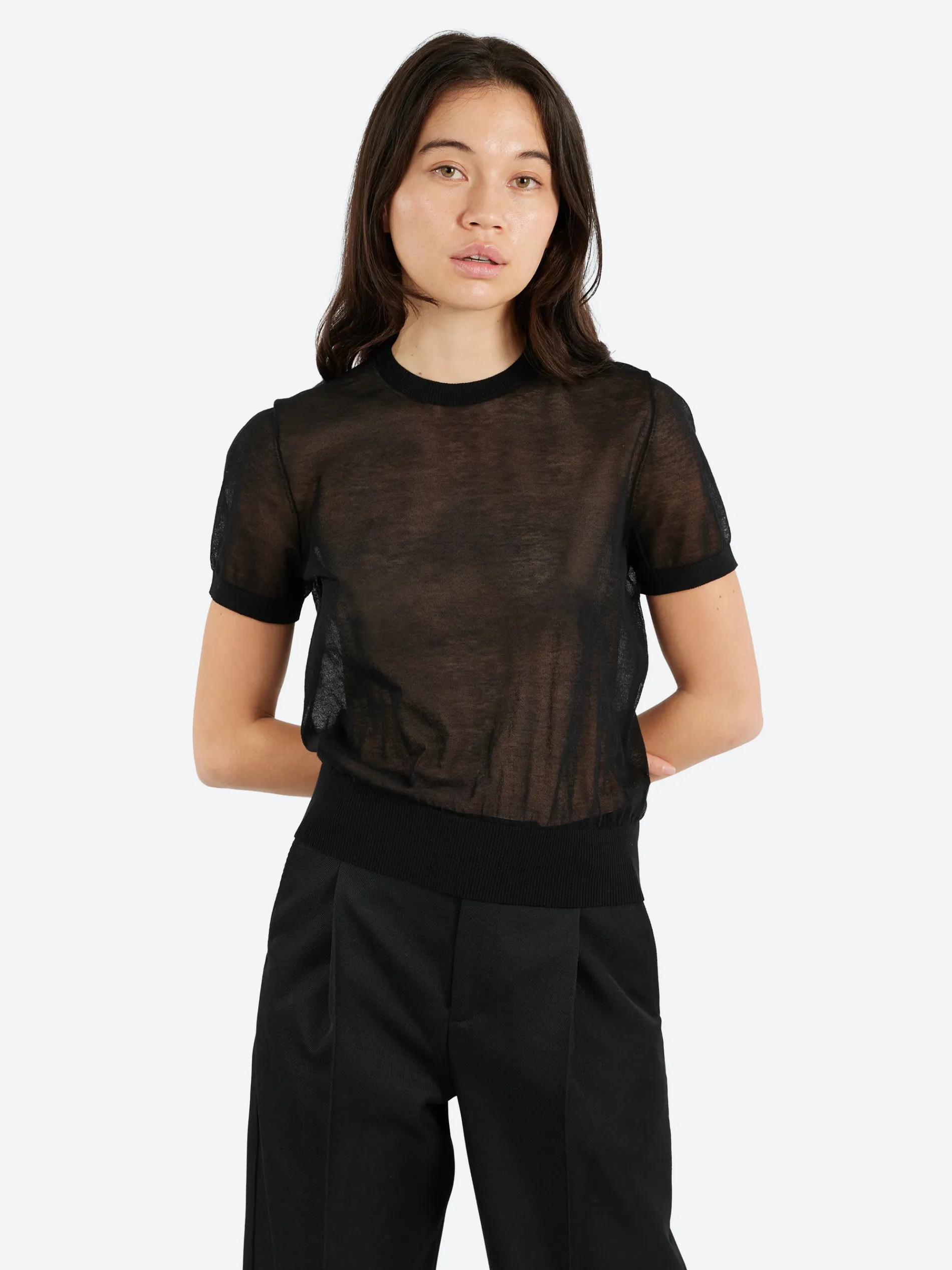 Soeur Dua features a straight cut with a tapered hem, short sleeves, and a round collar. Made from a sheer cotton knit, it offers a light, breathable feel with a subtle translucent texture.