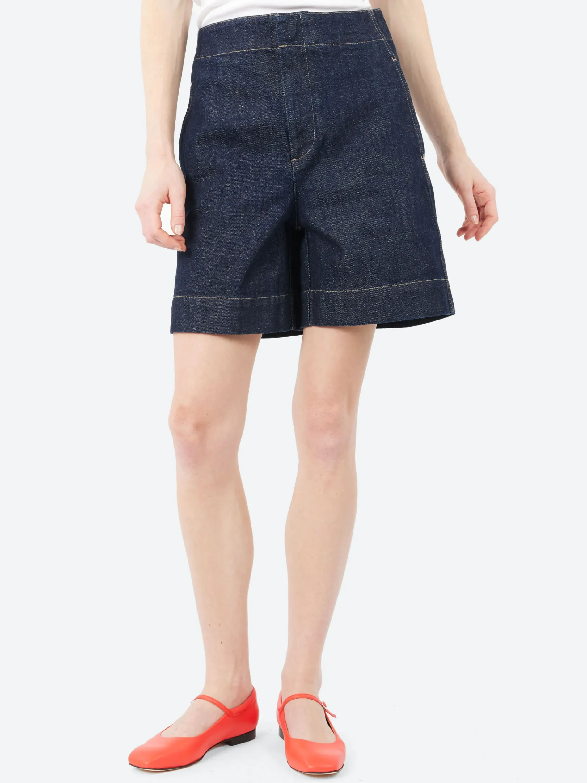 The Emile Shorts are wide raw denim shorts with a loose fit, offering a relaxed and comfortable style. They have a mid-thigh length, perfect for warm weather. Designed with two side pockets and a back ticket pocket for added functionality, they also include contrasting topstitching details that give them a distinctive, modern edge.