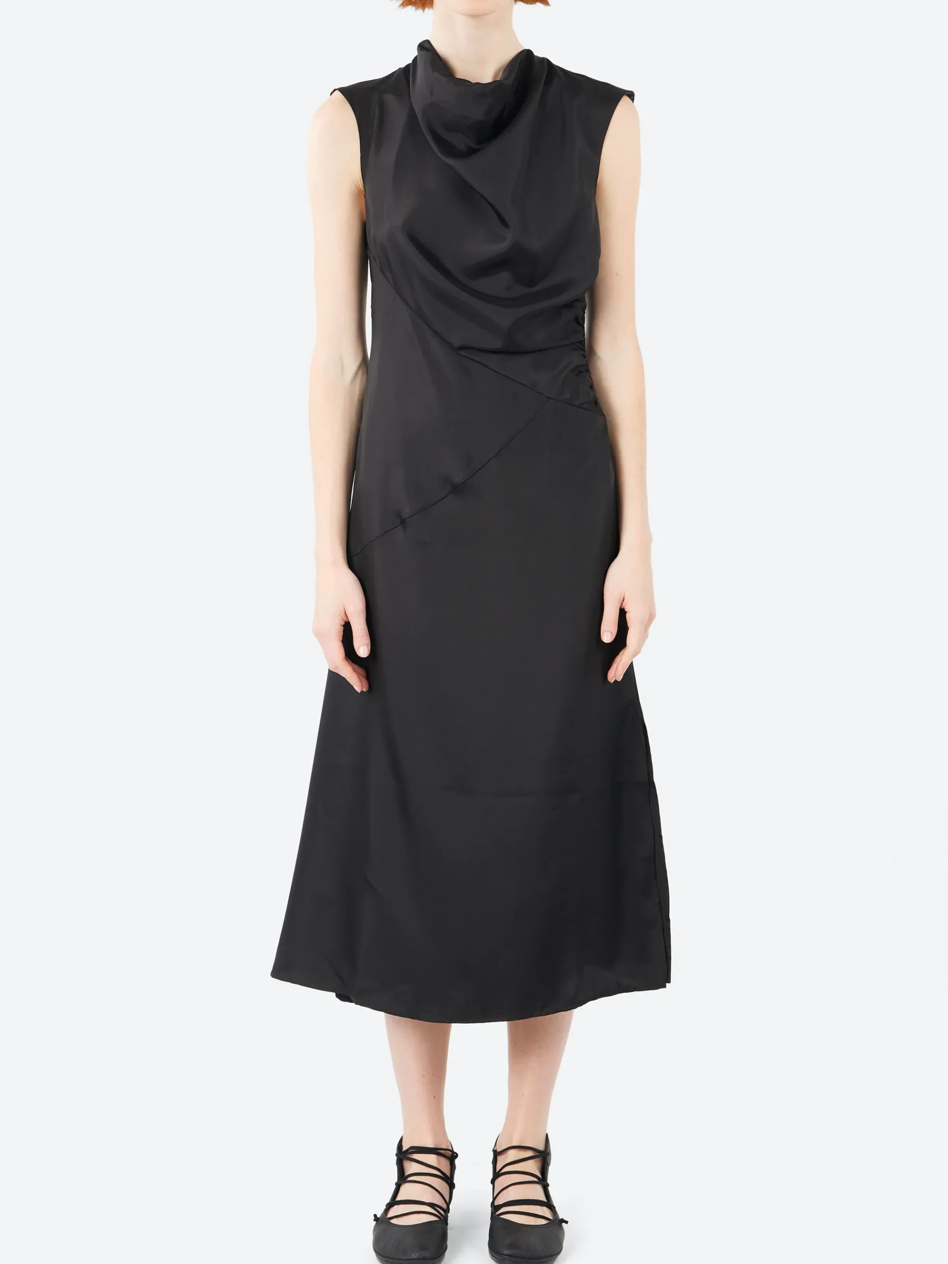 The Eugenie Dress is a draped dress made from fluid black twill, offering a fitted cut that enhances the silhouette. It features an invisible zip opening with a small hook for a seamless look. The dress is designed with a side slit for added movement and elegance, along with draped detailing that adds texture and sophistication to the overall design.