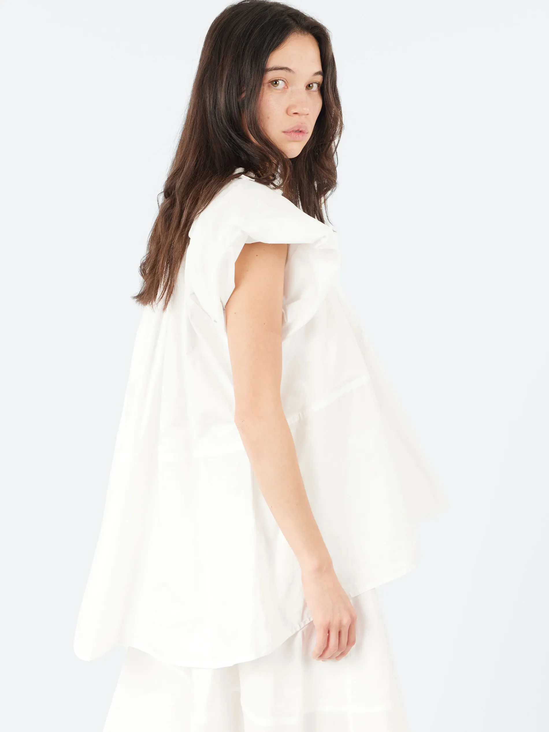 The Sofie D’Hoore Barcelona Top is a cotton top featuring a gathered neckline and puffed sleeves. It offers a little extra length at the back for a flattering silhouette. The sleeves can be rolled up and fastened at the shoulder, allowing for a versatile style that can be customized to your look.