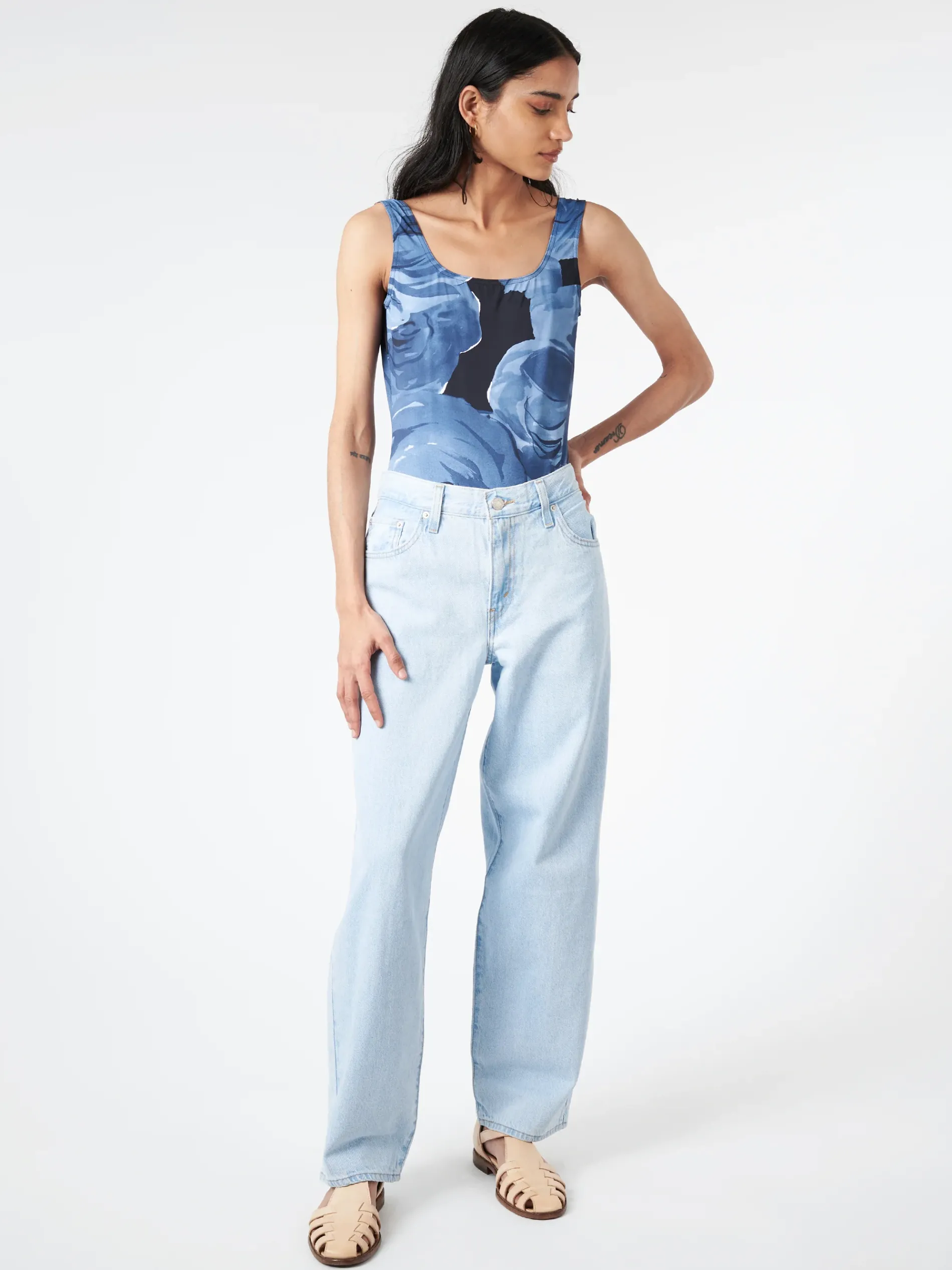 The Sofie D’Hoore one-piece swimsuit features a scoop neckline, wide straps, and a deep open back.
