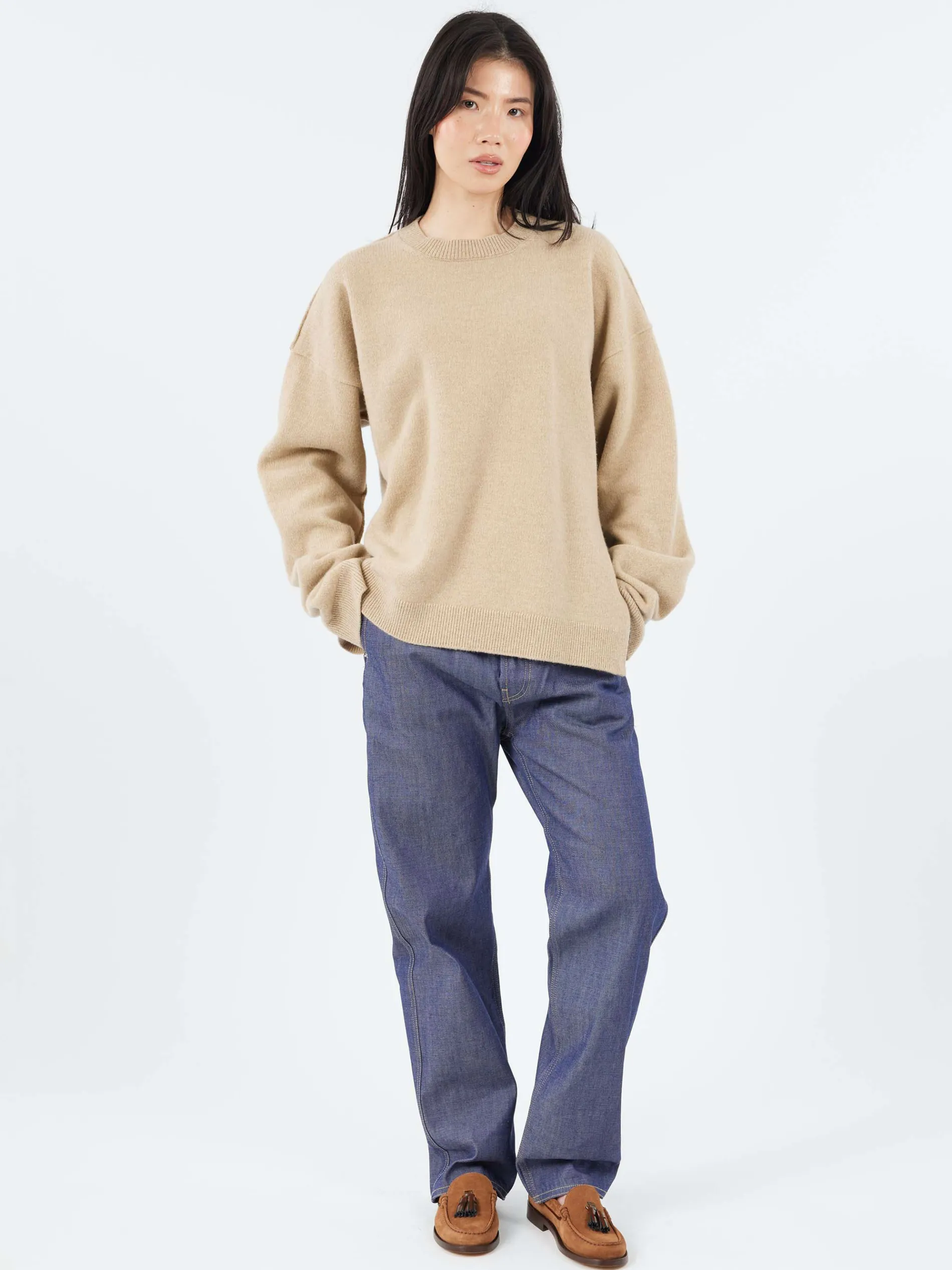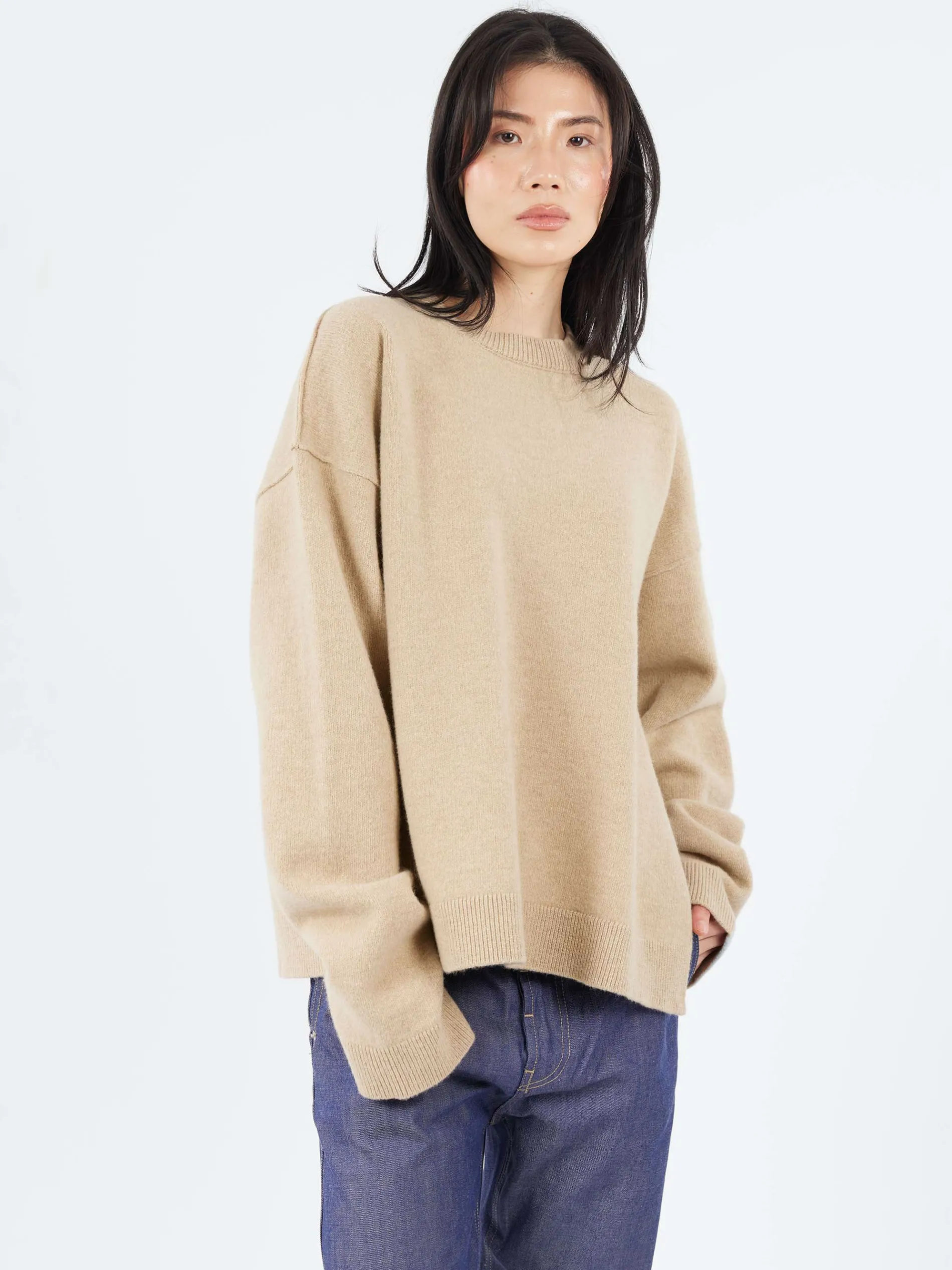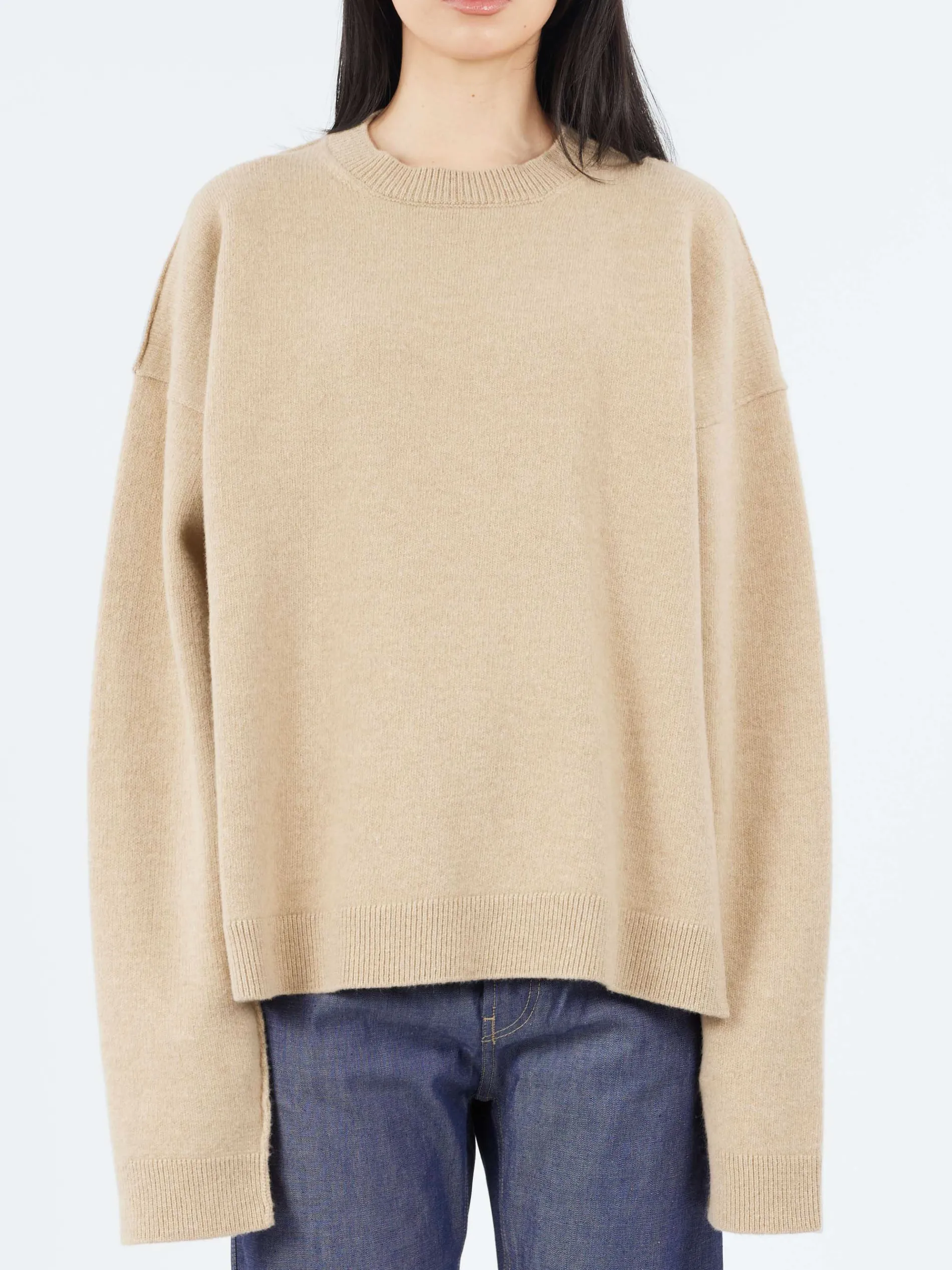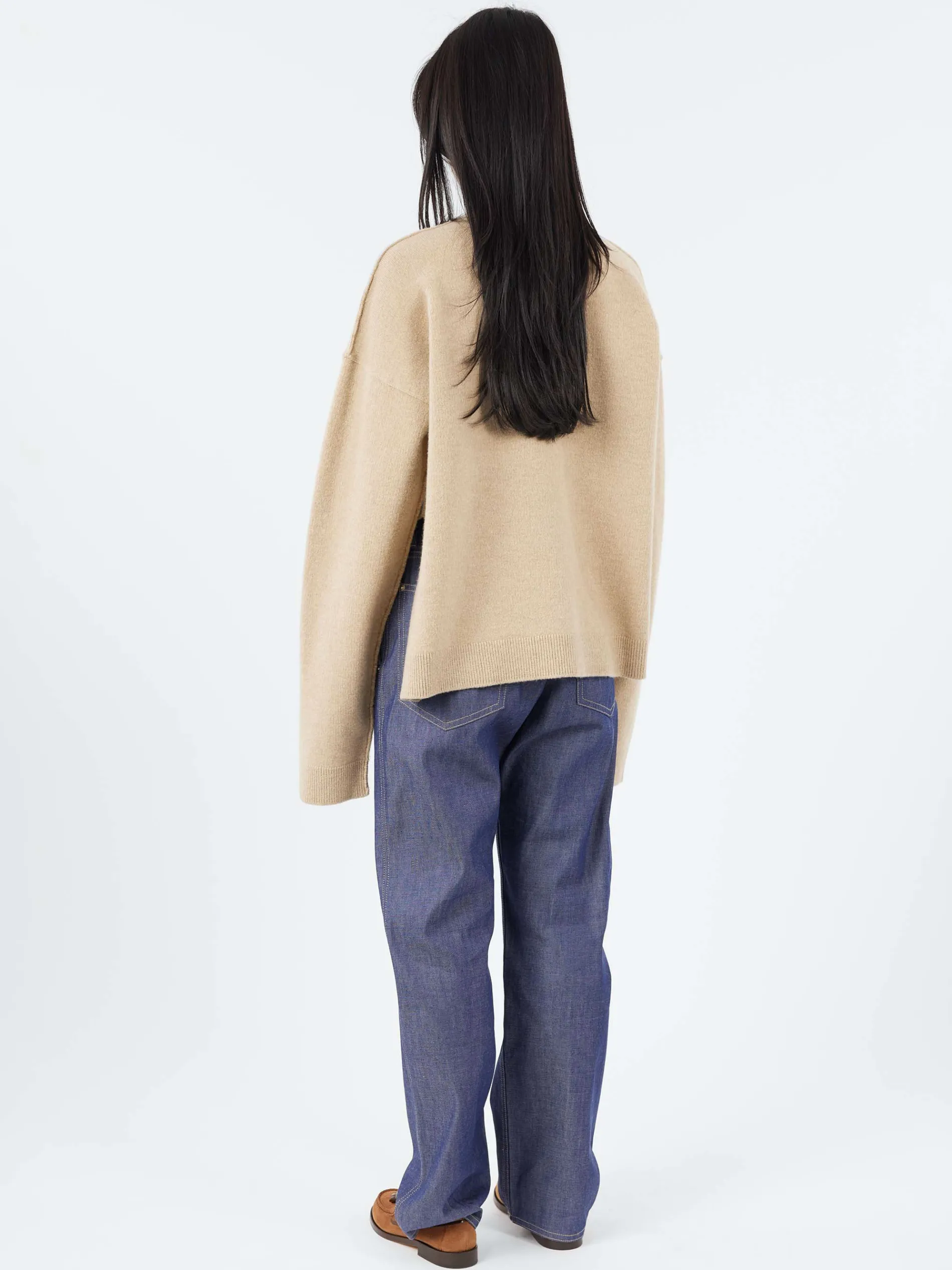 This Sofie D’Hoore knit offers a relaxed, oversized fit with dropped shoulders and a slightly high neckline, creating a comfortable yet stylish silhouette. The design features a side slit, adding a design feature to an otherwise minimalistic piece. Its clean lines make it a versatile and sophisticated choice for layering or wearing on its own.